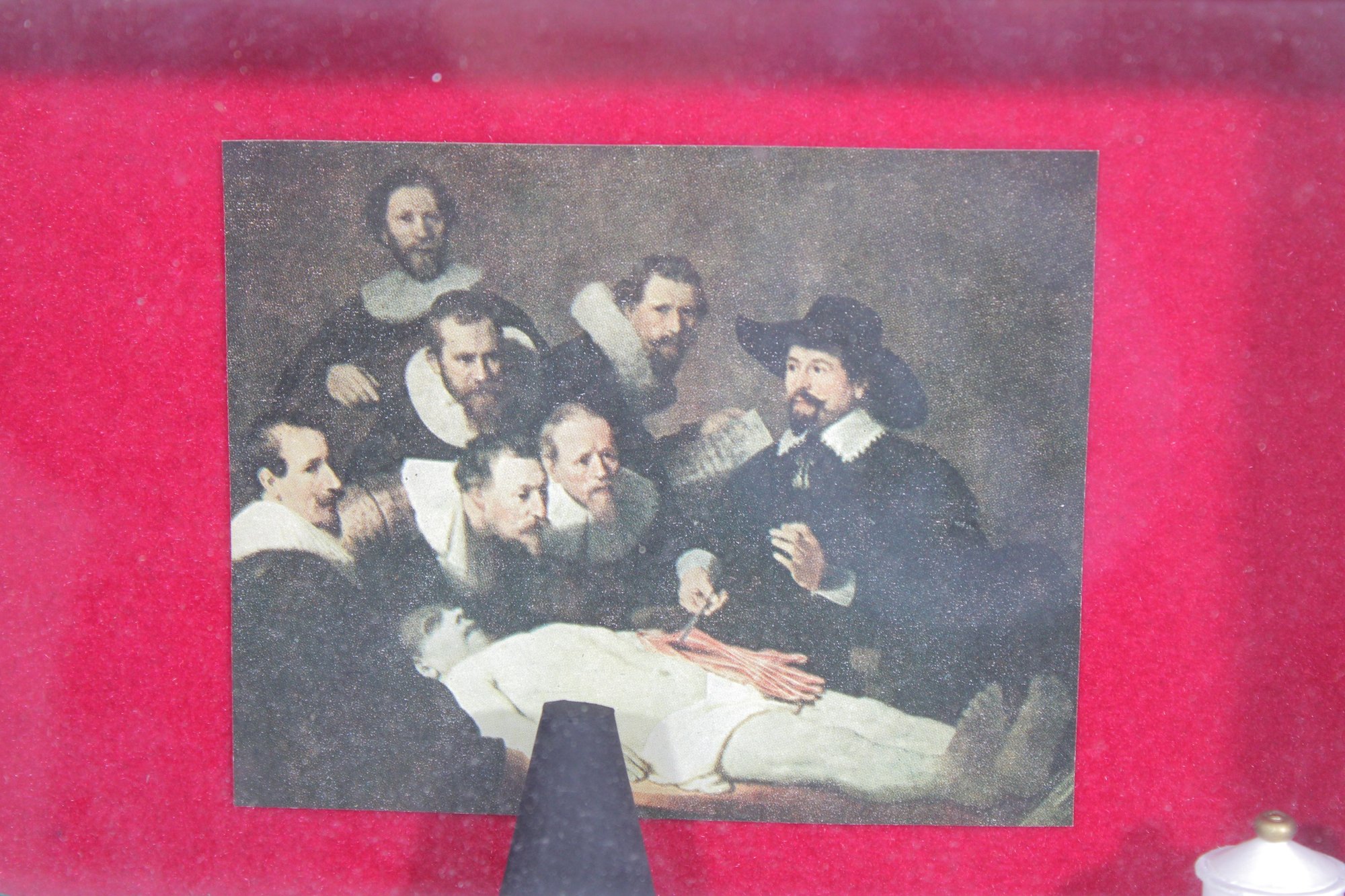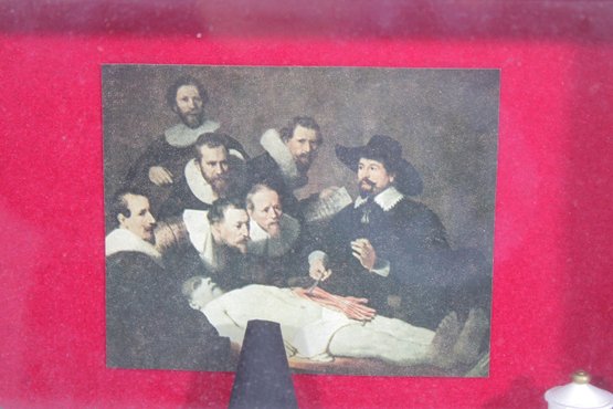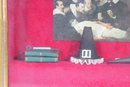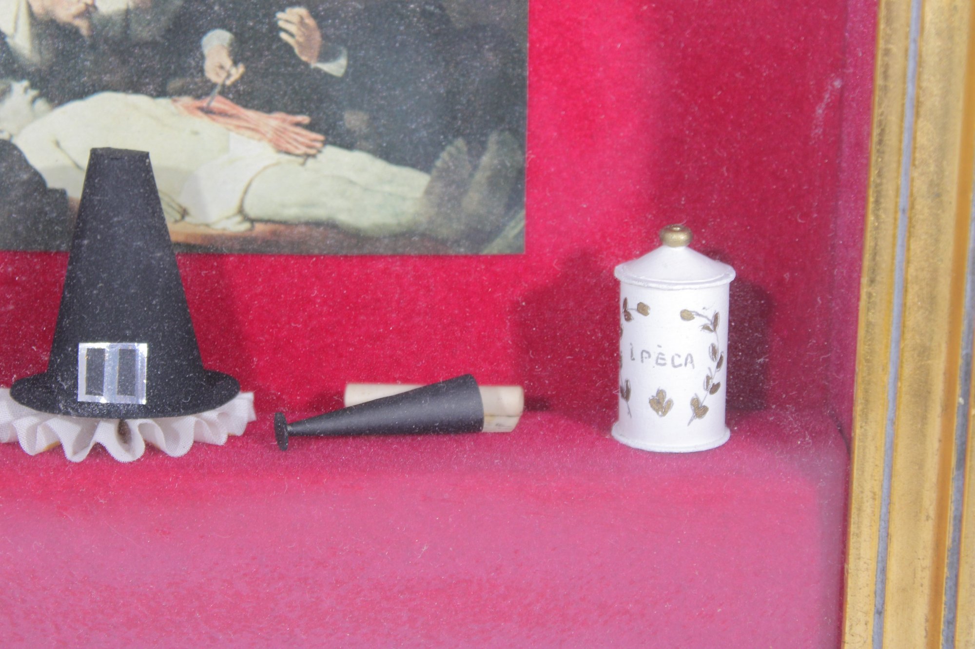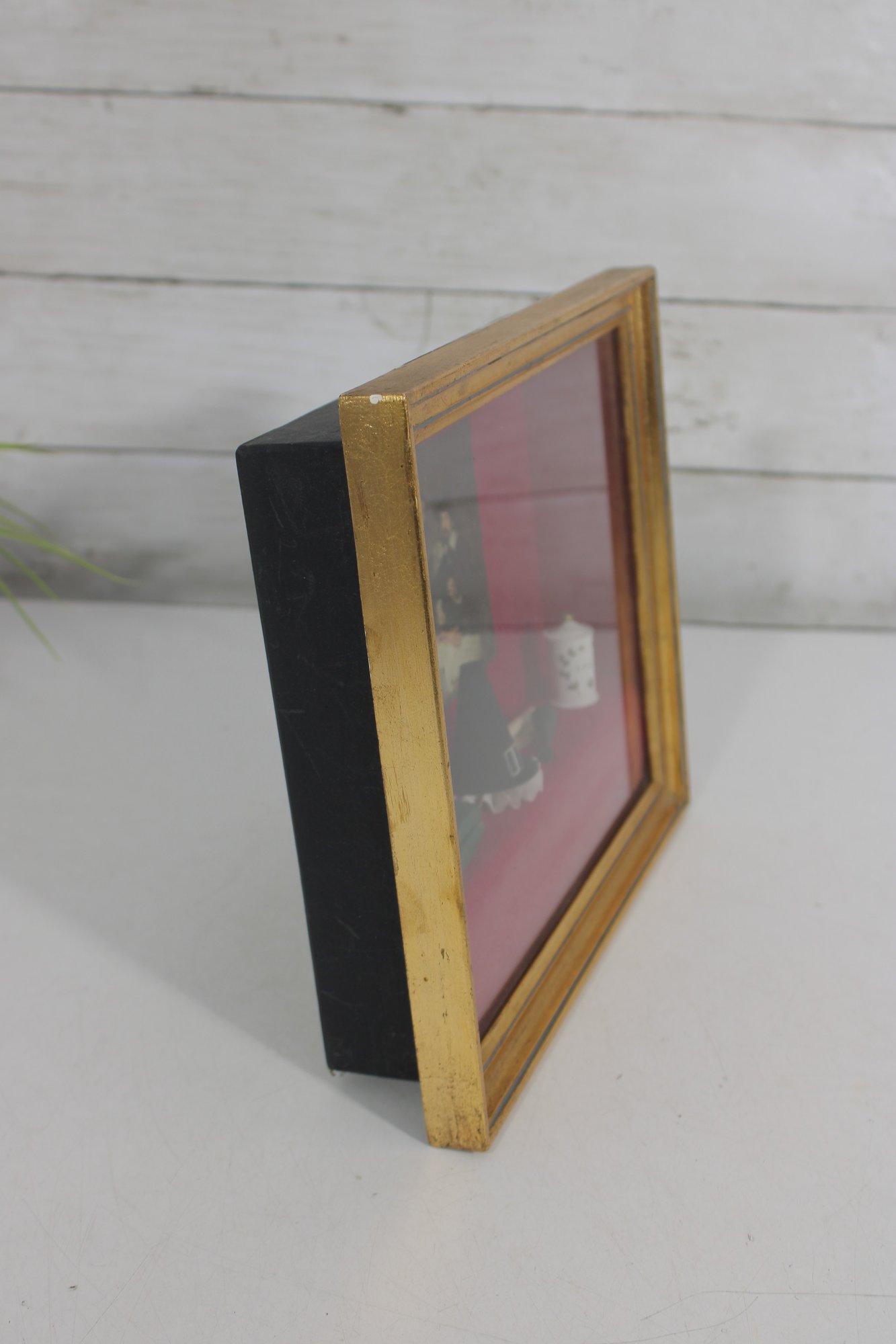 vintage framed shadow box diorama depicting a charming Pilgrim / early colonial Thanksgiving-themed scene. The display features a red fabric background with a reproduction image of a colonial gathering and several miniature objects arranged in front.