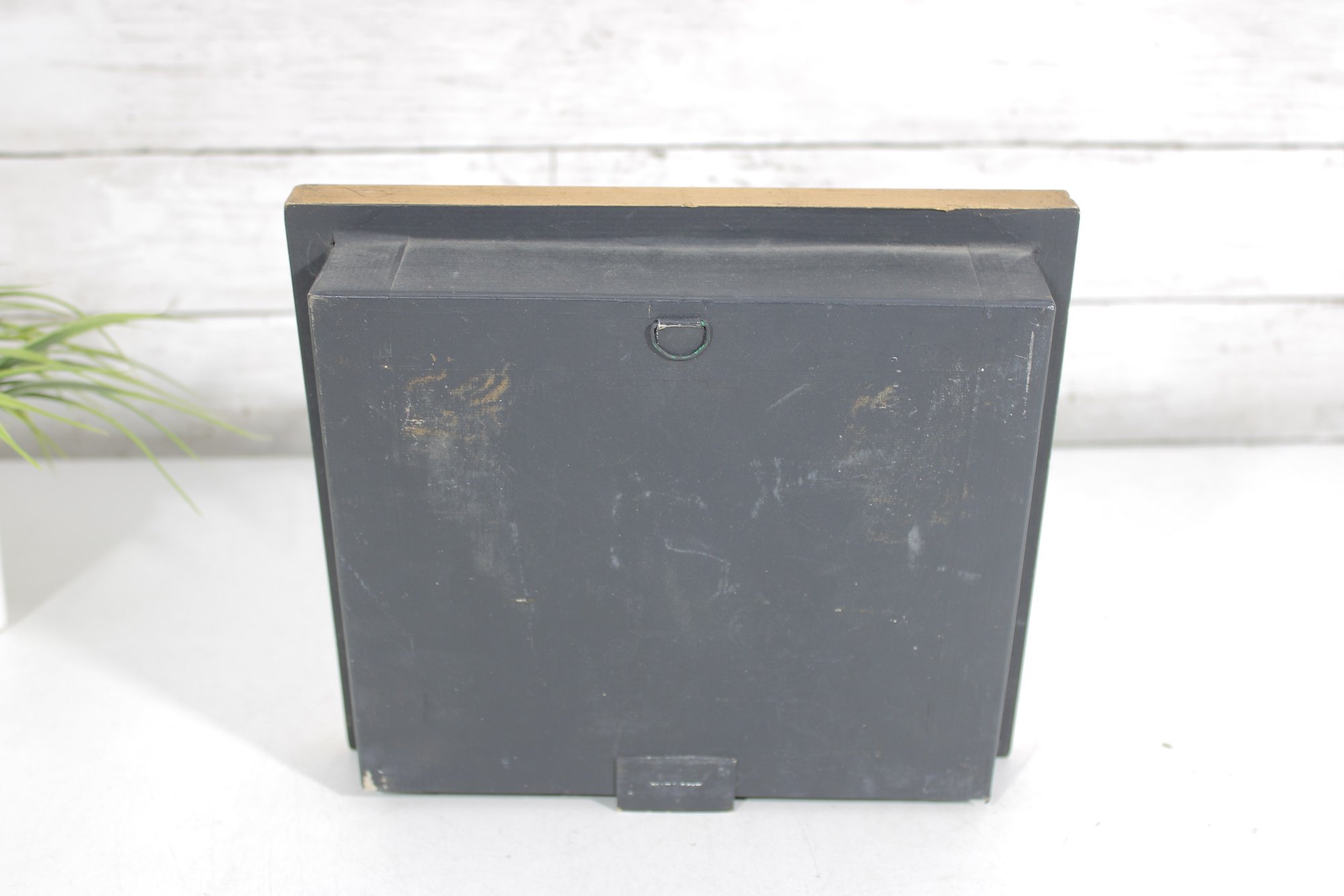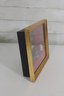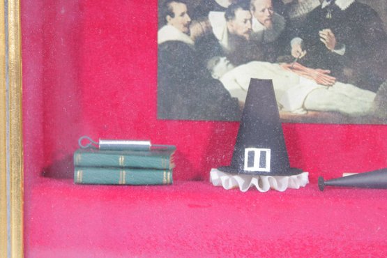 The scene includes small themed items such as a Pilgrim hat, miniature books, powder horn, and a small container, all arranged within the shadow box to create a decorative historical display. The piece is housed in a gold-tone frame with glass front and a deep shadow box backing.