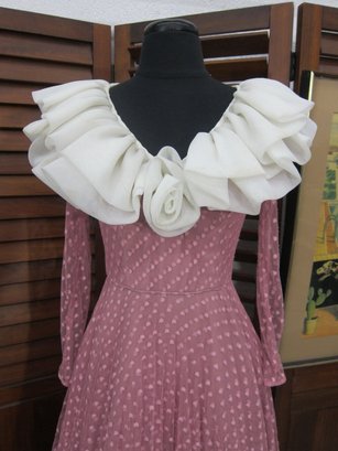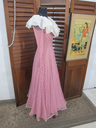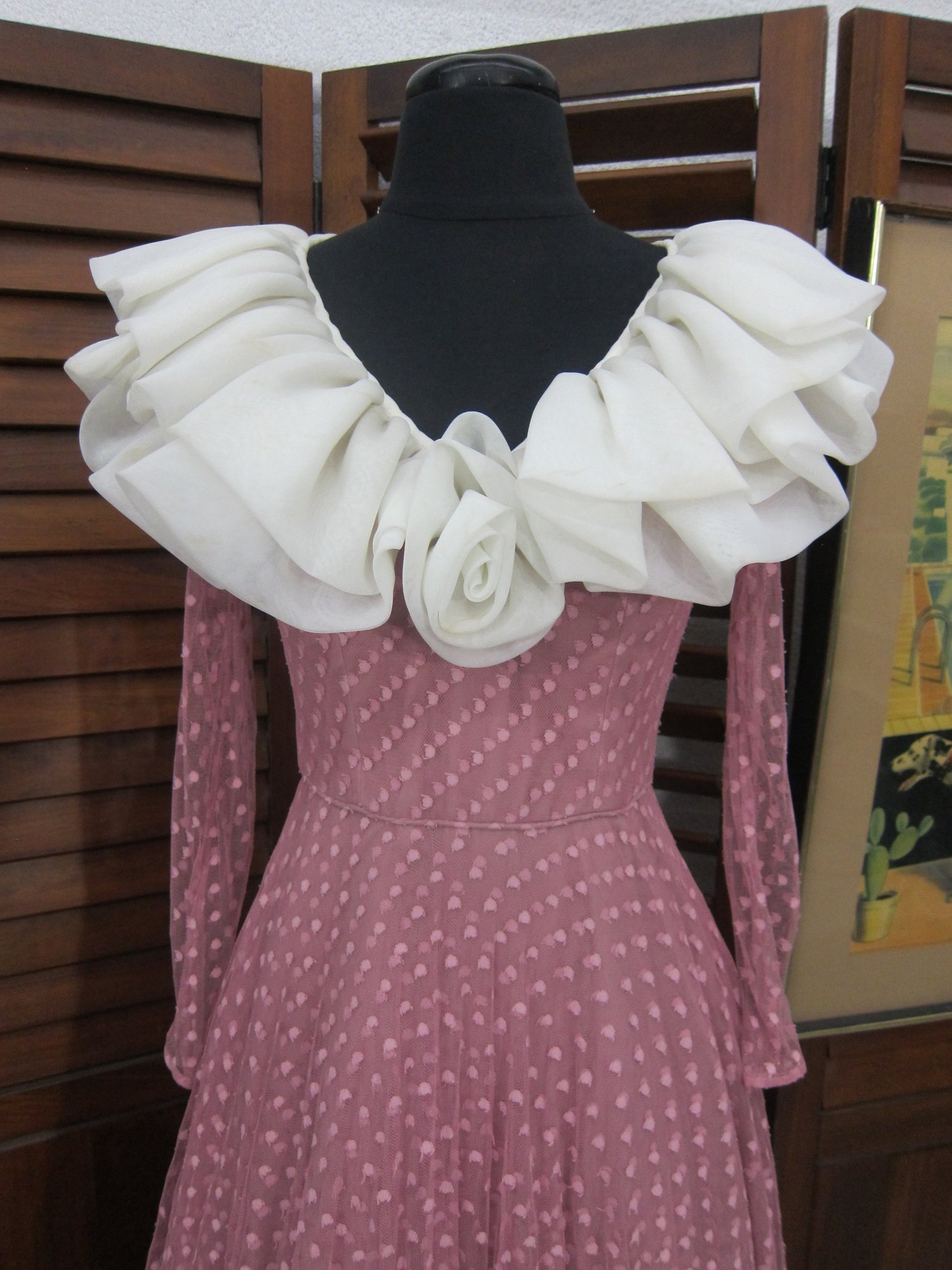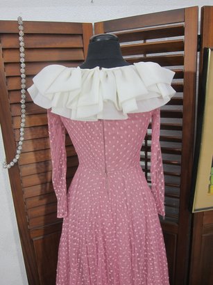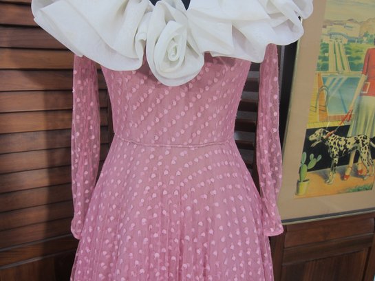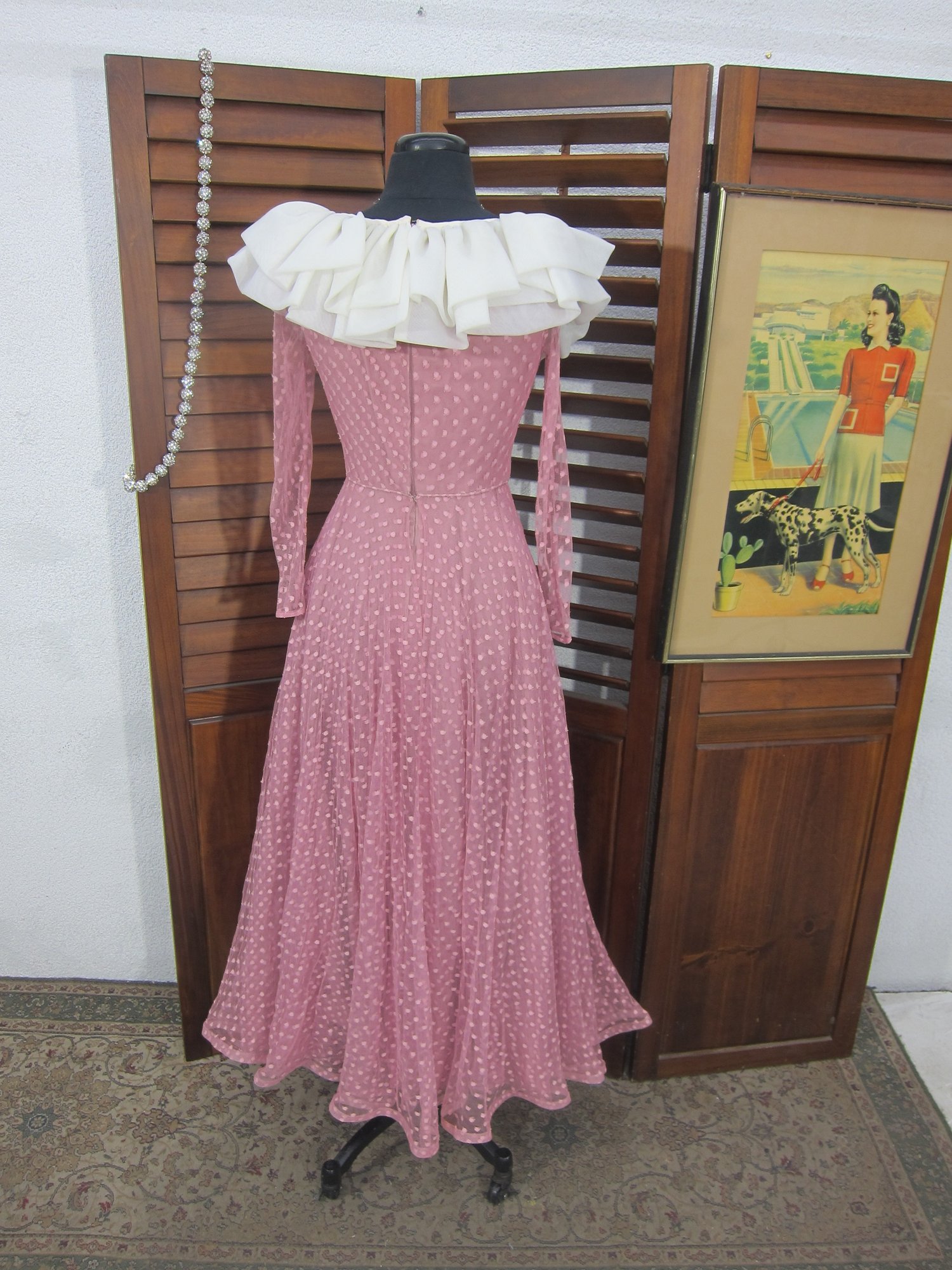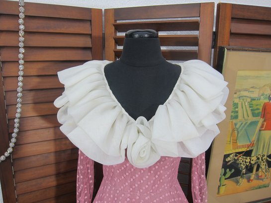 Romantic vintage pink chiffon evening gown featuring an elegant polka-dot pattern and flowing full-length skirt. This stunning dress is highlighted by a dramatic oversized white ruffle collar with a soft rosette detail at the front, creating a timeless, couture-inspired look. Sheer long sleeves add grace and movement, while the fitted bodice flatters the silhouette.