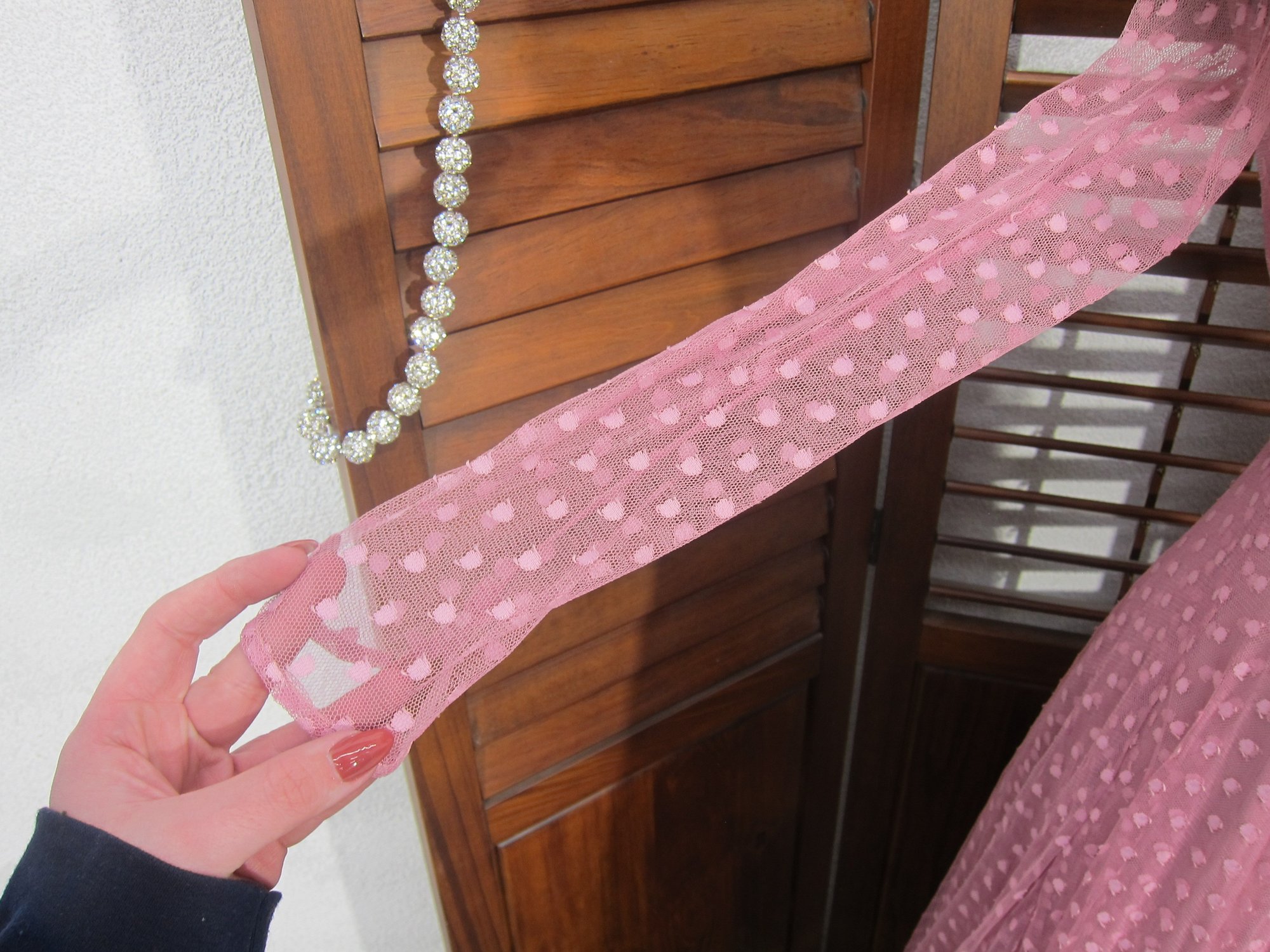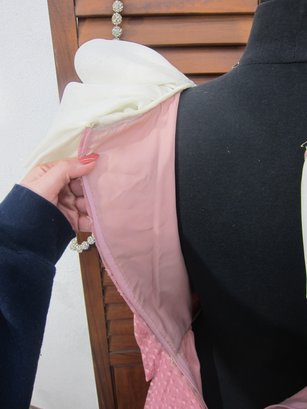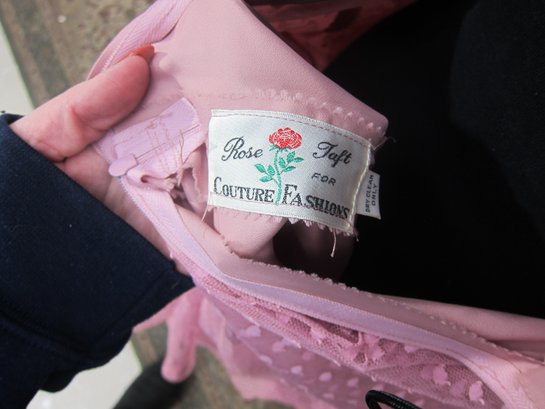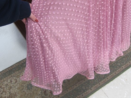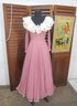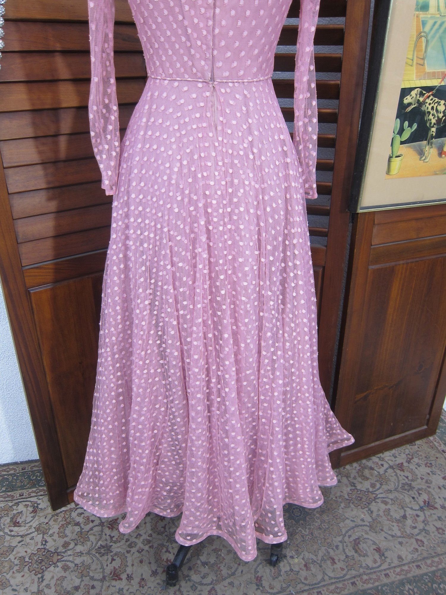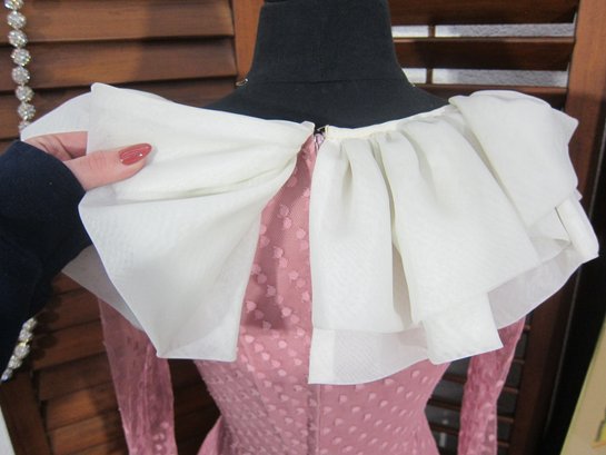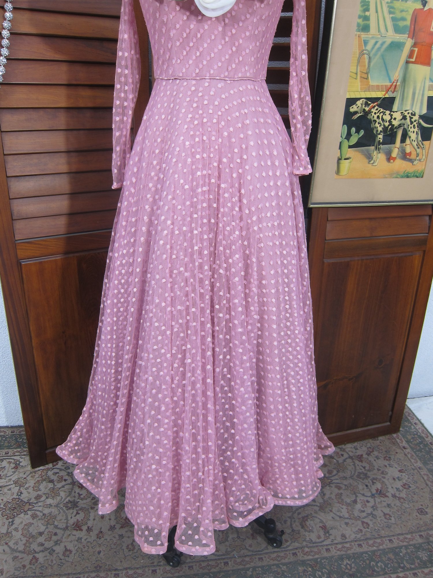 Romantic vintage pink chiffon evening gown featuring an elegant polka-dot pattern and flowing full-length skirt. This stunning dress is highlighted by a dramatic oversized white ruffle collar with a soft rosette detail at the front, creating a timeless, couture-inspired look. Sheer long sleeves add grace and movement, while the fitted bodice flatters the silhouette.