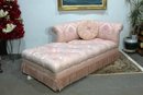 Bring elegance and comfort to your space with this beautiful vintage tufted chaise lounge in soft pink. Featuring a rolled backrest, tufted upholstery, and a charming fringe skirt, this piece is both stylish and inviting. Includes a matching round accent pillow for added flair.