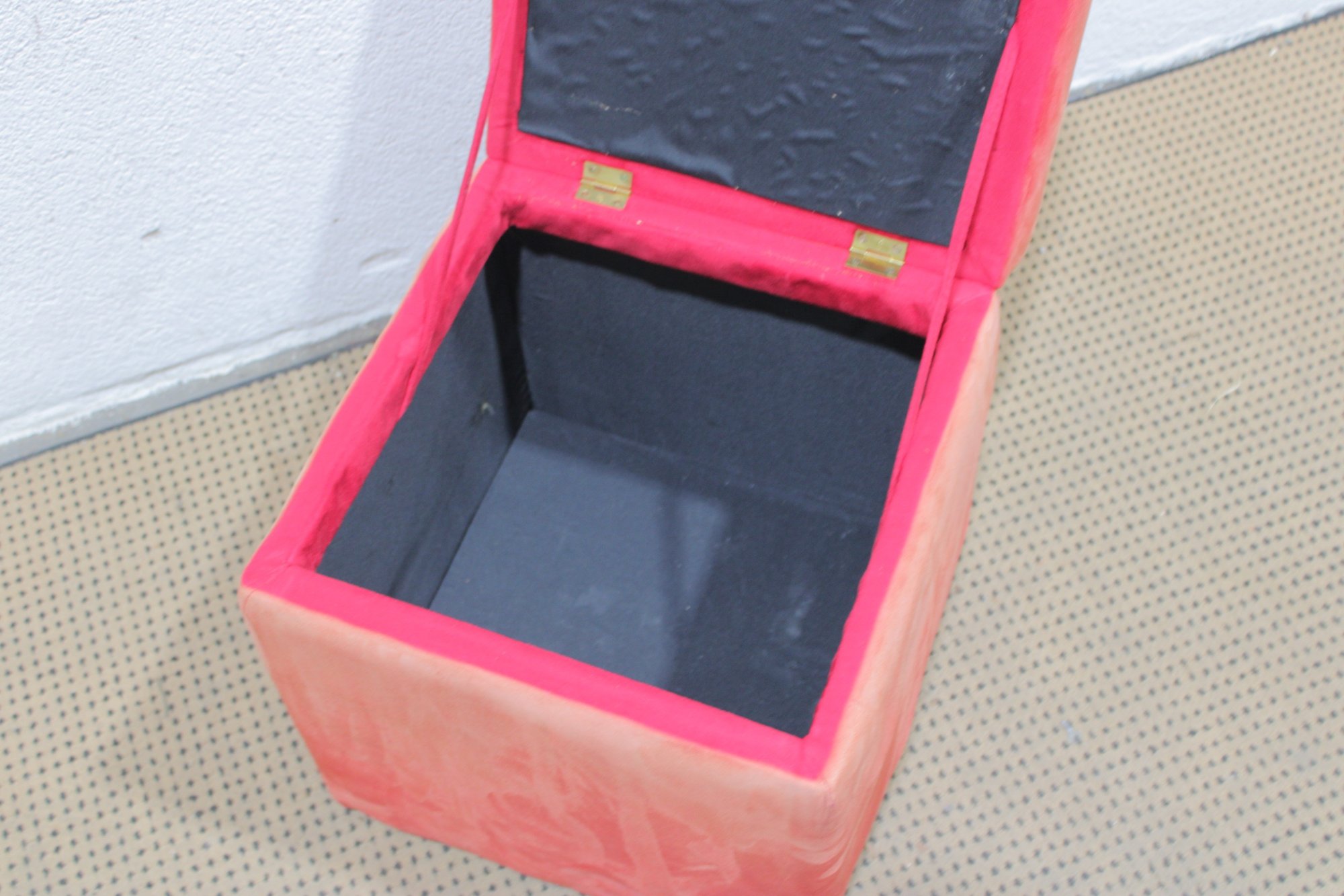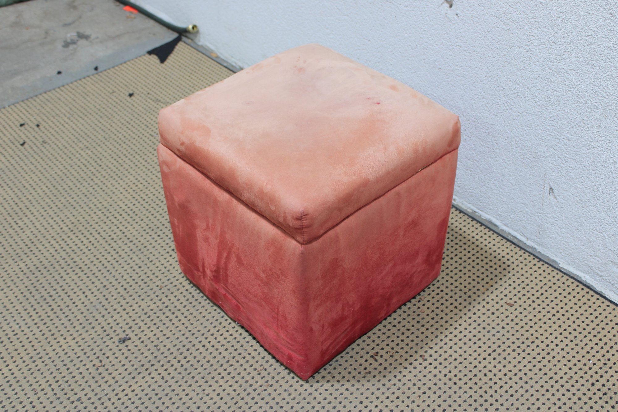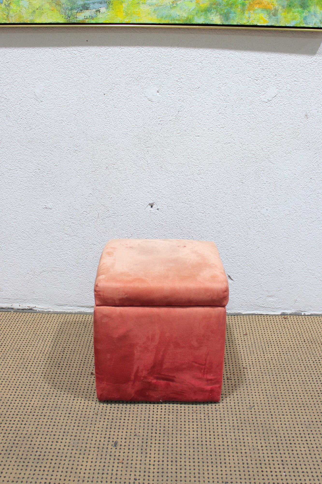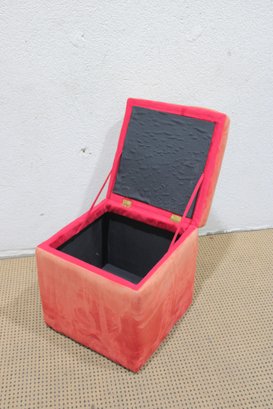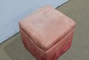 Stylish and functional upholstered storage ottoman in a soft coral / muted rose velvet-like fabric. The clean cube shape gives it a modern, versatile look, while the plush surface adds warmth and texture to any room.