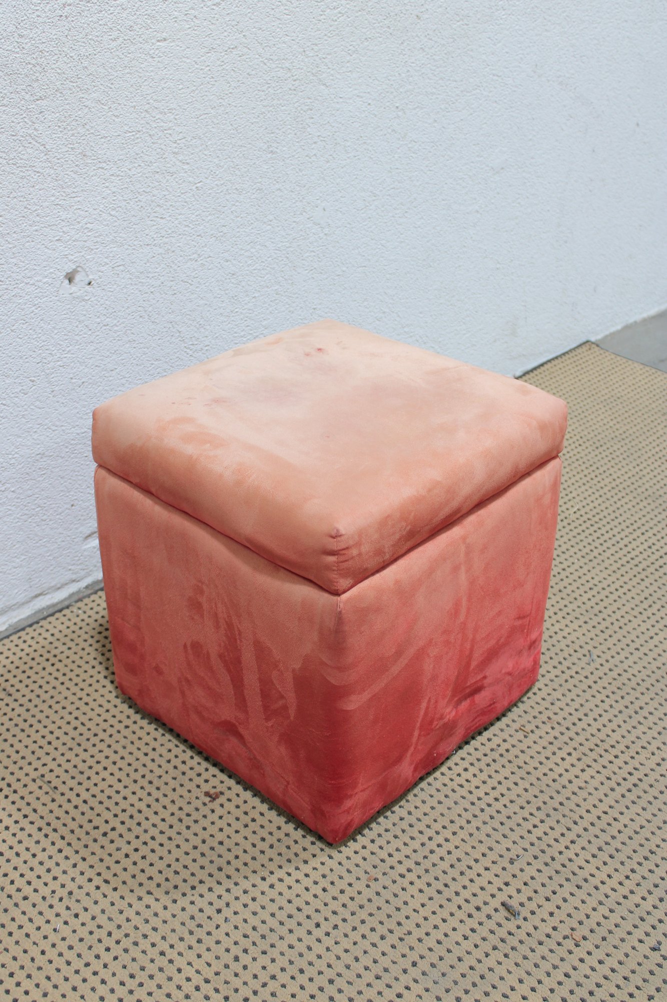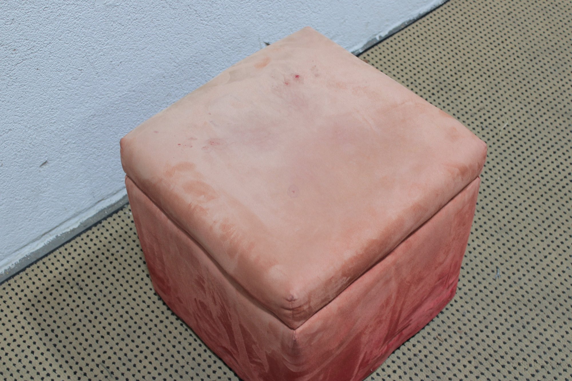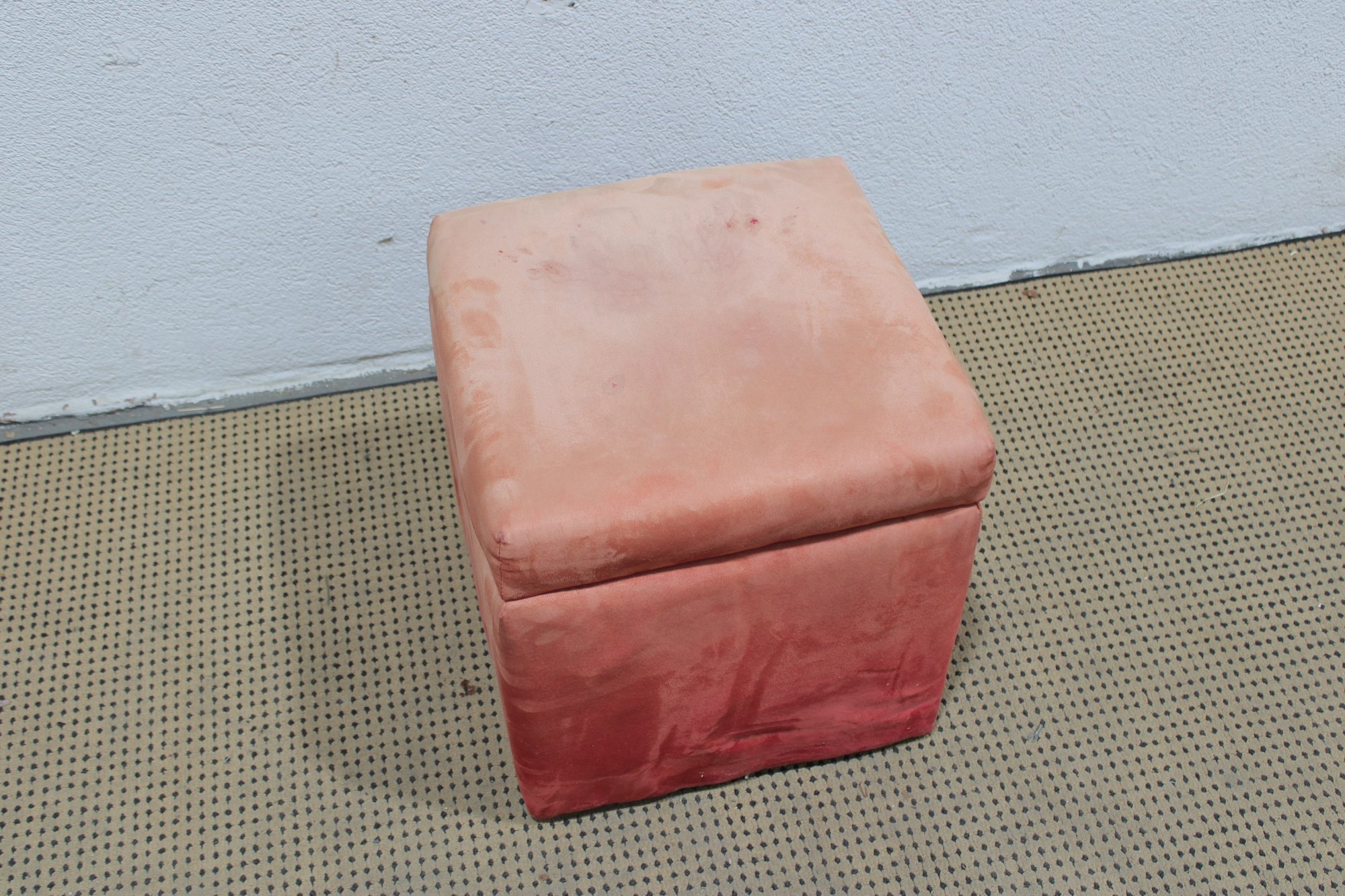 Stylish and functional upholstered storage ottoman in a soft coral / muted rose velvet-like fabric. The clean cube shape gives it a modern, versatile look, while the plush surface adds warmth and texture to any room.
