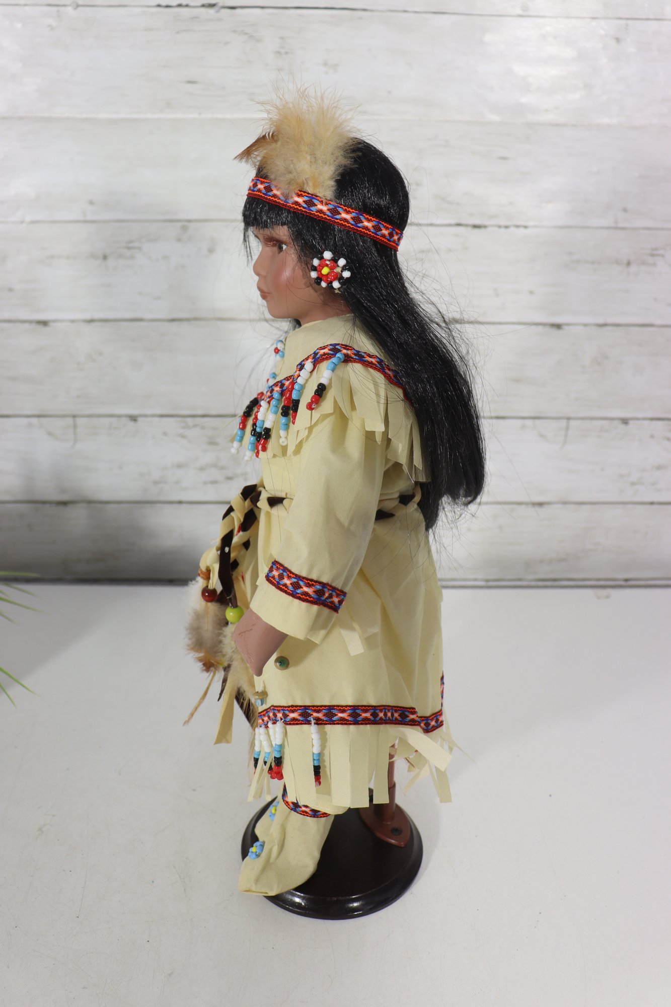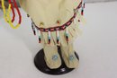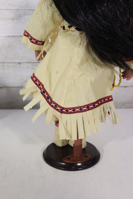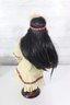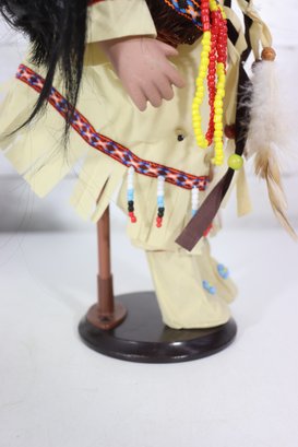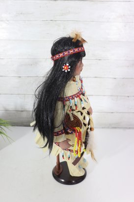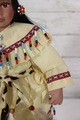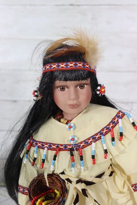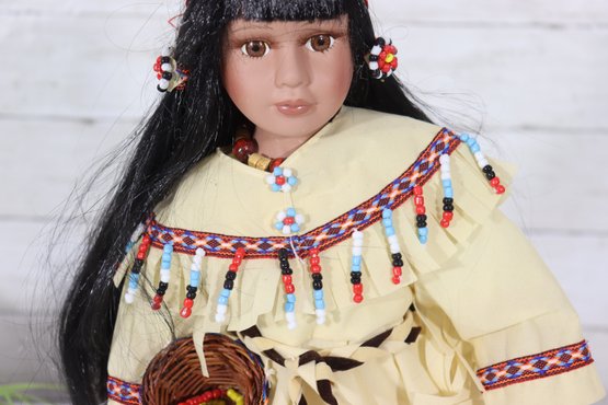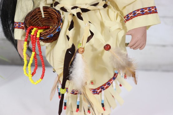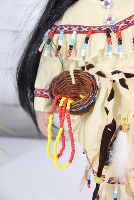 Beautiful vintage porcelain doll dressed in a detailed Native-inspired ceremonial outfit, featuring beaded trim, fringe, feather accents, and a woven basket accessory. The doll has long dark hair, expressive facial features, and stands on a black display base, making it a striking decorative piece.