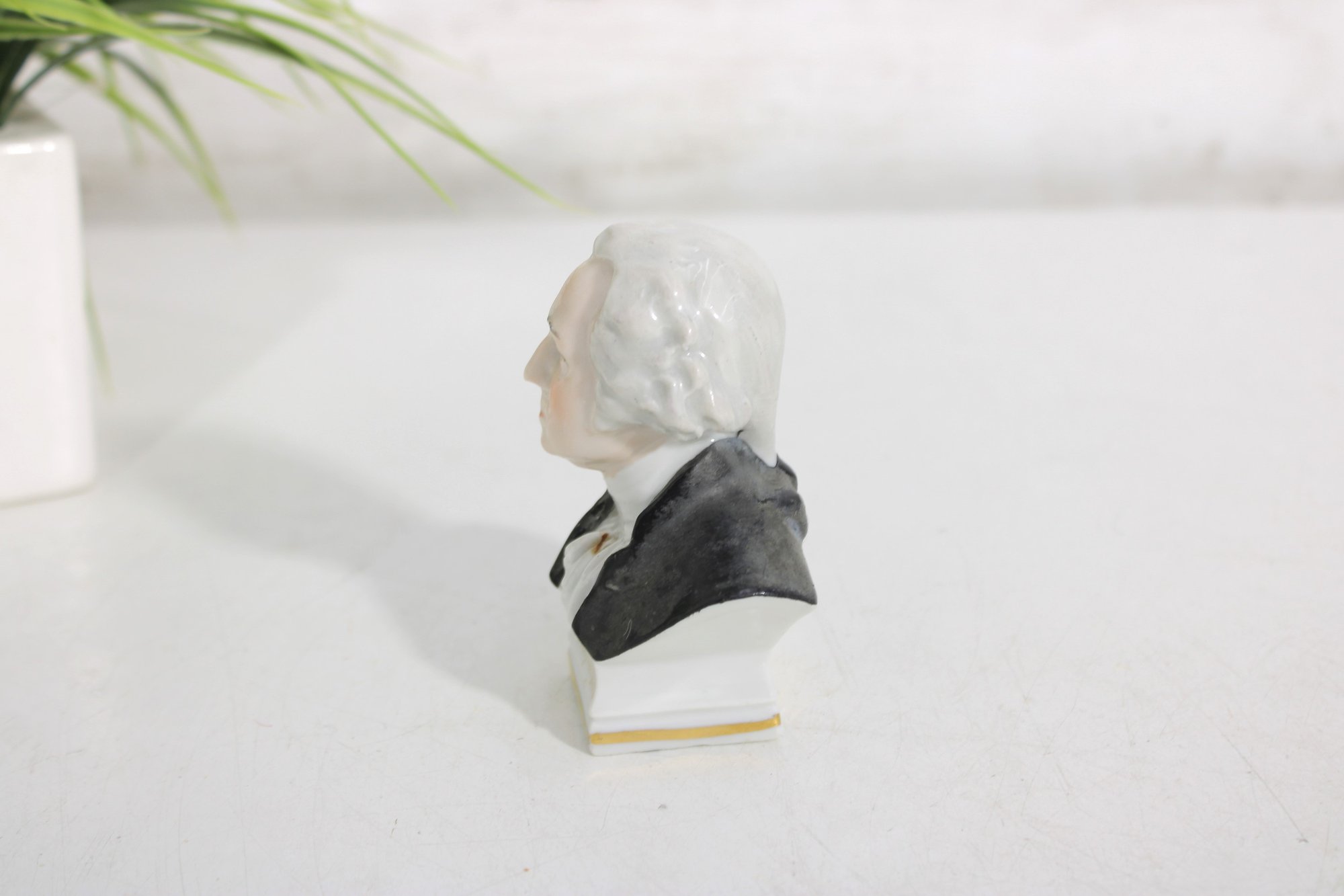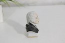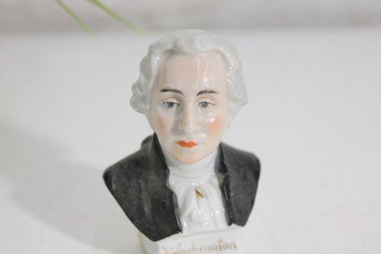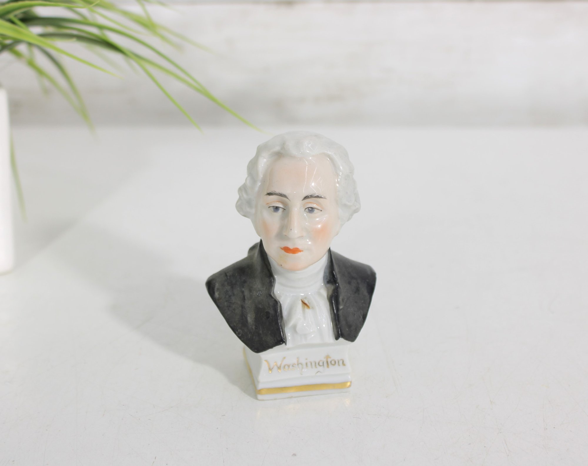 Classic vintage porcelain bust of George Washington, finely detailed with hand-painted features and a glossy finish. This miniature figurine captures the likeness of the first U.S. president, complete with period attire and a labeled base.