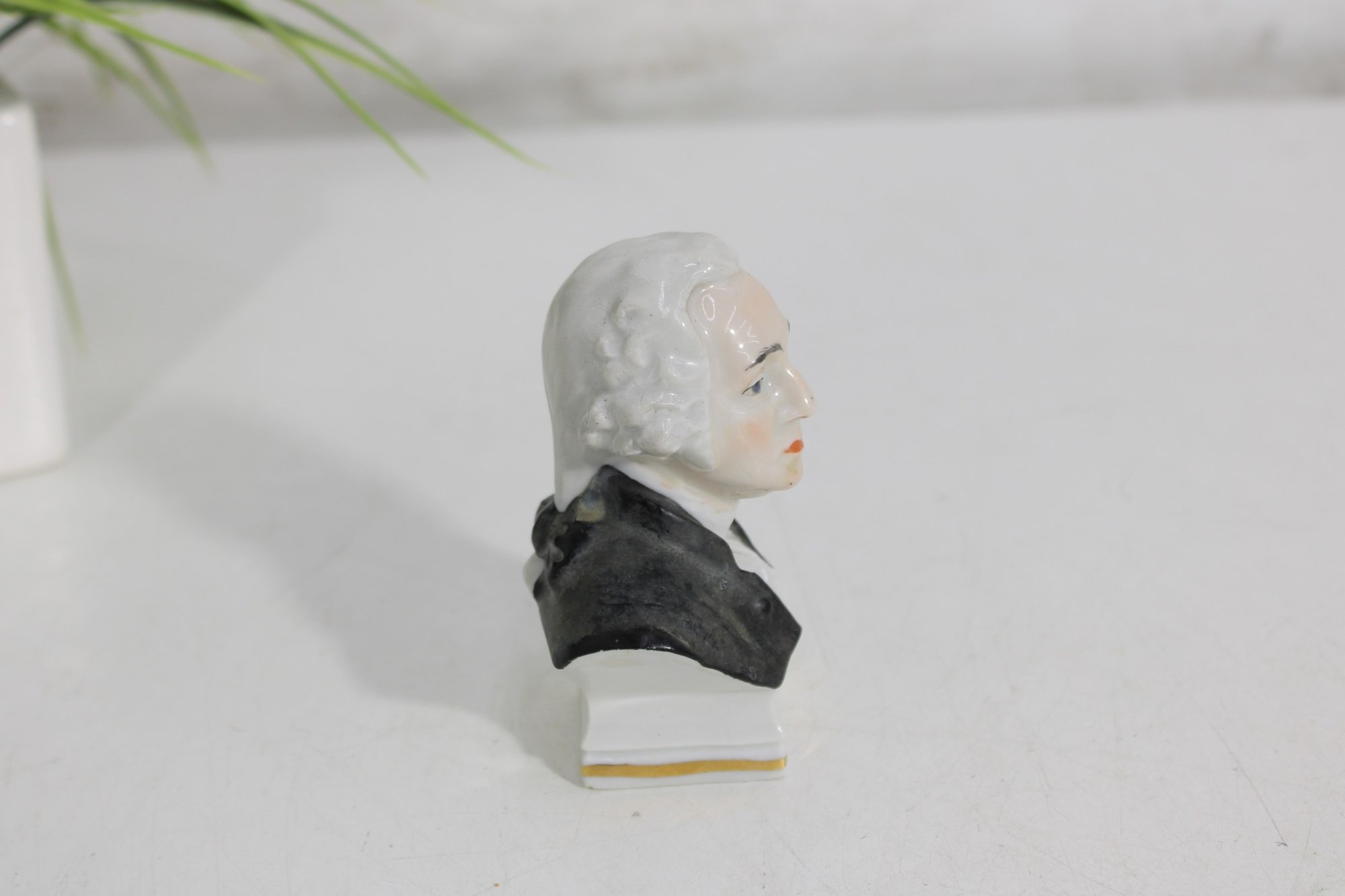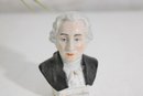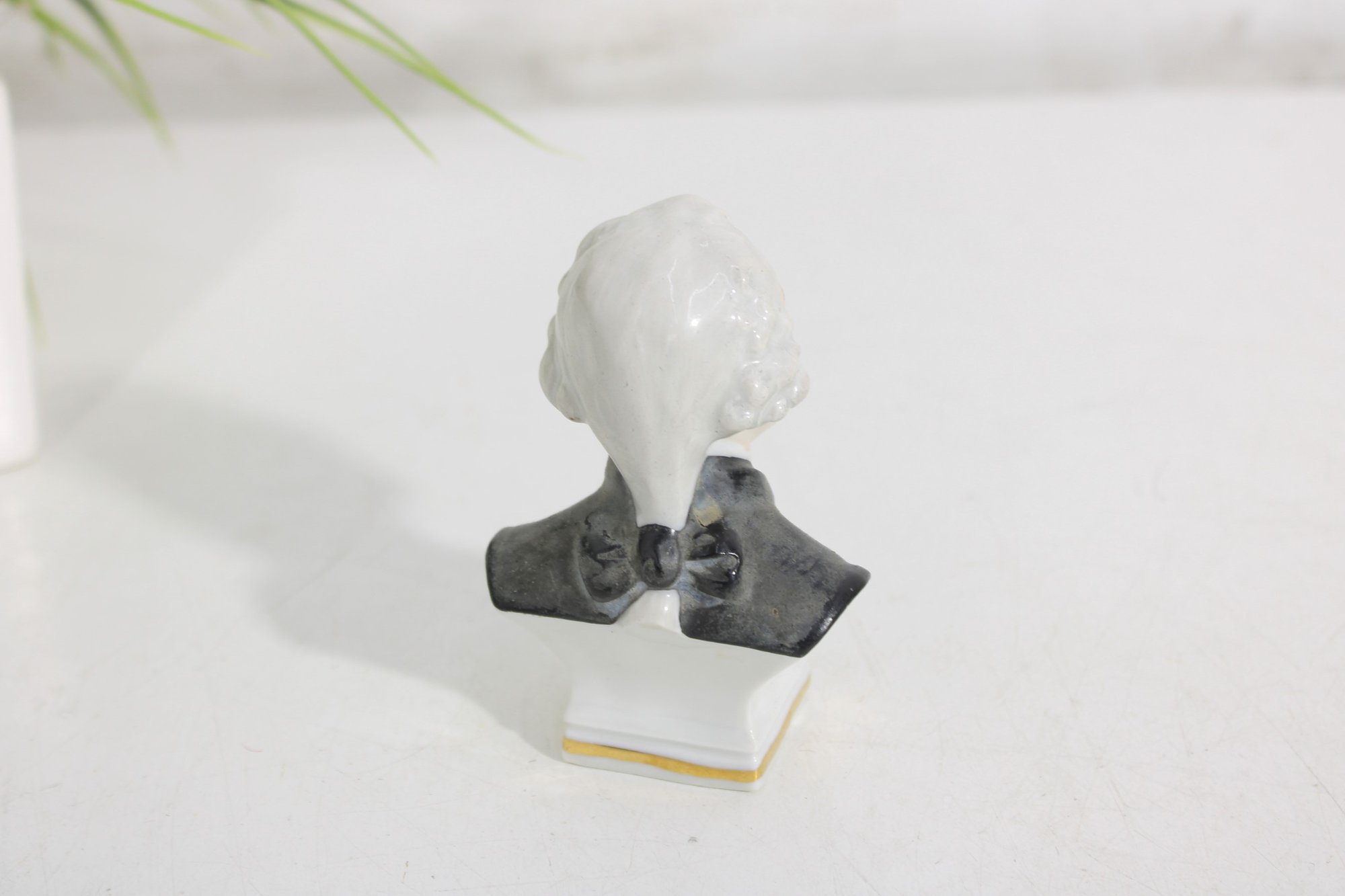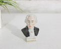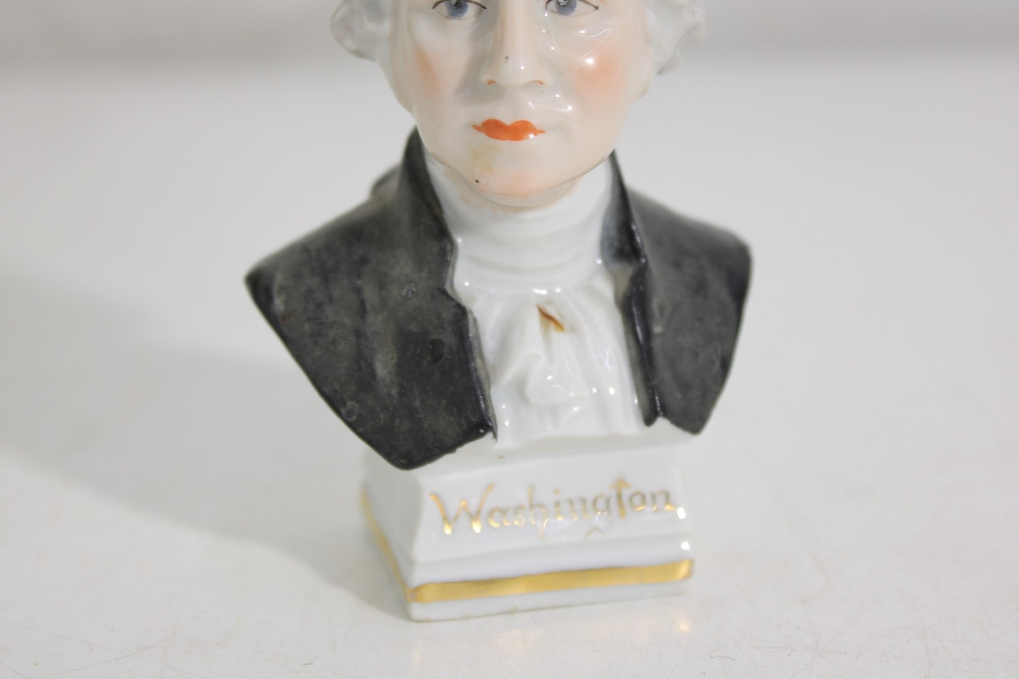 Classic vintage porcelain bust of George Washington, finely detailed with hand-painted features and a glossy finish. This miniature figurine captures the likeness of the first U.S. president, complete with period attire and a labeled base.