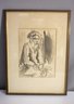 This is a striking ink sketch by artist David Gilboa, dated 1964, featuring a seated elderly man with a contemplative expression. The artwork is rendered in bold brushstrokes of black ink, capturing the essence and emotion of the subject through minimalistic lines. Gilboa's signature is located on the bottom right of the artwork, adding authenticity and provenance to this piece. Framed in a classic wooden frame with gold accents and beige matting, the artwork measures approximately 24x18 inches. The frame is in good condition, with some minor signs of age-related wear. A stunning addition to any collection of fine art or mid-century portraits.