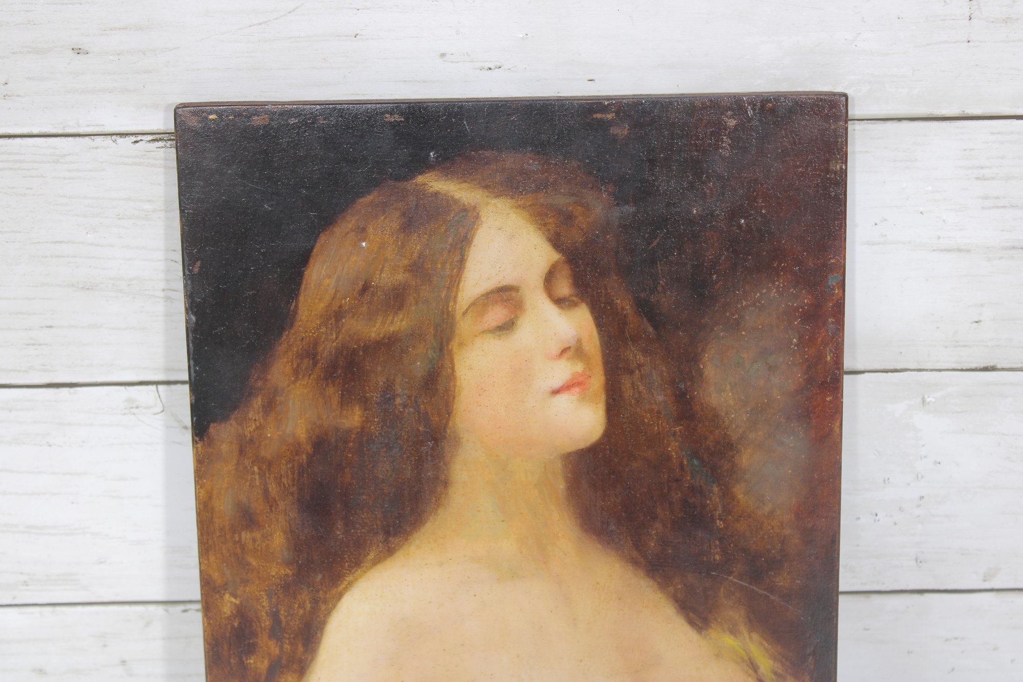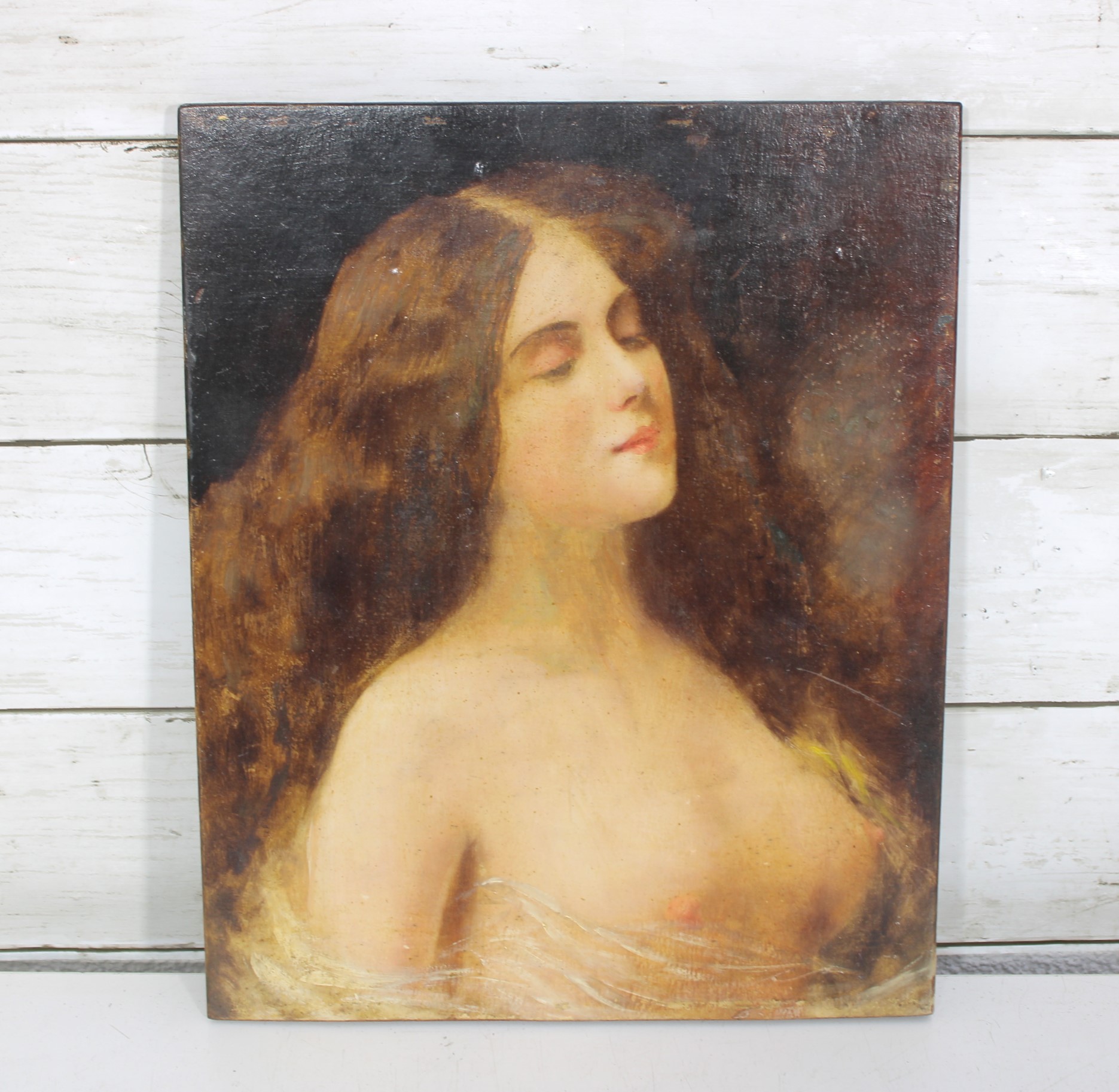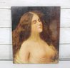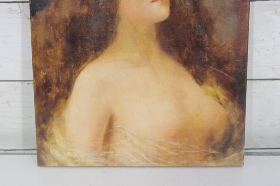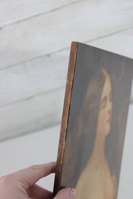 vintage portrait painting on board depicting a softly rendered romantic female figure, shown in profile with eyes gently closed. The composition has a dreamy, classical quality, with warm tones and painterly brushwork that evoke 19th-century academic or romantic influences.