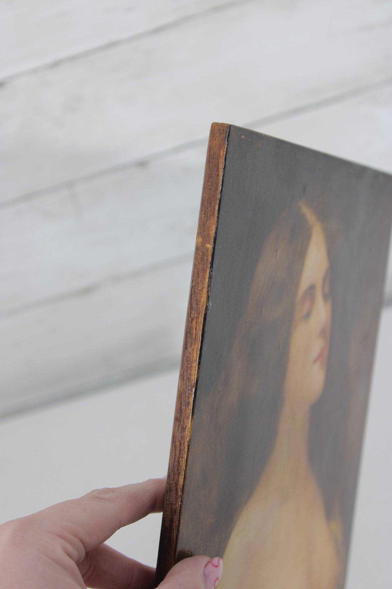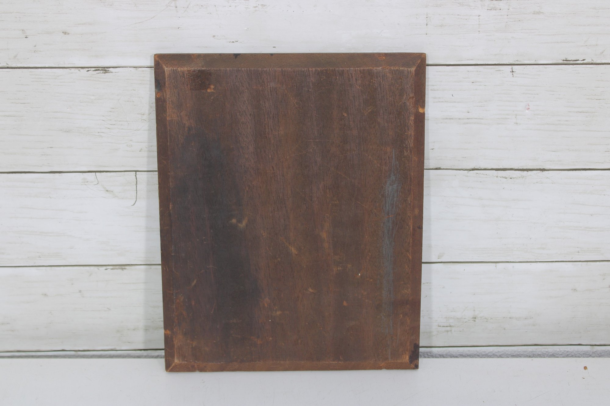 The artwork is executed on a solid board rather than canvas, giving it a substantial, old-world feel. Subtle surface wear, darkened areas, and tonal variation contribute to its aged character and visual depth.