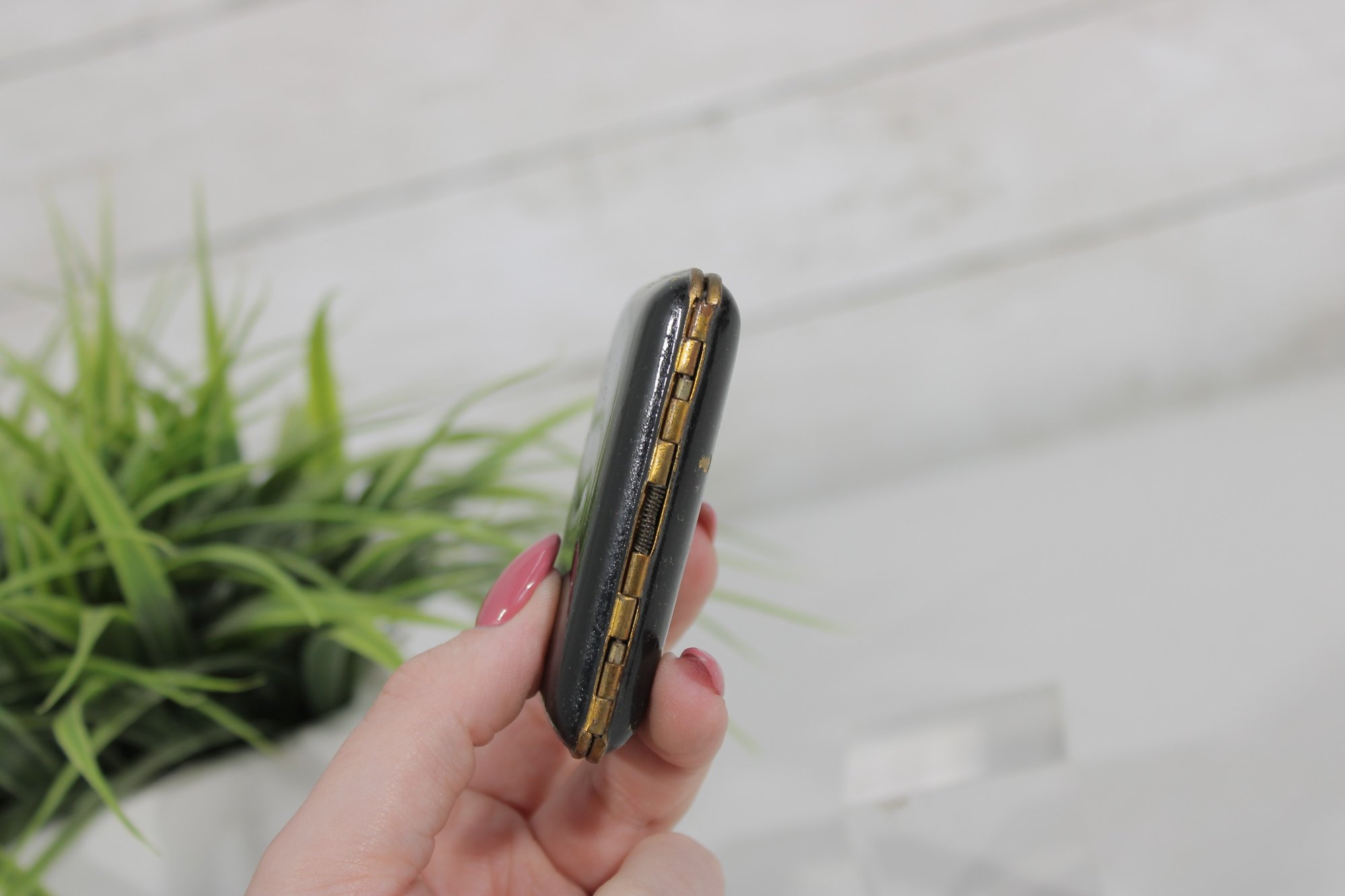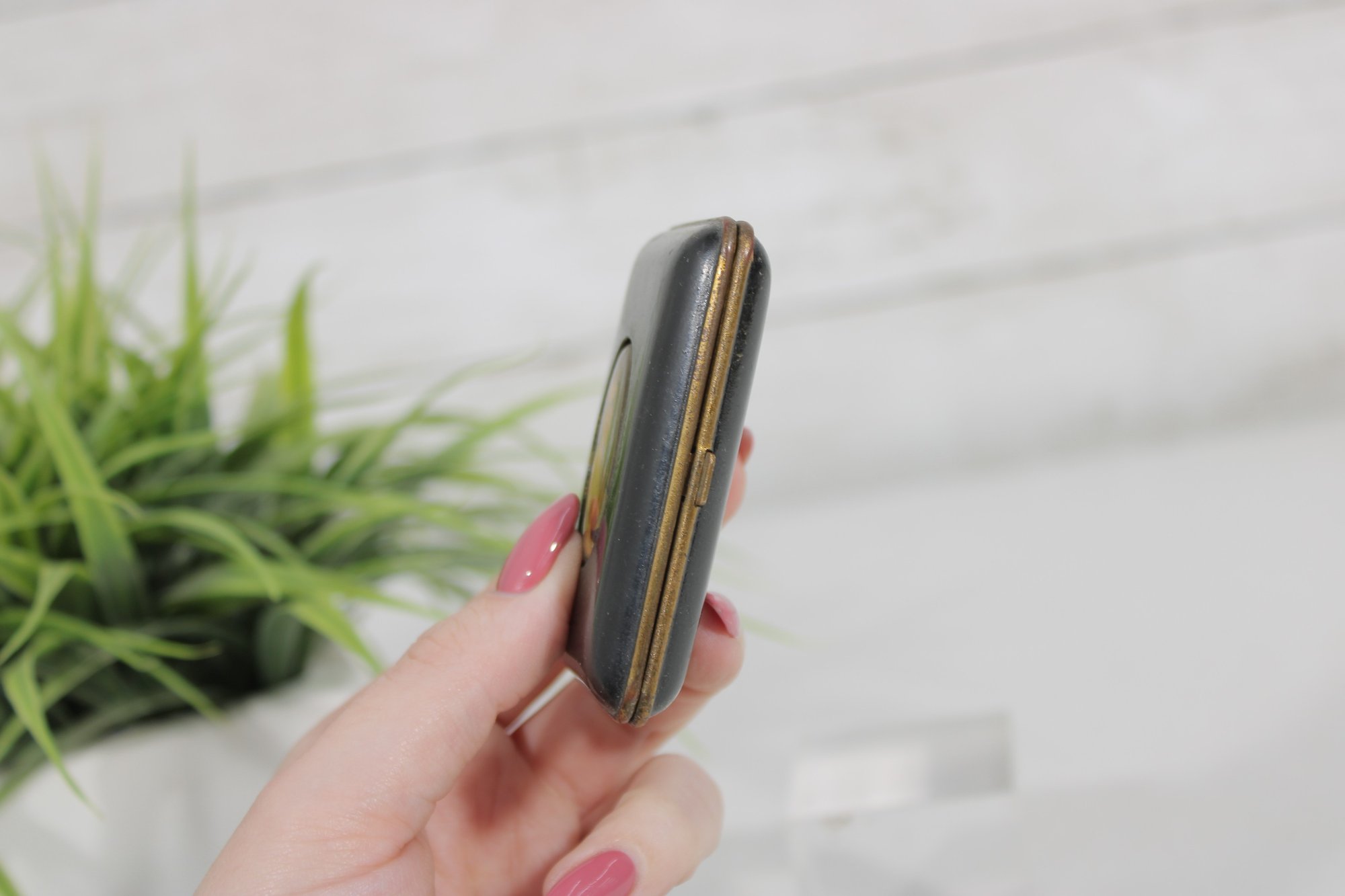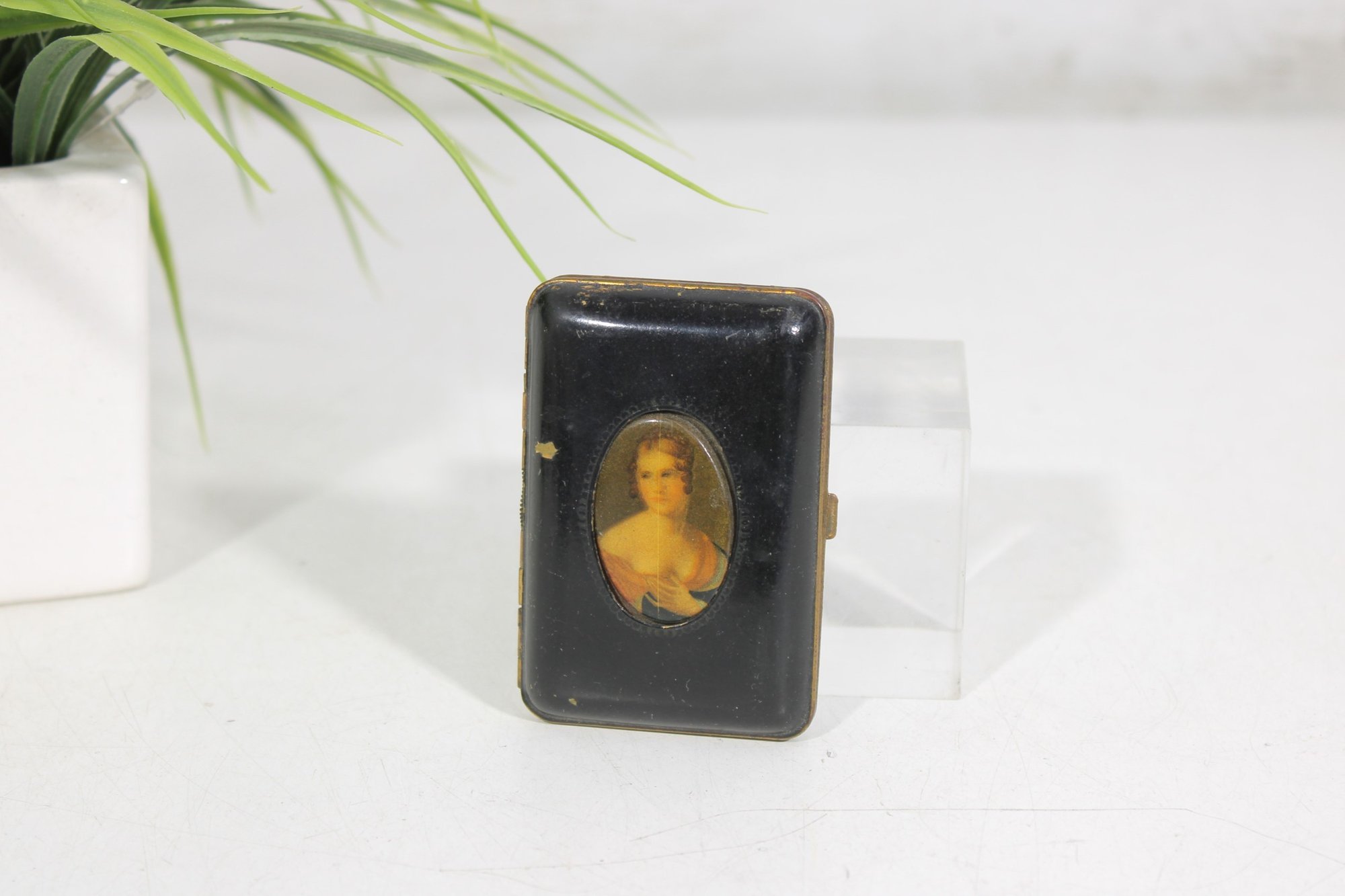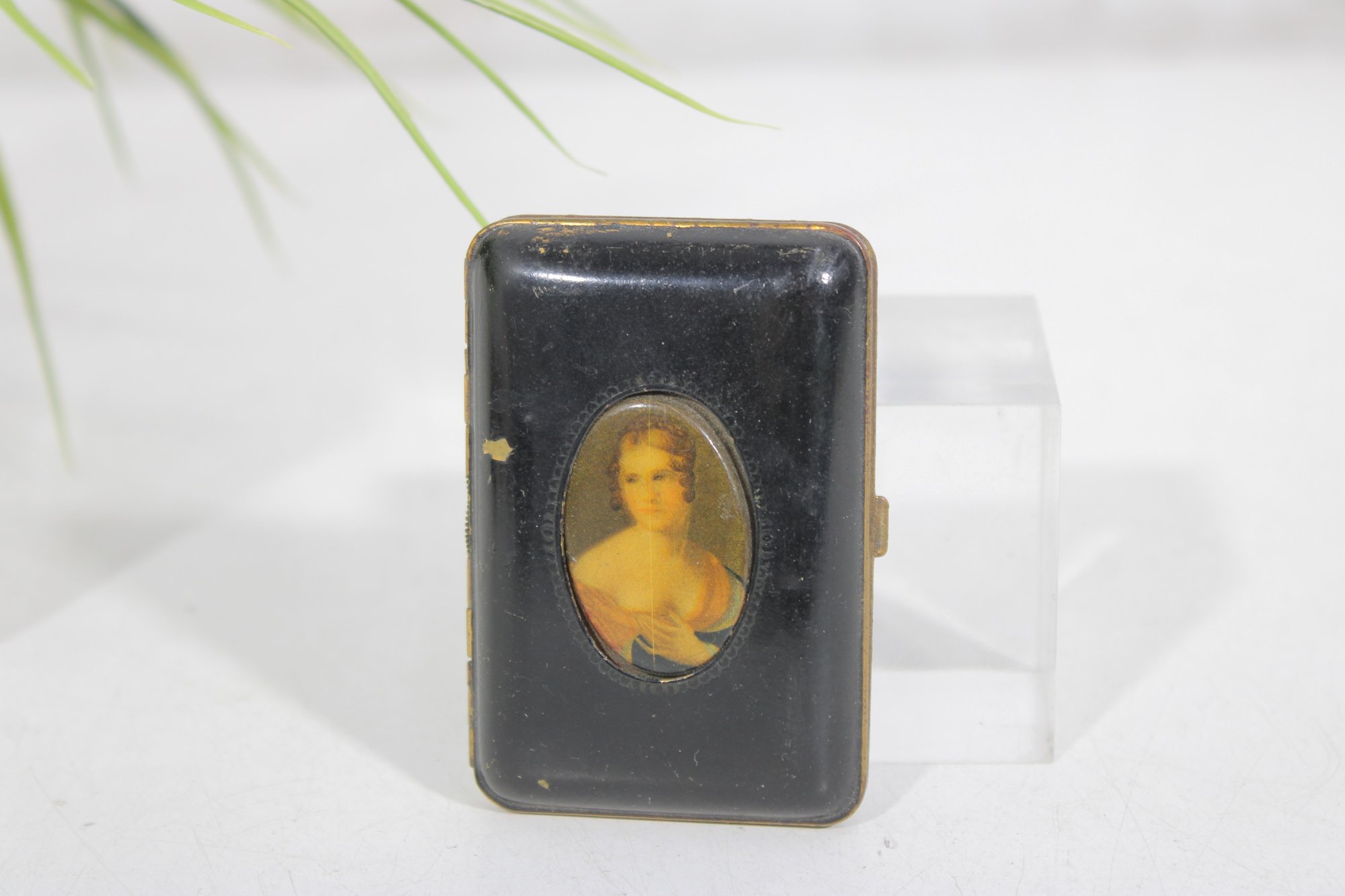 charming vintage powder compact featuring a classic portrait cameo-style image of a lady on the lid. The compact has a dark exterior with a framed oval portrait, giving it an elegant and nostalgic vintage appearance.