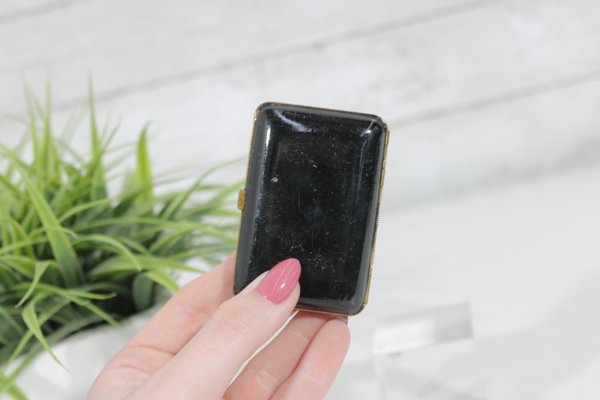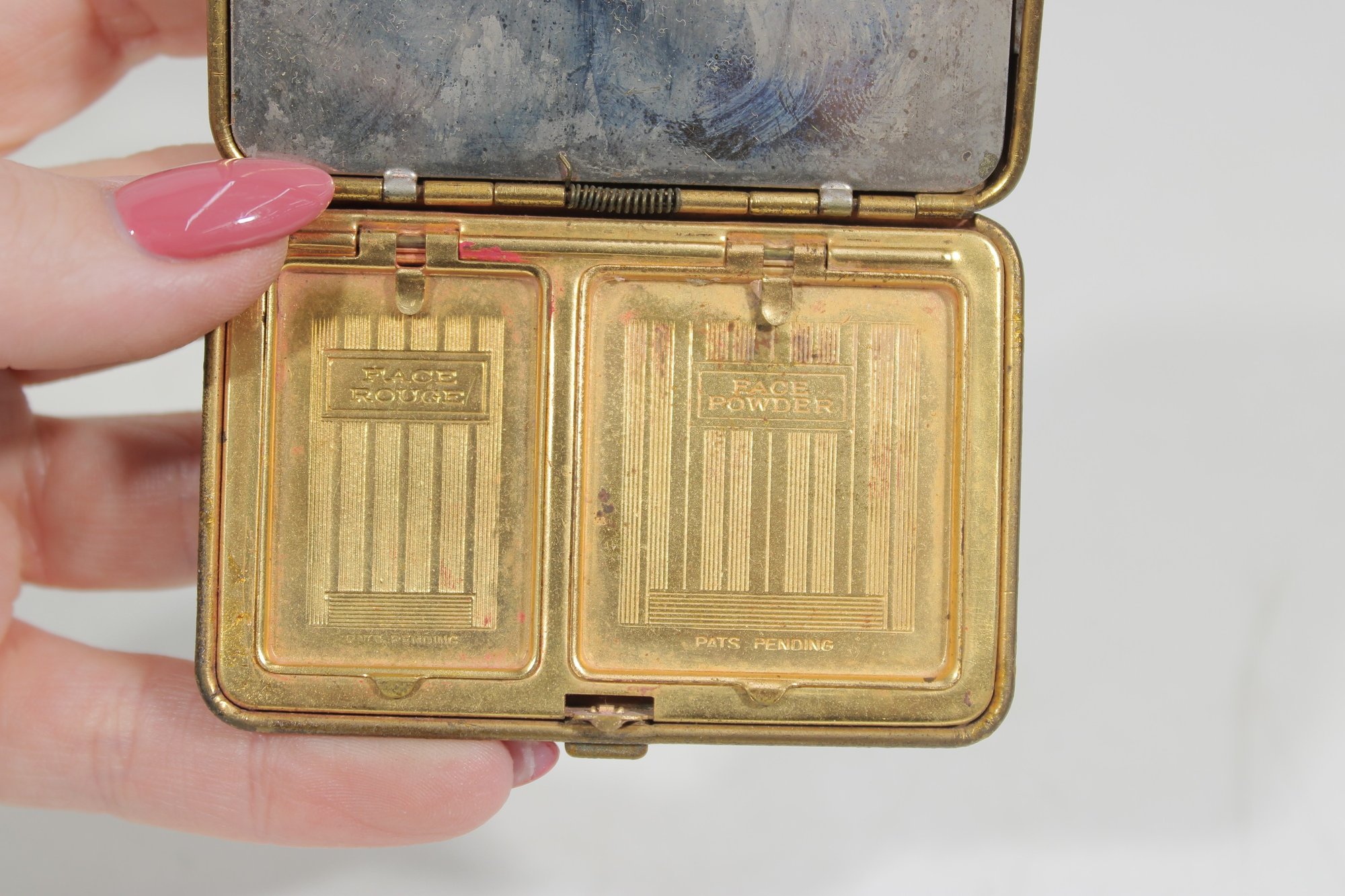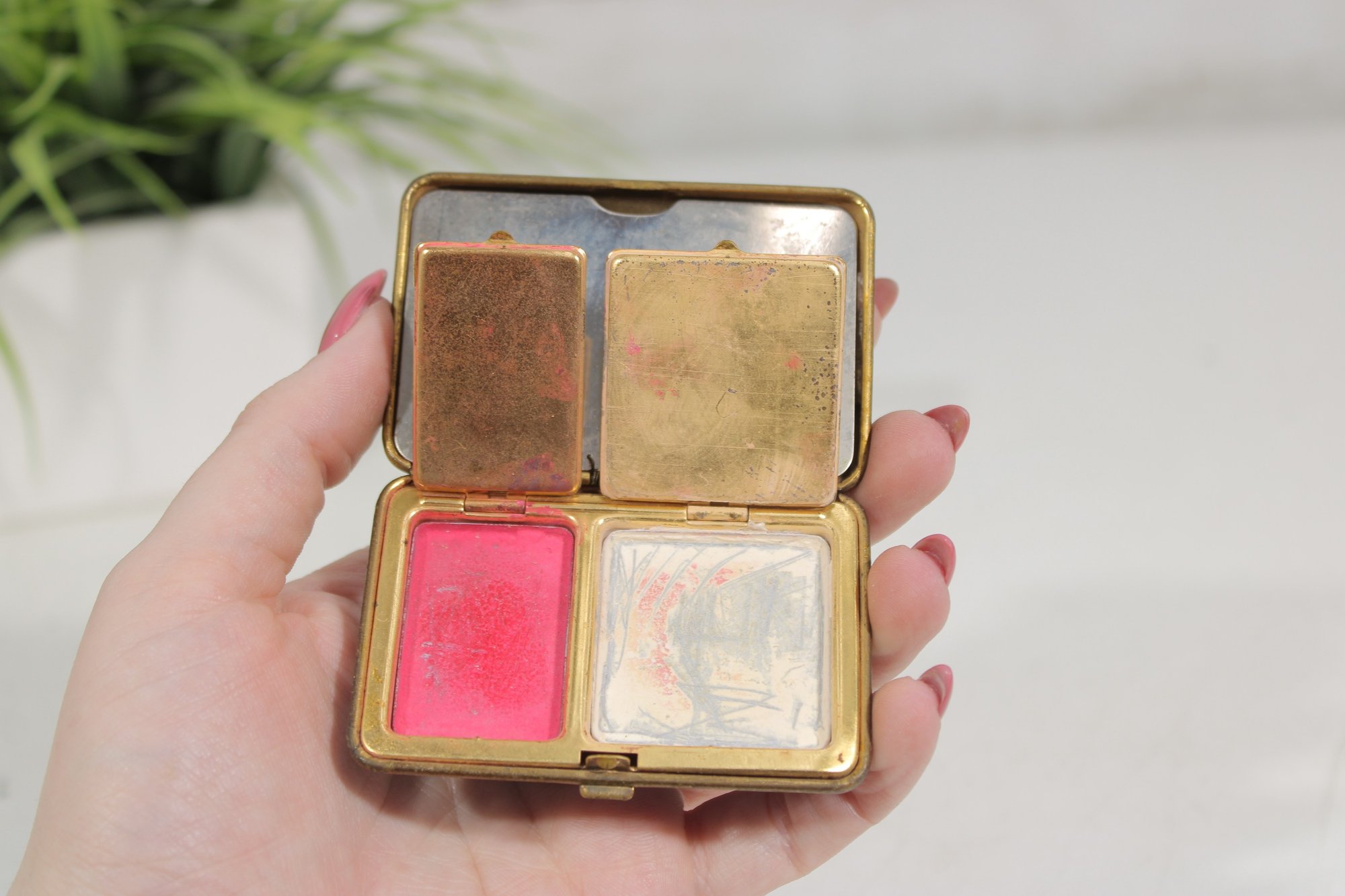 Inside, the compact opens to reveal a mirror and divided powder compartments, typical of mid-century vanity accessories. The interior retains its gold-tone finish, and remnants of vintage cosmetics remain in the compartments, adding to its authentic character.