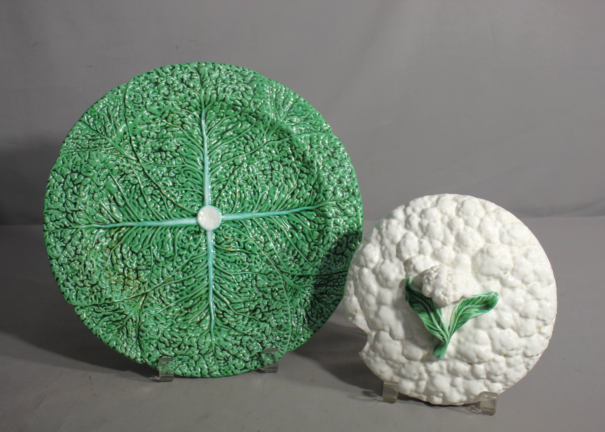 The lot includes a large lettuce leaf plate, intricately detailed to mimic the veins and texture of a real leaf, finished in a lush green glaze. Accompanying it is a tureen lid shaped like a cabbage, complete with a curled leaf handle in contrasting white,