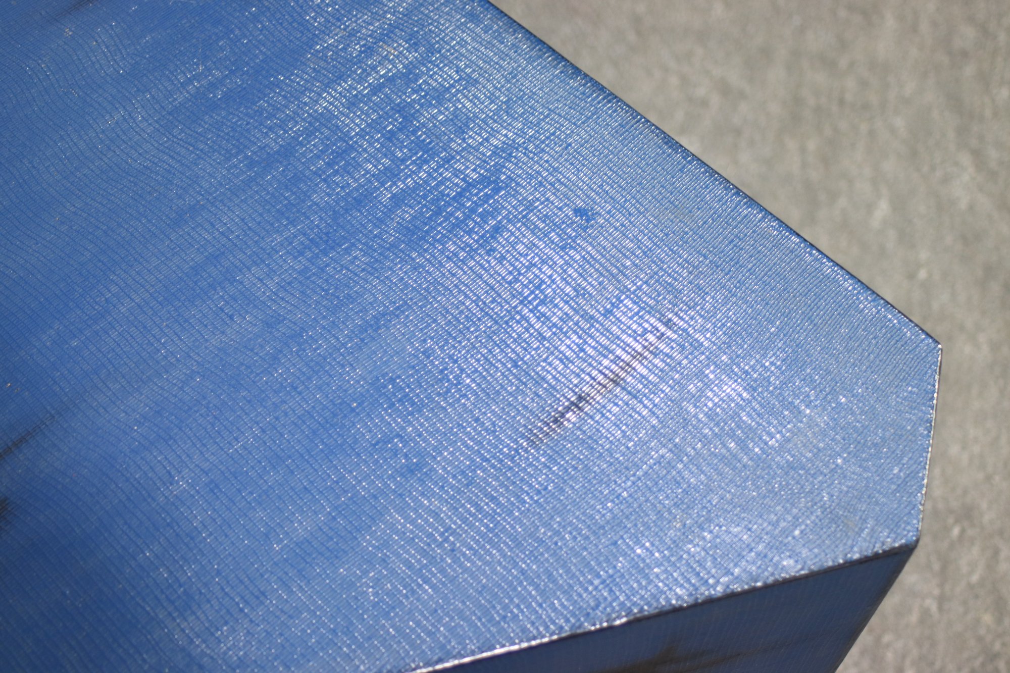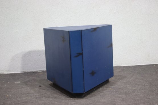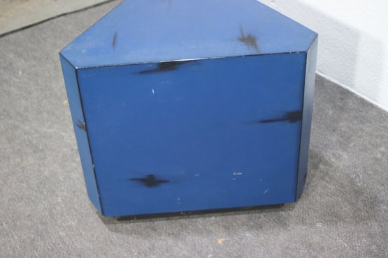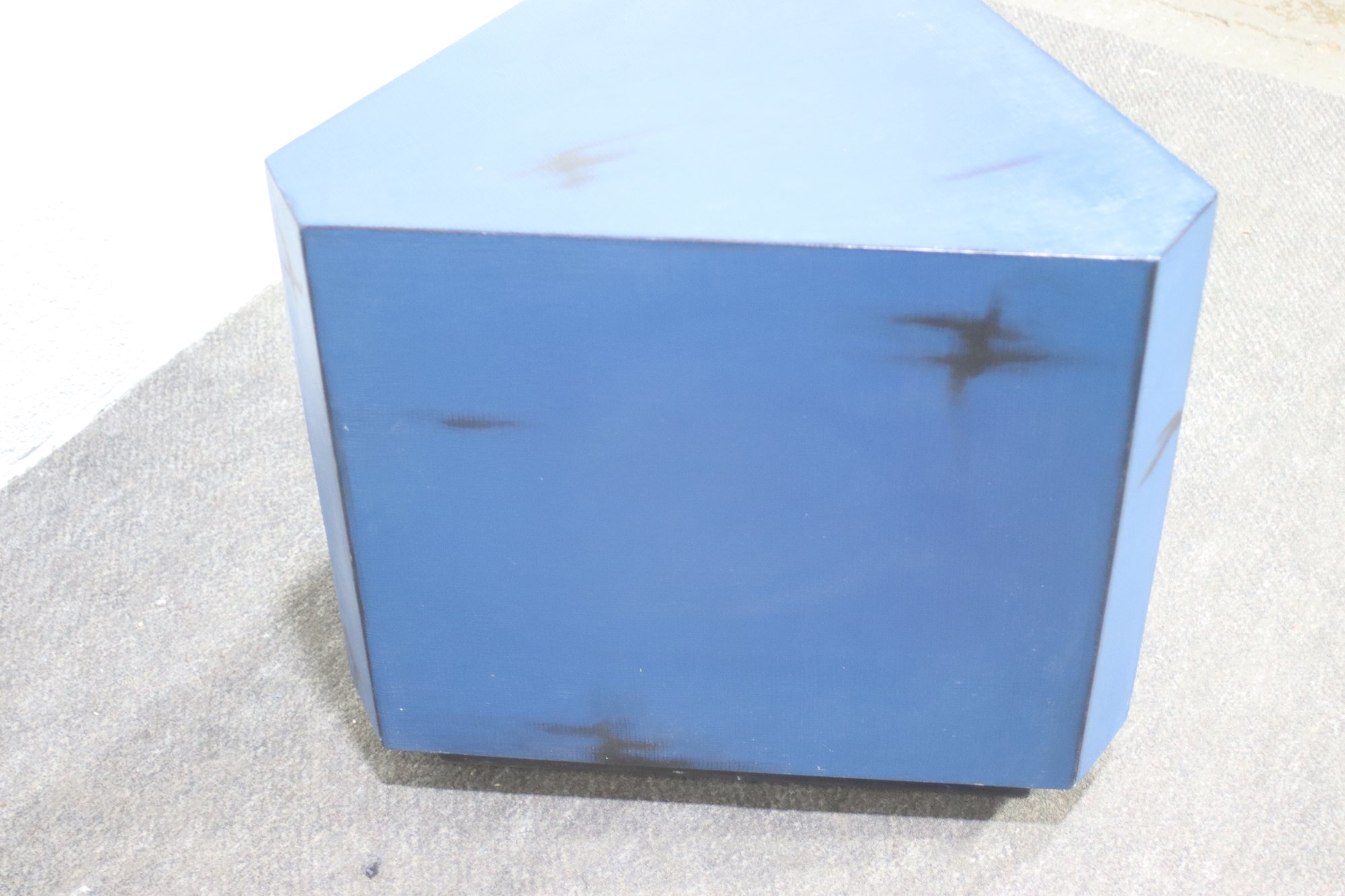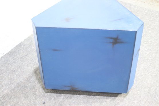 A unique postmodern triangular side table in a striking distressed blue finish. This bold geometric piece features a triangular shape, making it a great conversation piece for any modern, eclectic, or industrial-inspired space.