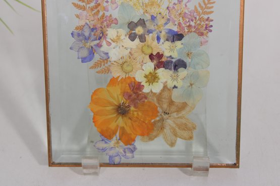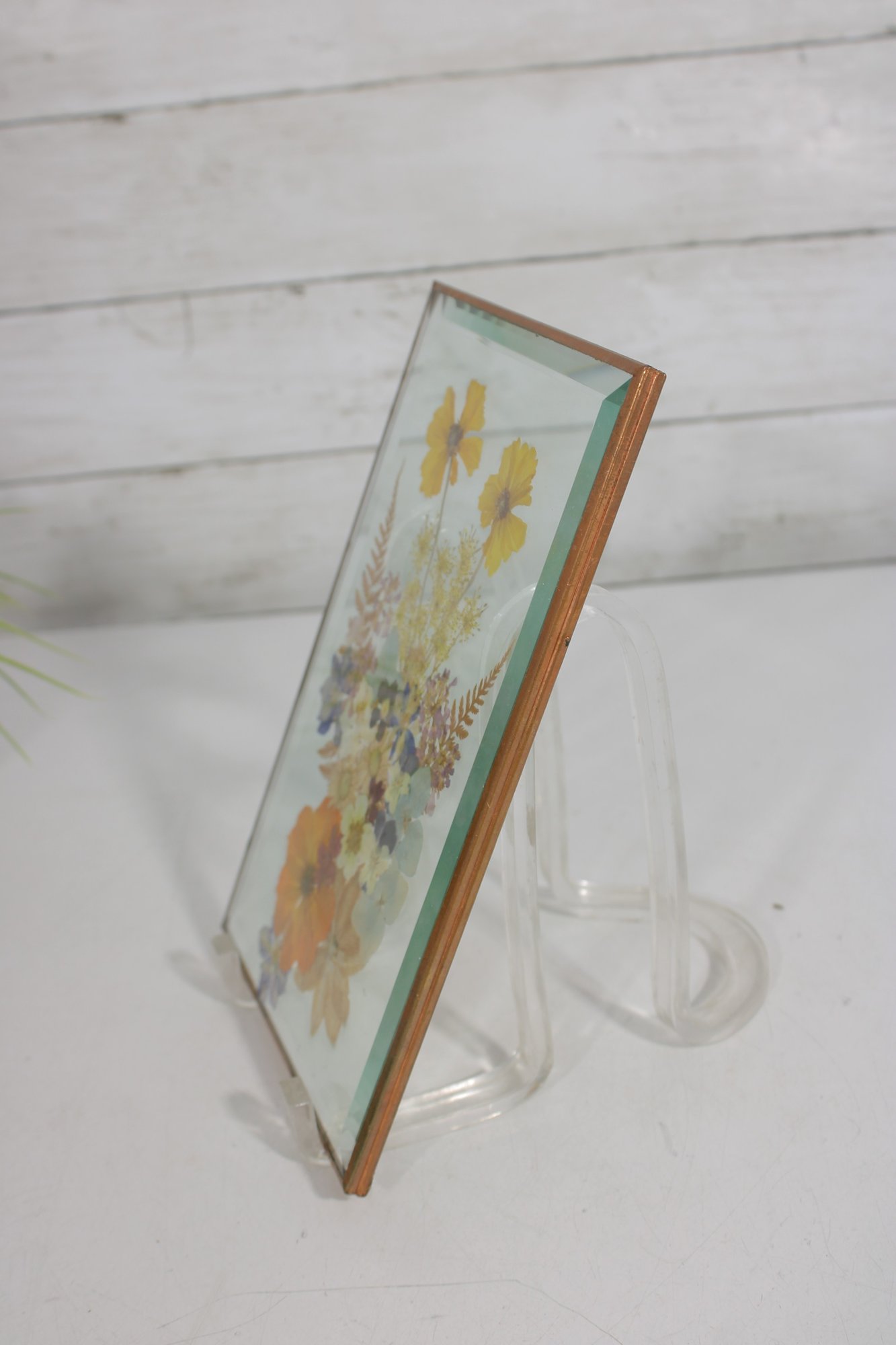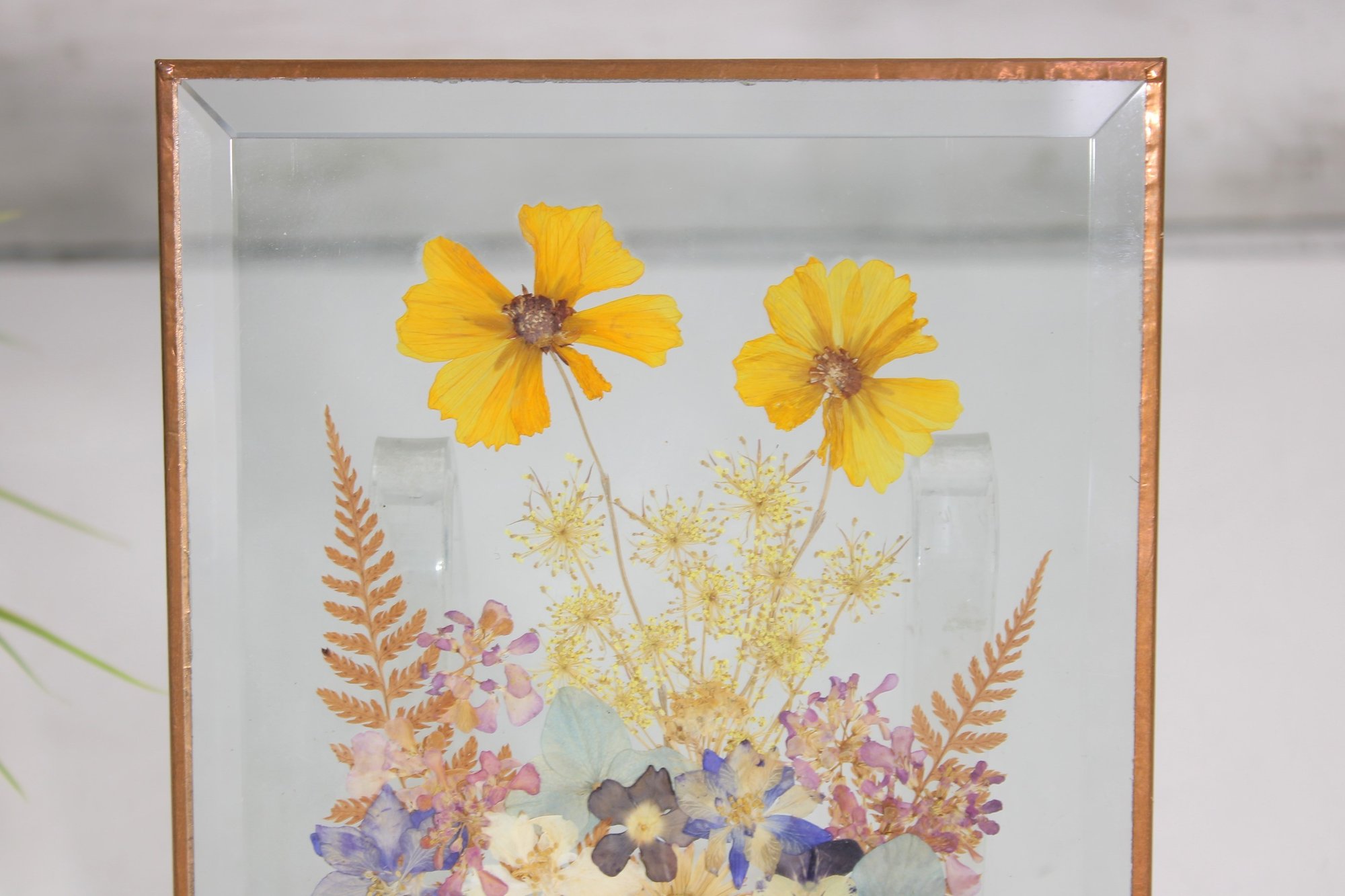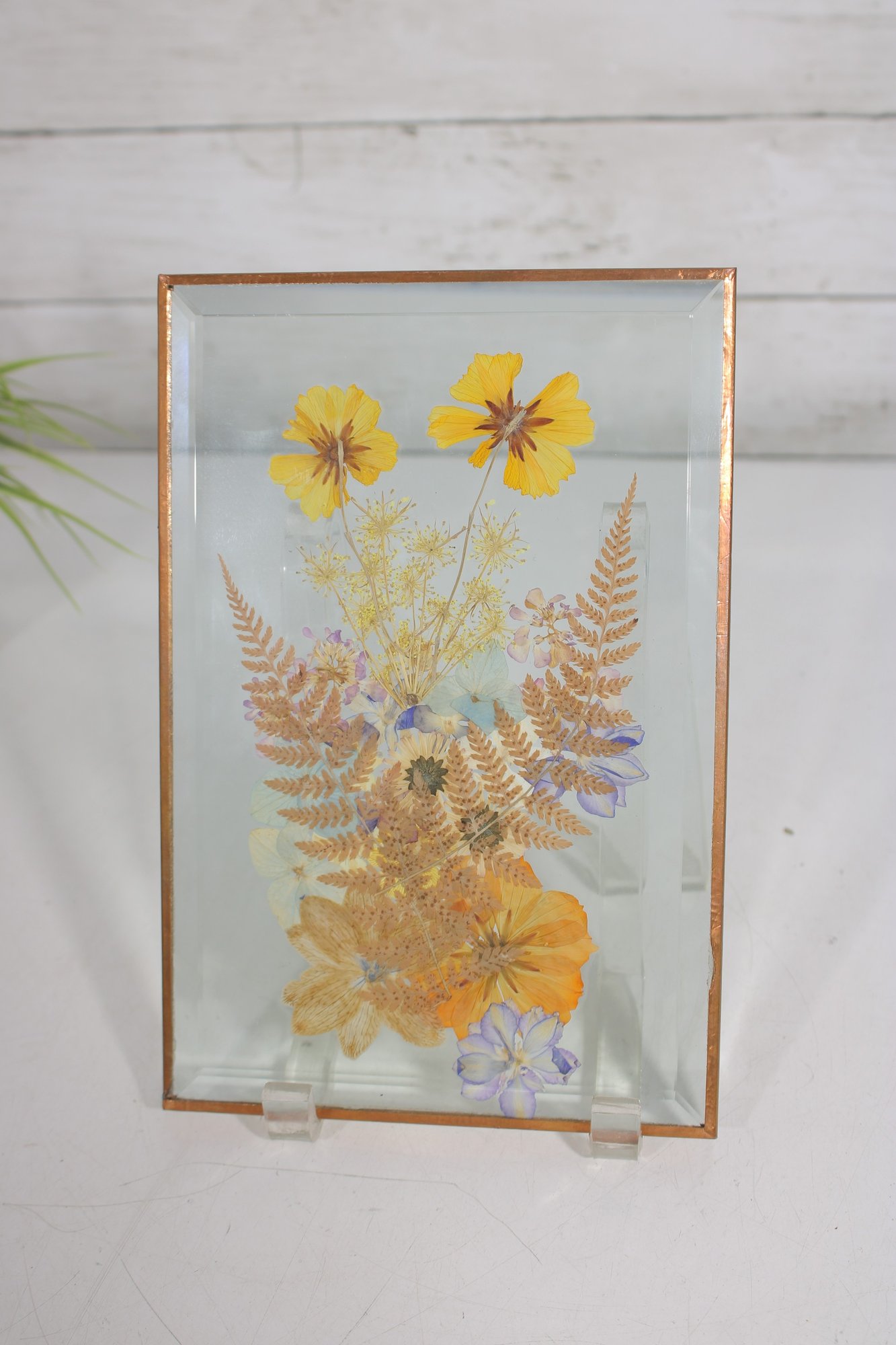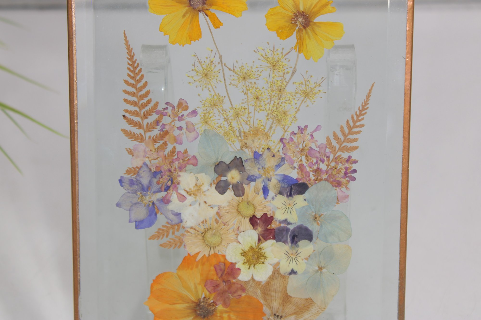 The transparent glass frame allows light to pass through, enhancing the natural colors and intricate details of each flower. The piece can be displayed on a tabletop with a stand or incorporated into a wall décor arrangement, making it a versatile addition to any space.