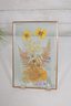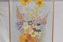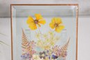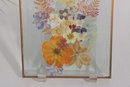 Delicate and beautifully arranged vintage pressed flower artwork displayed in a glass frame with a subtle metallic trim. This charming botanical composition features an assortment of real pressed flowers in vibrant yellows, purples, blues, and soft pastels, carefully arranged in a bouquet-style design.