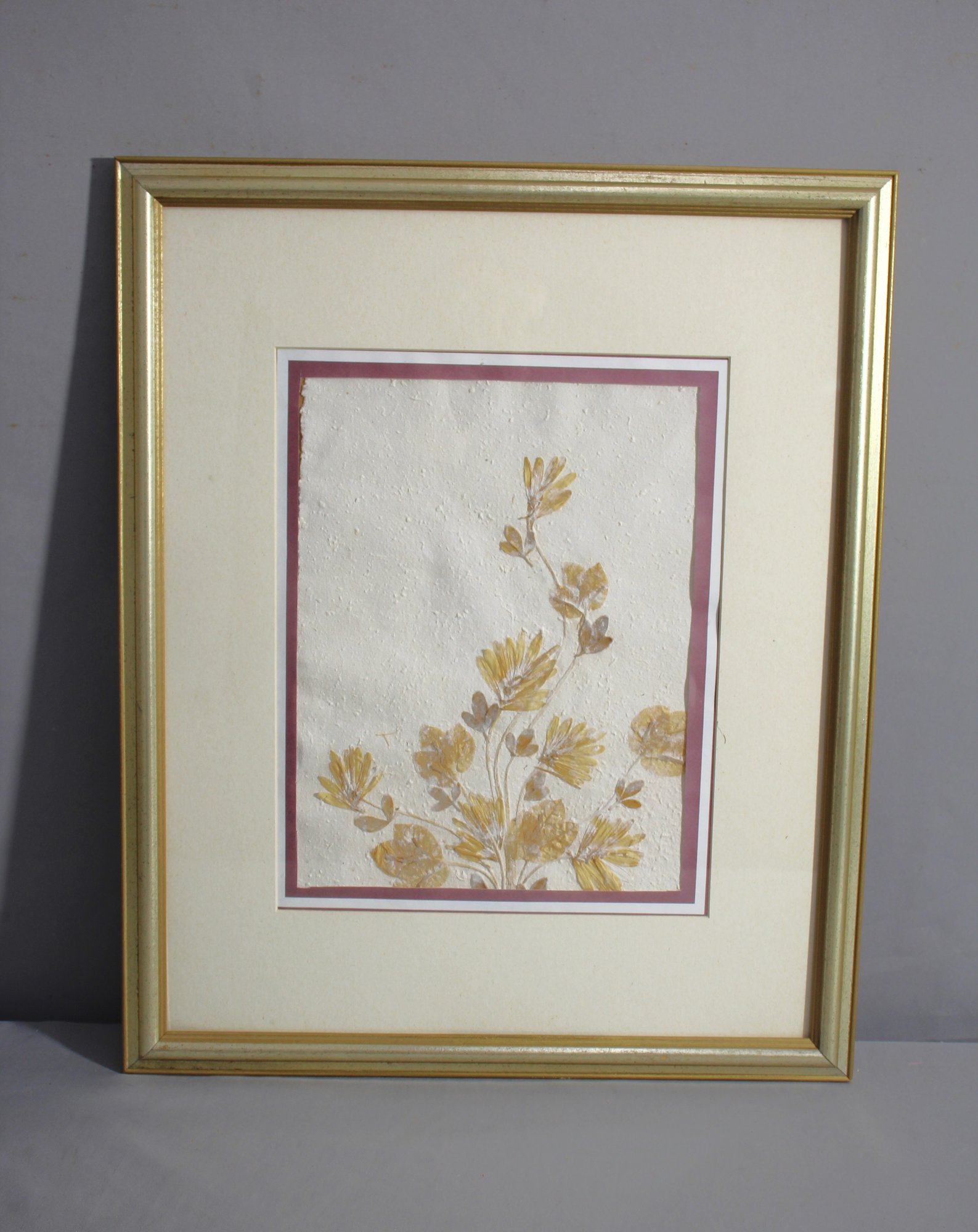 A touch of nature's enduring beauty is captured in this exquisite piece of vintage pressed flower artwork, framed and presented to add a pastoral charm to any collection. Measuring 22" x 18", this artwork showcases a delicate array of dried botanicals, carefully preserved to retain their natural hues and intricate details. Each flower has been pressed and arranged to create a harmonious composition, reminiscent of a sunlit wildflower meadow.