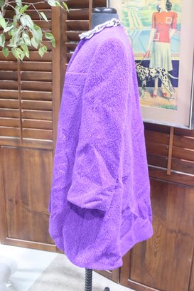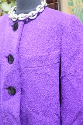 vintage flair to your wardrobe with this stunning purple bouclé swing coat. Featuring an elegant A-line silhouette and statement black faceted buttons, this coat is perfect for layering while exuding timeless sophistication.