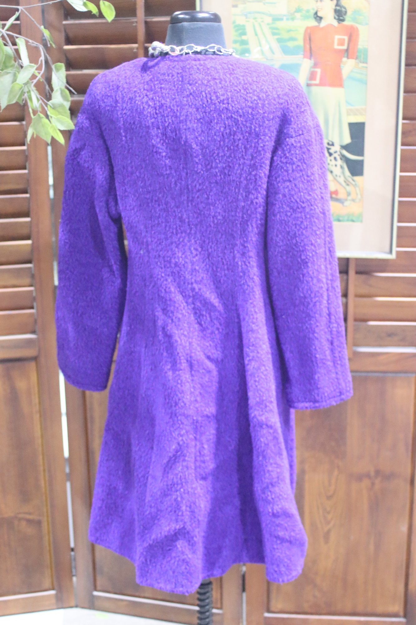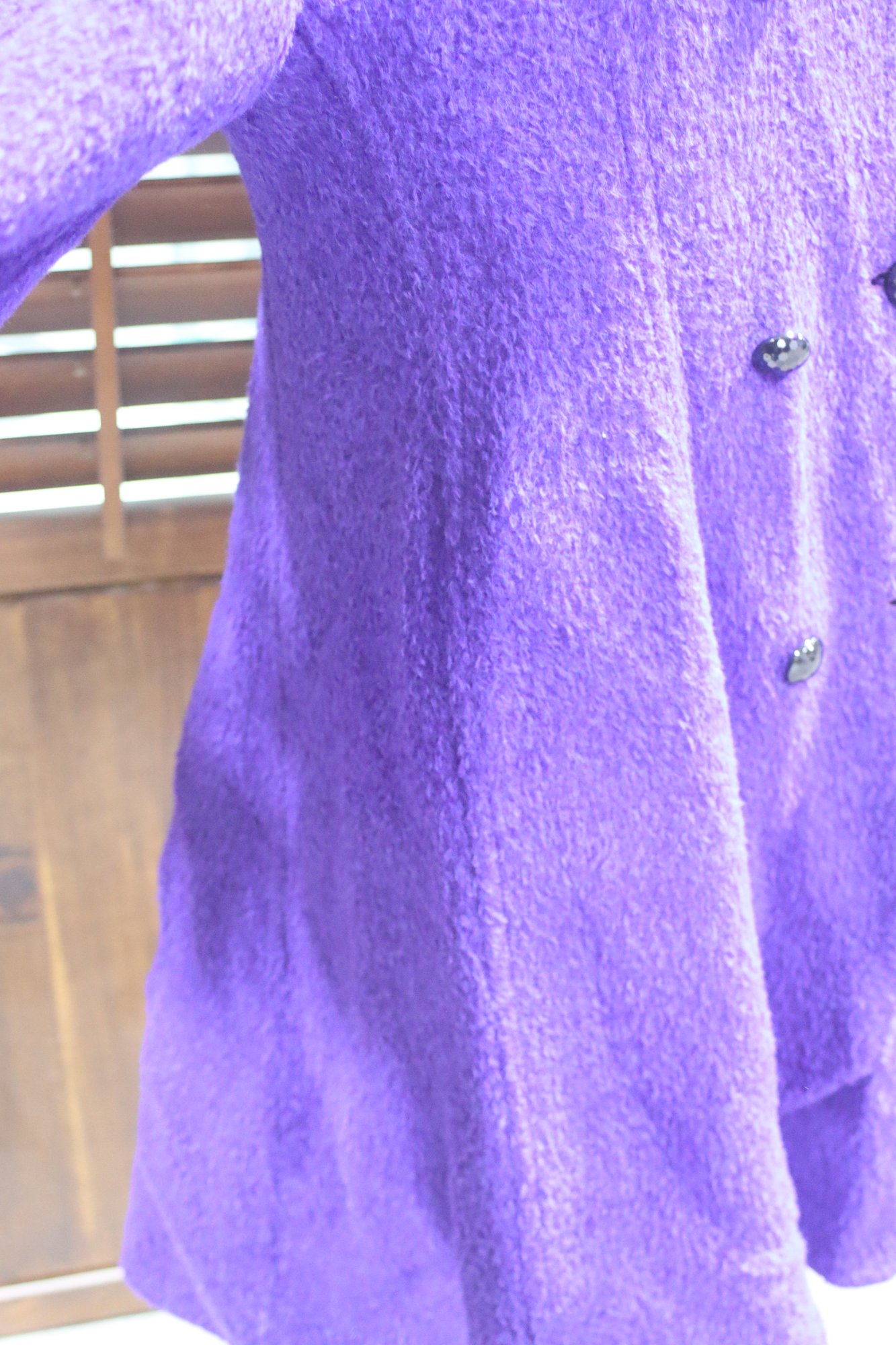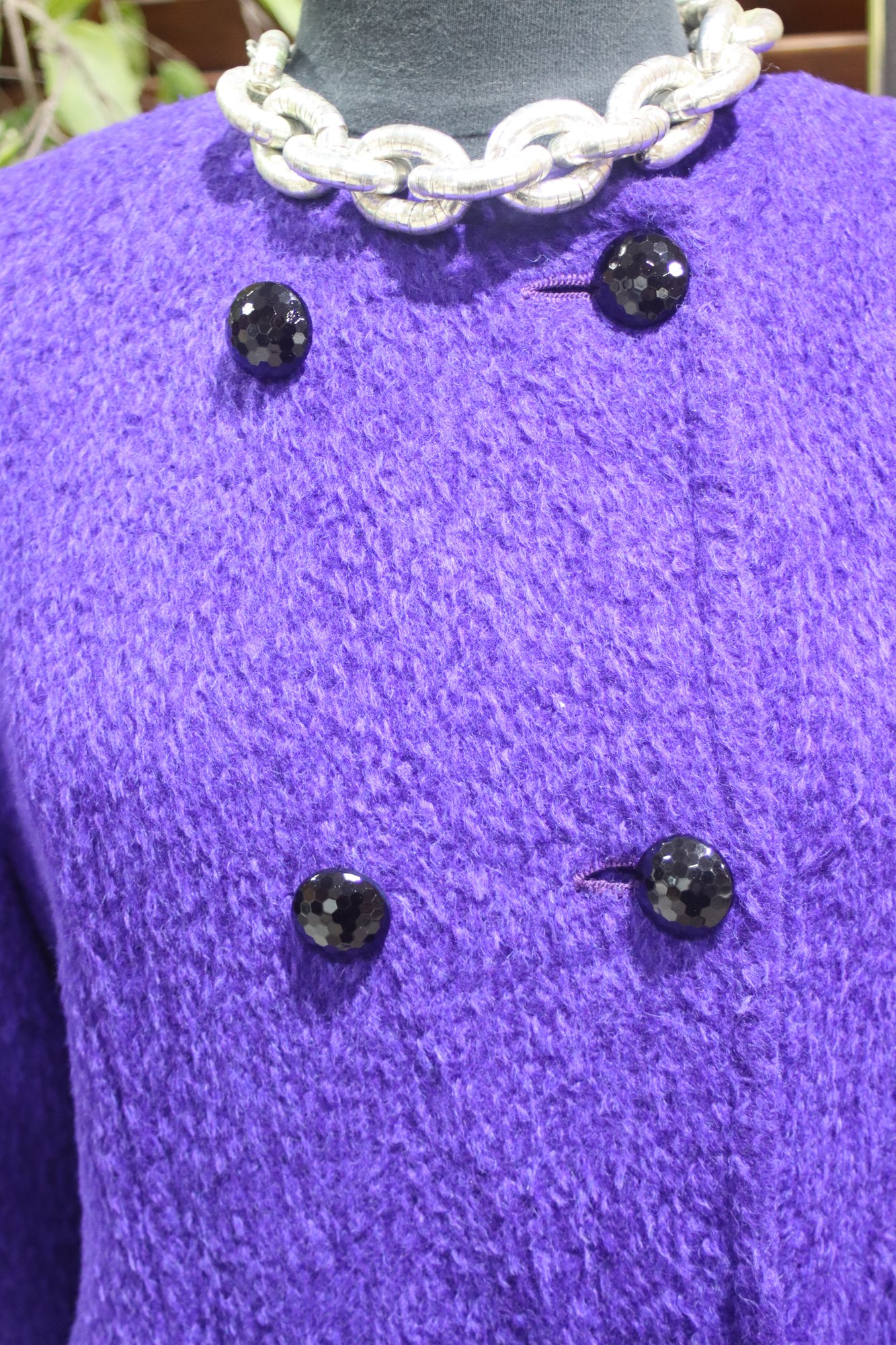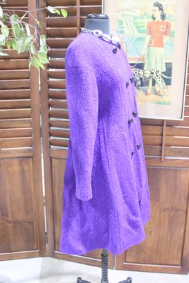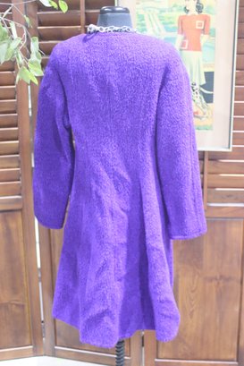 a bold touch of vintage elegance to your wardrobe with this stunning purple bouclé wool coat. Featuring a classic double-breasted design and side pockets, this coat combines style, sophistication, and practicality.