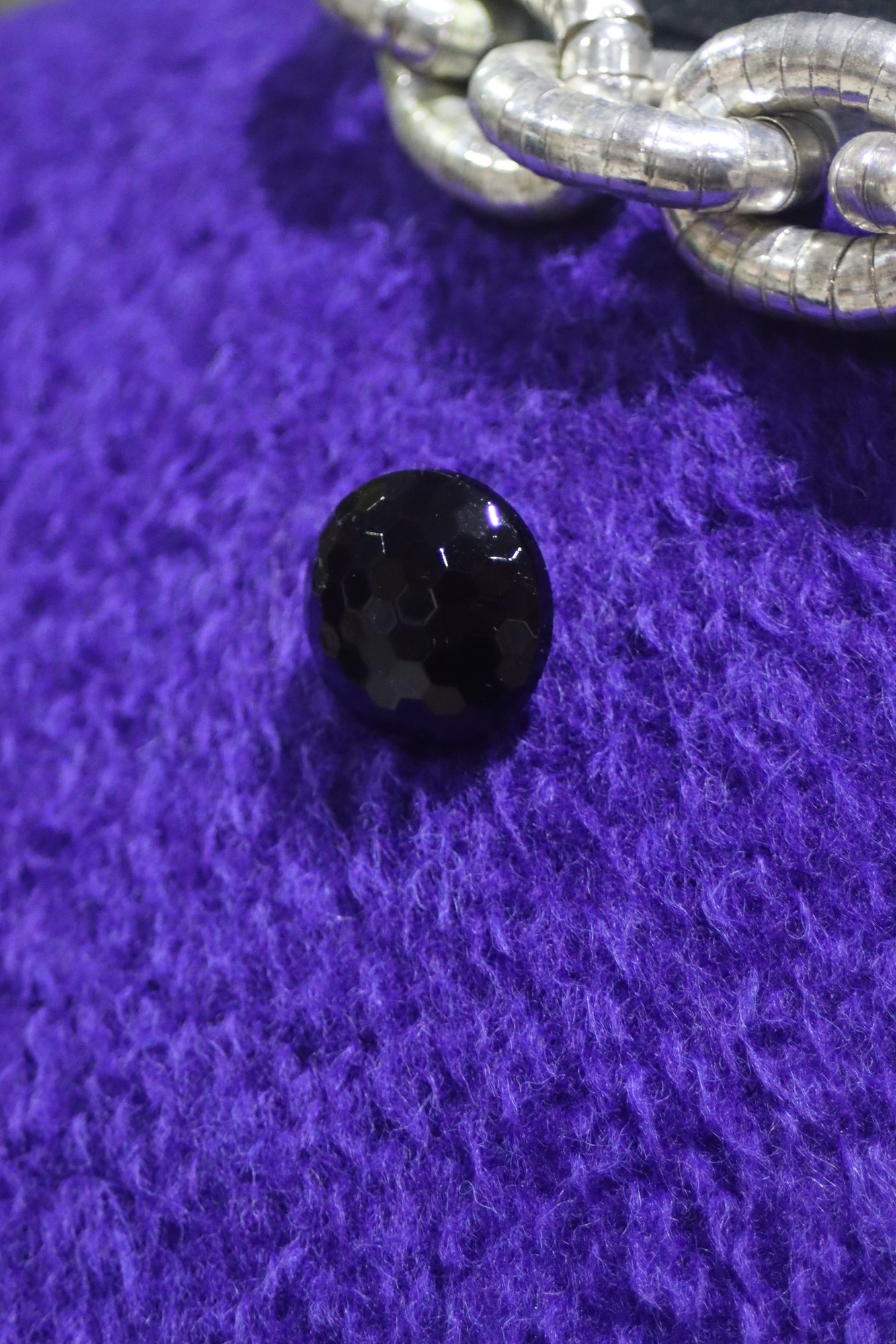 Double-breasted front with six black faceted buttons