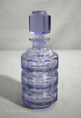 a striking vintage purple glass decanter, measuring approximately 7.5 inches in height. This elegant decanter features a unique stacked design with clear and purple glass layers, adding a modernist touch to its overall appearance. The top is crowned with a bold, cube-shaped stopper that enhances its geometric aesthetic. This piece is a wonderful example of mid-20th-century glass artistry, perfect for collectors or for adding a touch of vintage elegance to any home bar setup. Its vibrant color and distinctive design make it a standout item, ideal for display or functional use.
