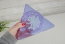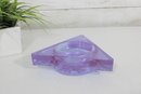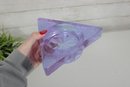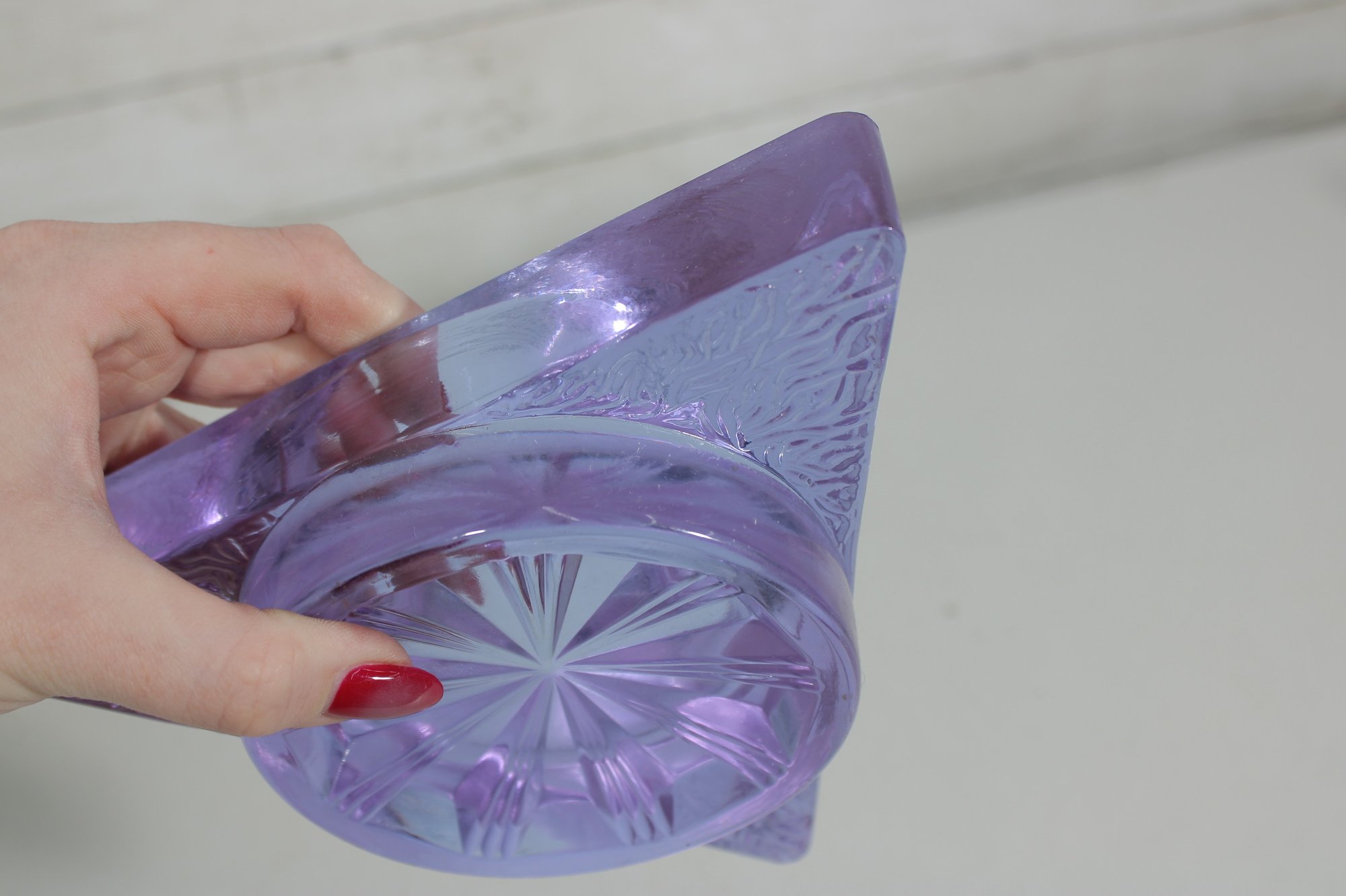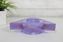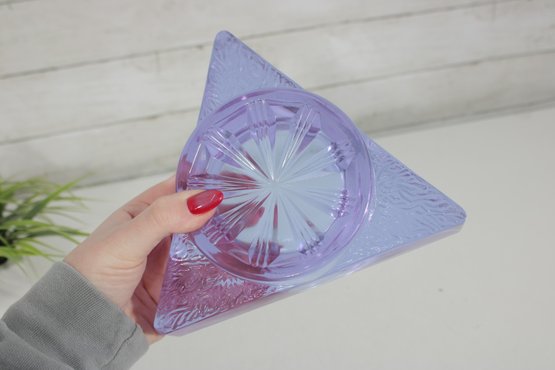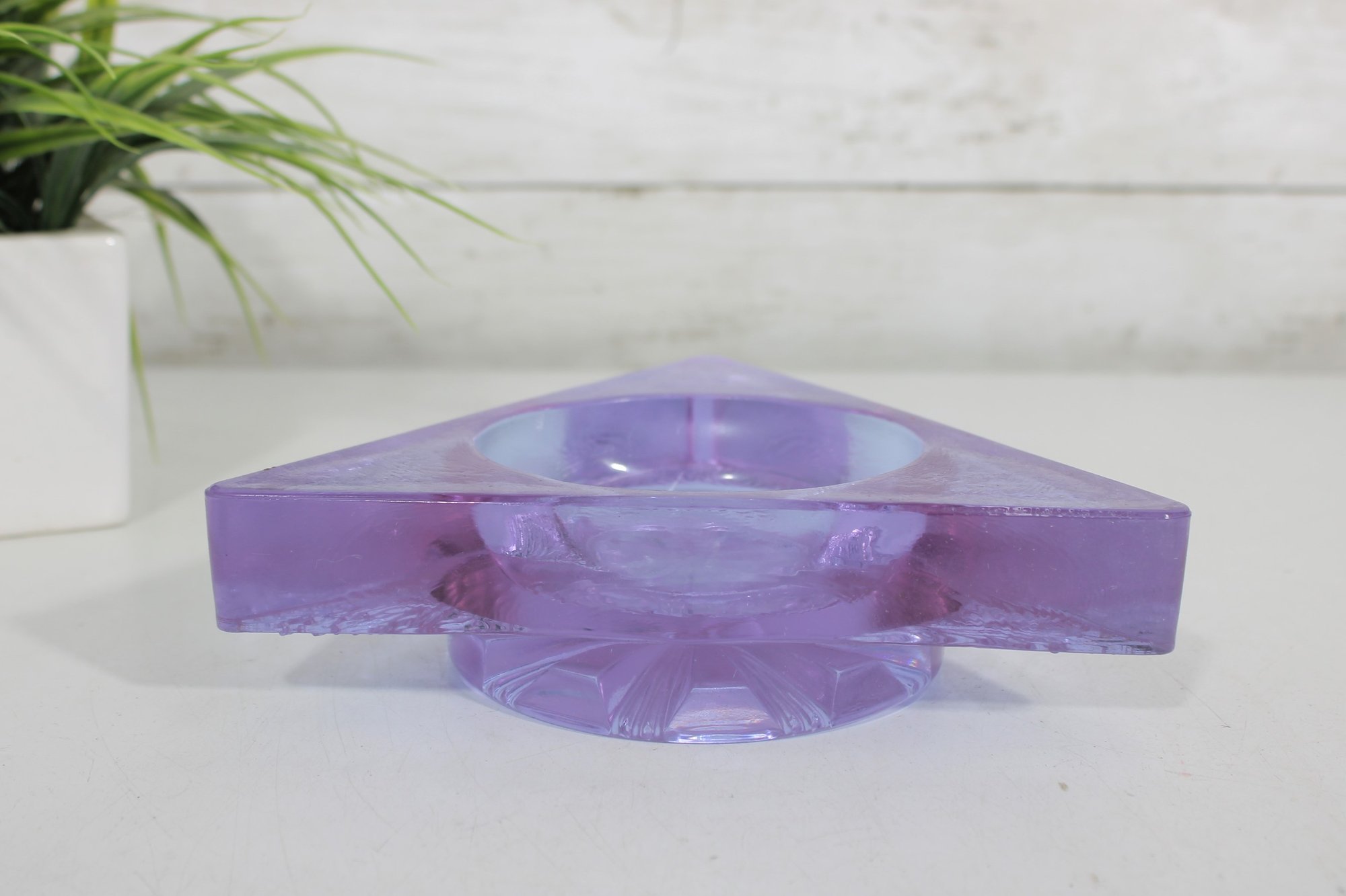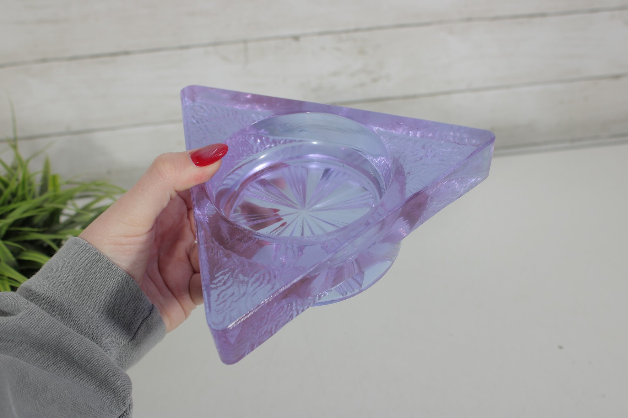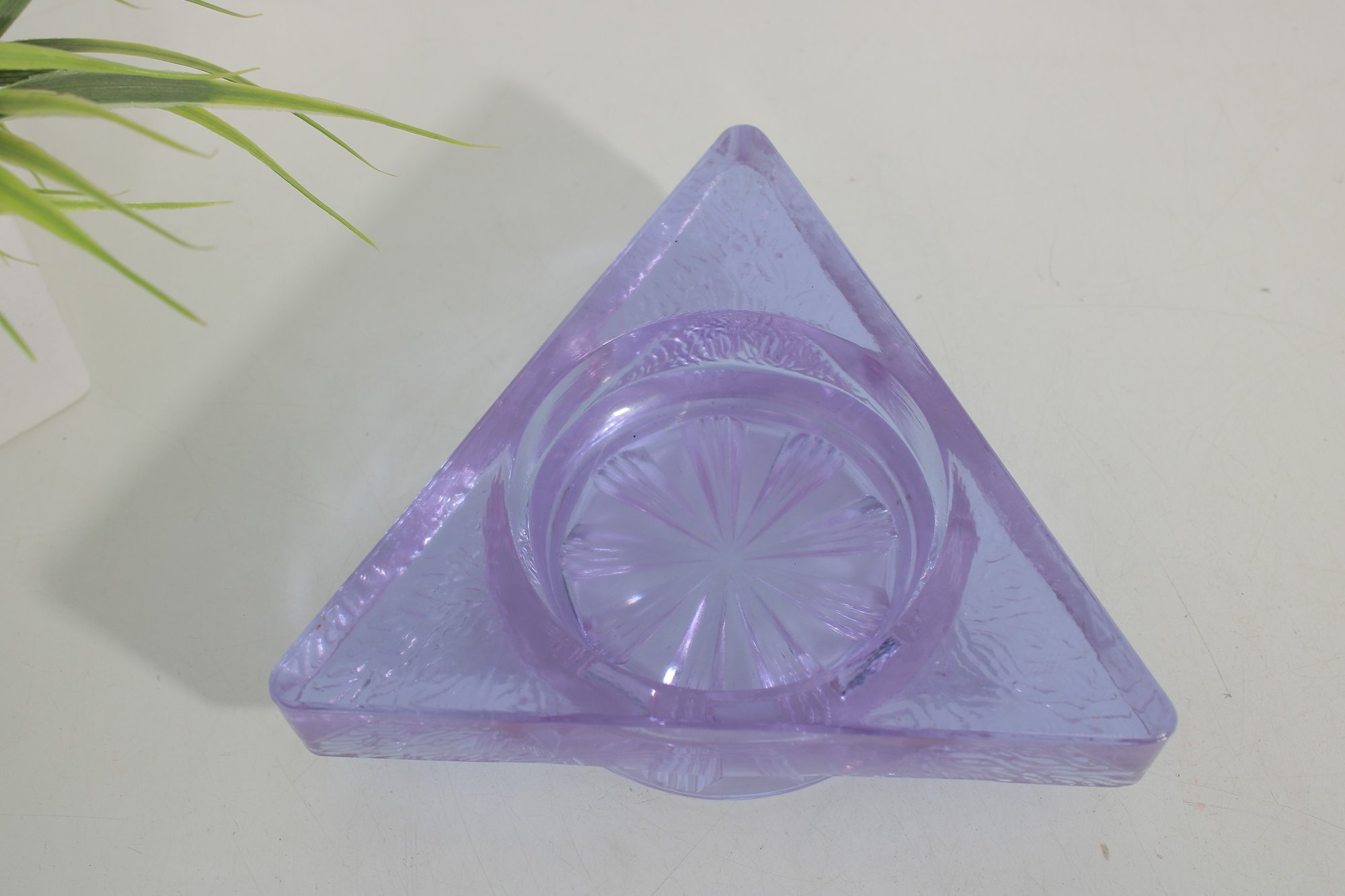 Striking and unique, this vintage pressed glass ashtray features a bold triangular shape in a beautiful translucent purple hue. Measuring approximately 7" x 6" and 2" tall, it showcases an eye-catching starburst pattern in the center with textured detailing along the sides, giving it a classic mid-century modern appeal.