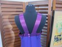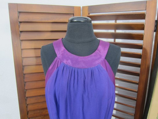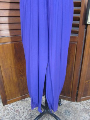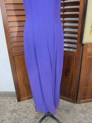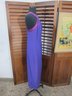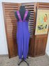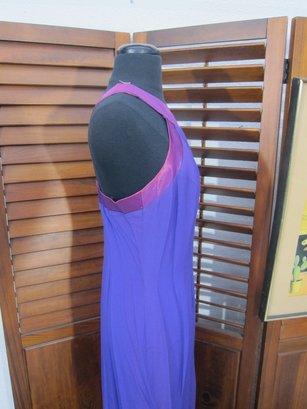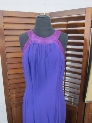 vintage evening gown in a rich purple hue, featuring a halter-style neckline with contrasting satin trim. The bodice has soft gathered detailing that flows into a long, streamlined skirt, creating a flattering and graceful silhouette.