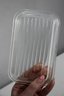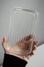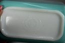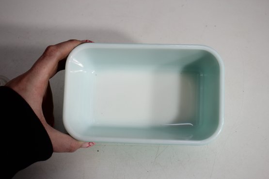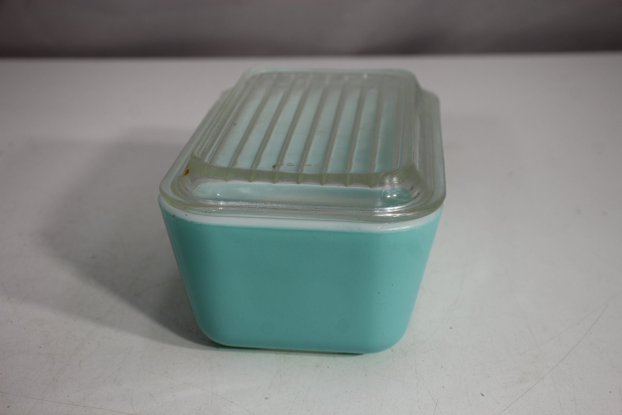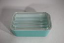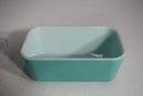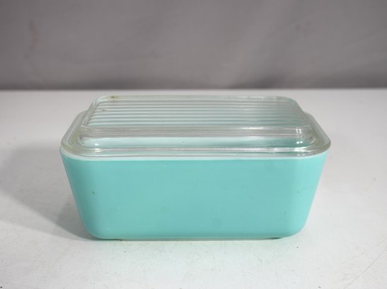 A beautiful vintage Pyrex refrigerator dish in a striking aqua blue color with a clear ribbed glass lid. This classic collectible piece is perfect for both display and everyday use. The vibrant exterior contrasts with the crisp white interior, creating a timeless mid-century aesthetic.