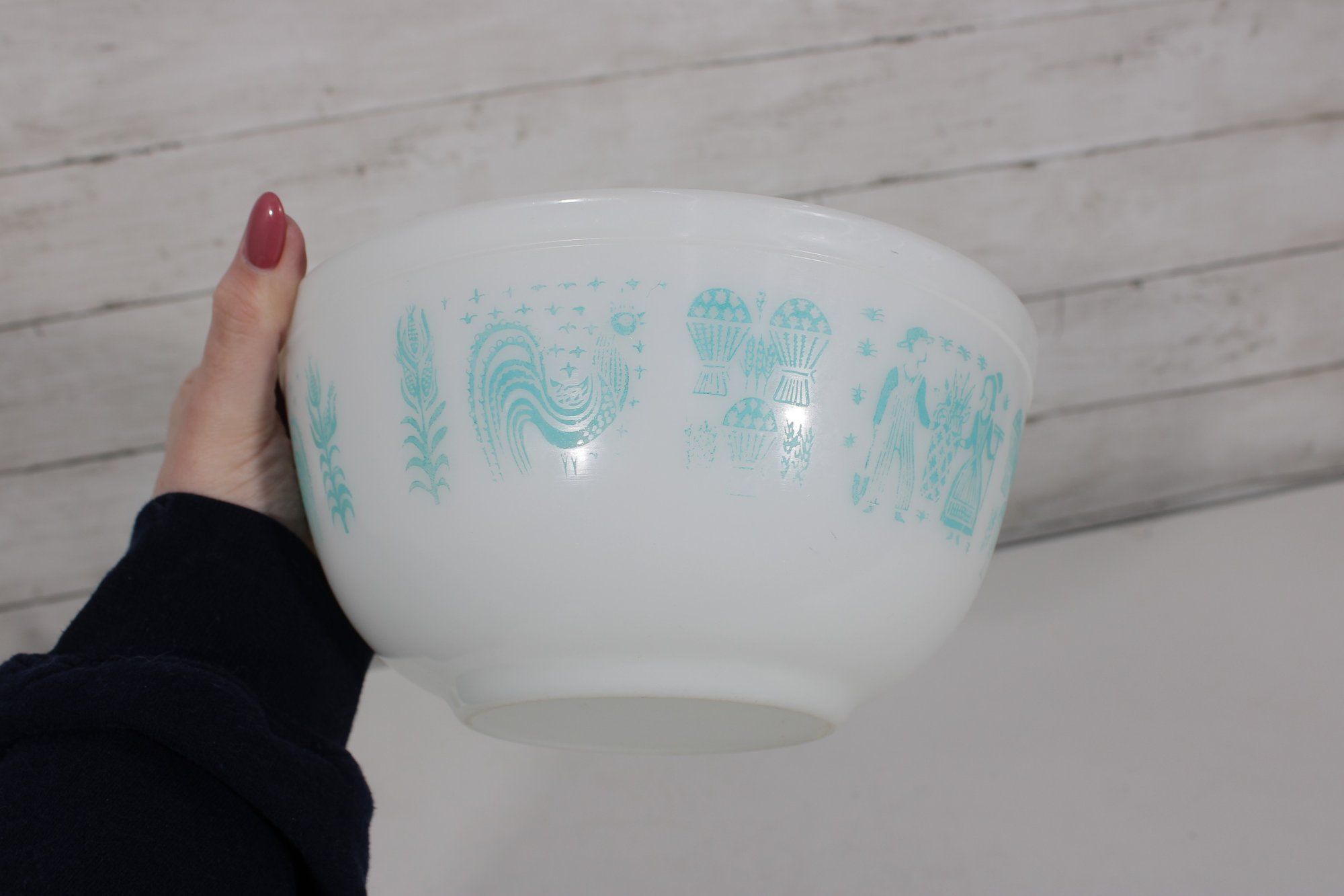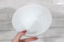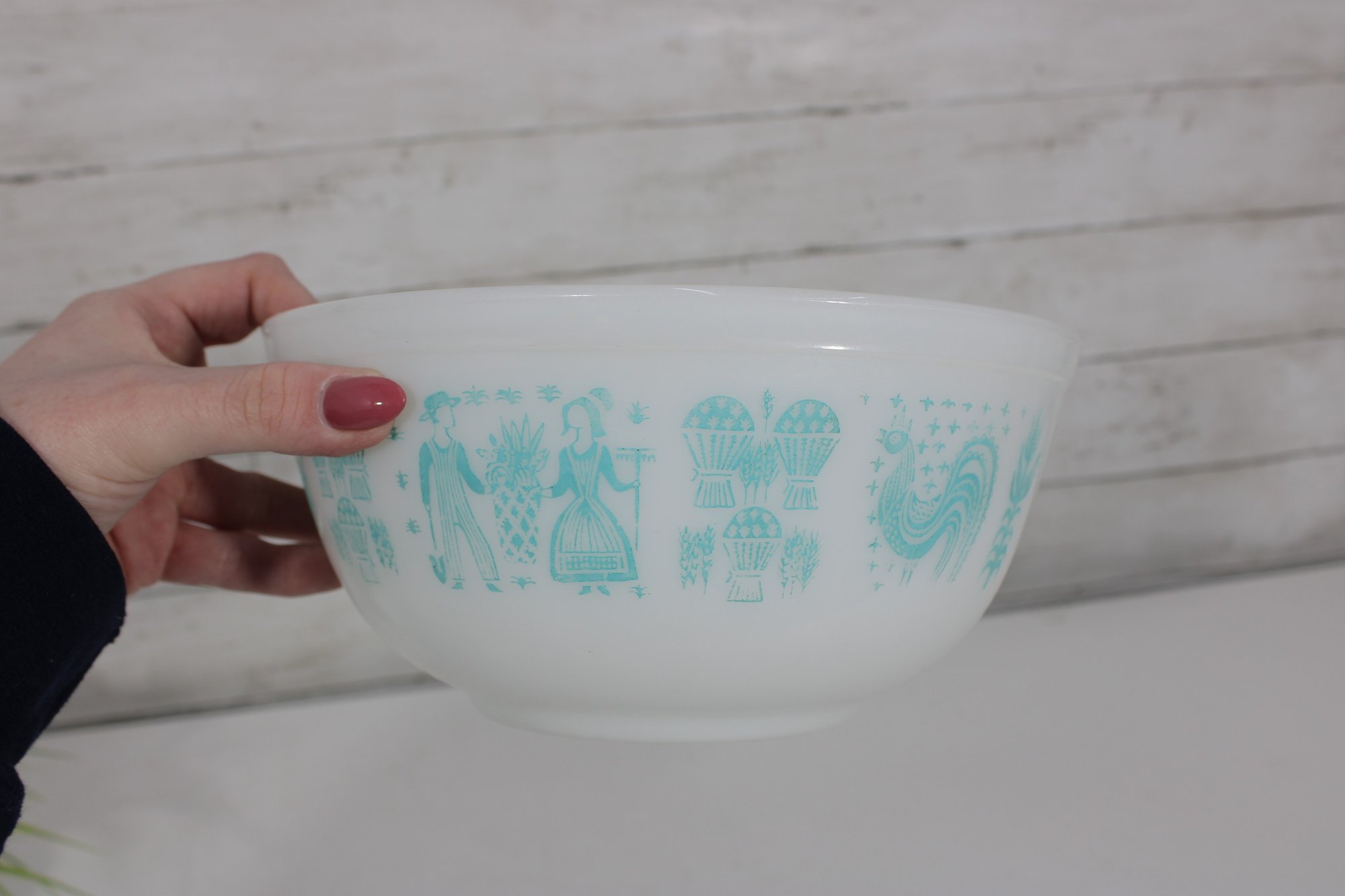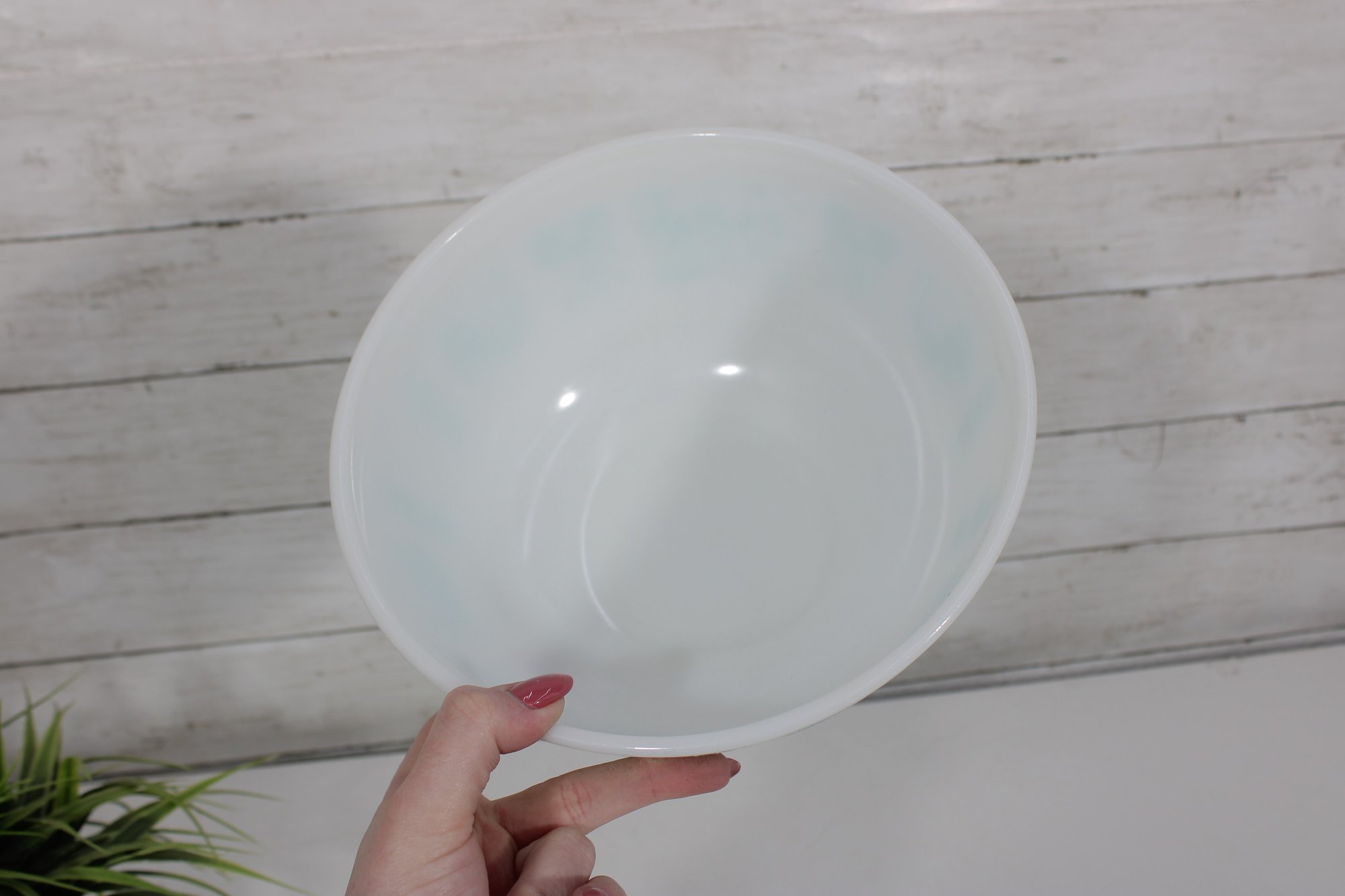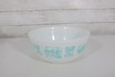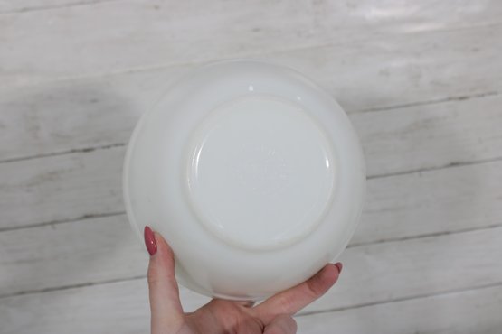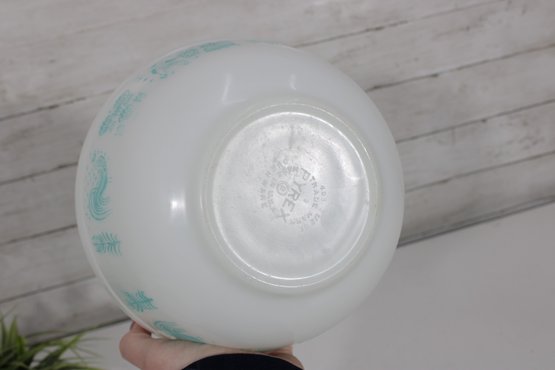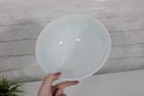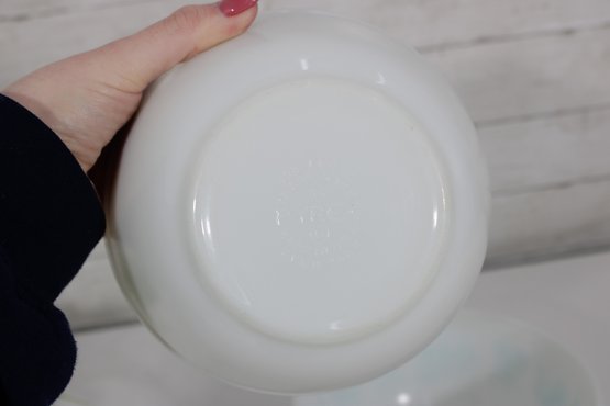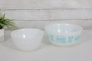 Nice lot of two vintage milk glass mixing bowls, including one plain white bowl and one larger bowl with aqua blue decorative patterning around the exterior. A charming pair for kitchen use, display, or addition to a vintage glass collection.