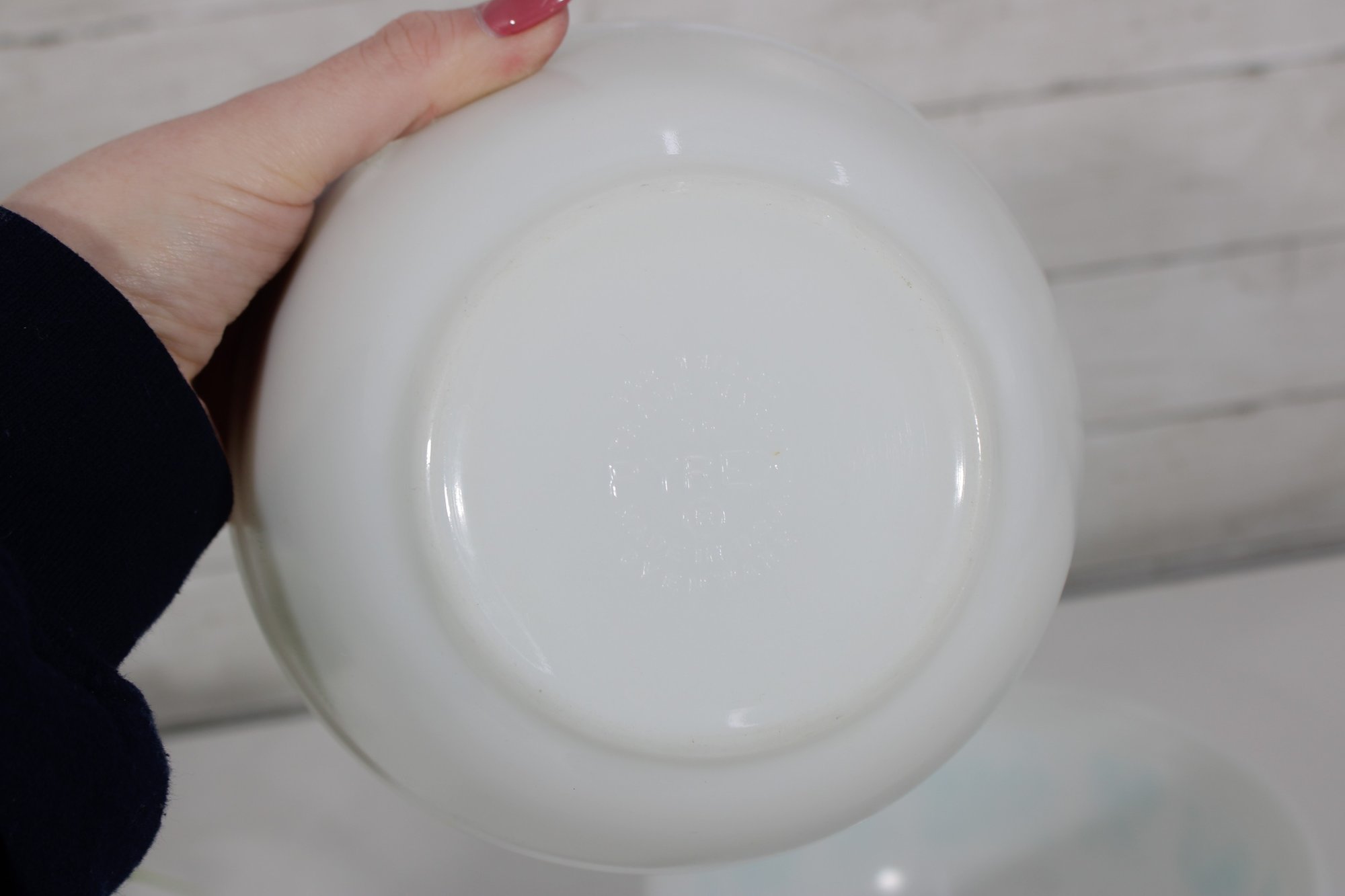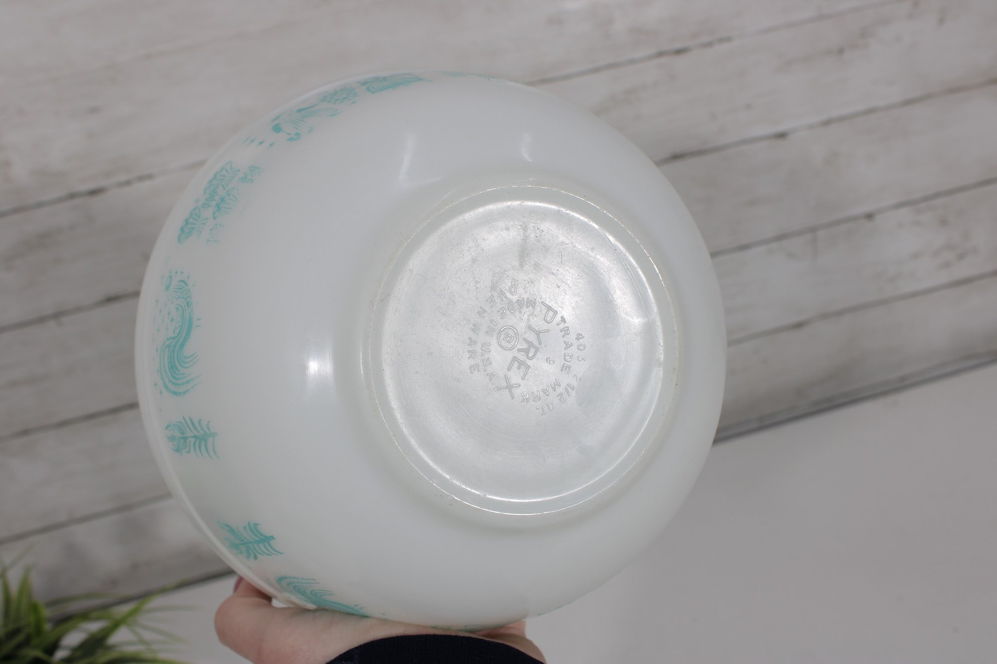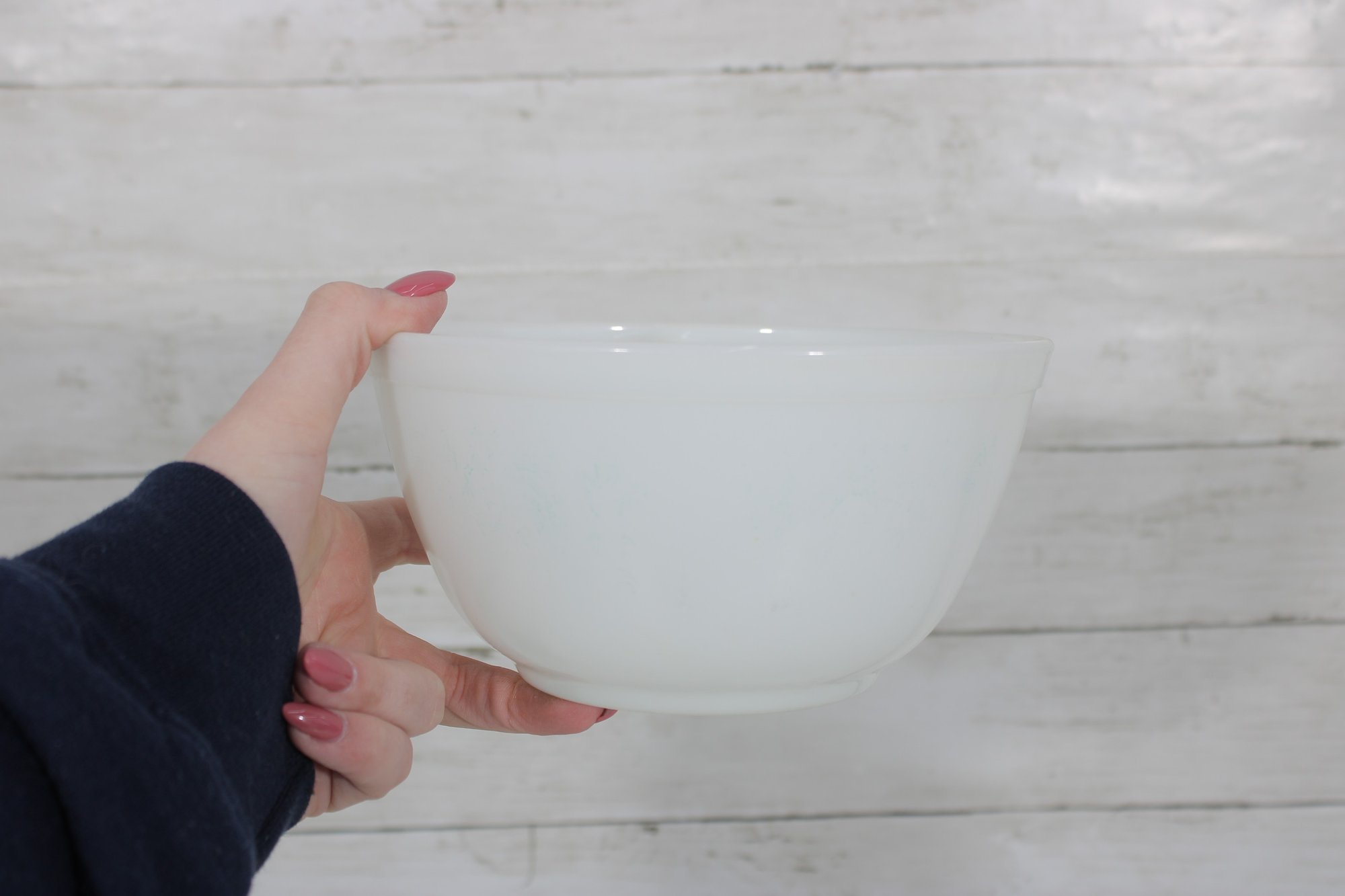 Nice lot of two vintage milk glass mixing bowls, including one plain white bowl and one larger bowl with aqua blue decorative patterning around the exterior. A charming pair for kitchen use, display, or addition to a vintage glass collection.