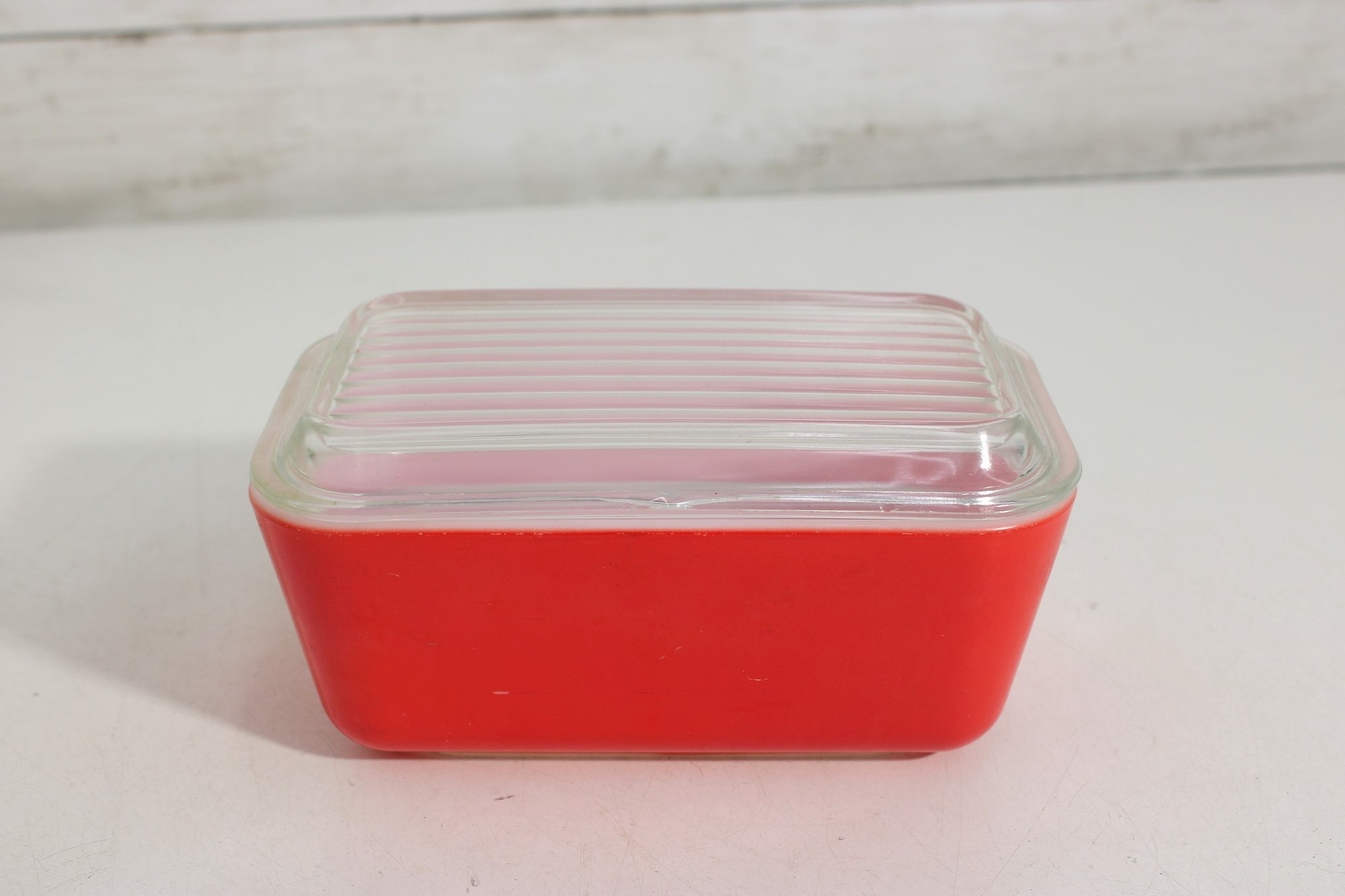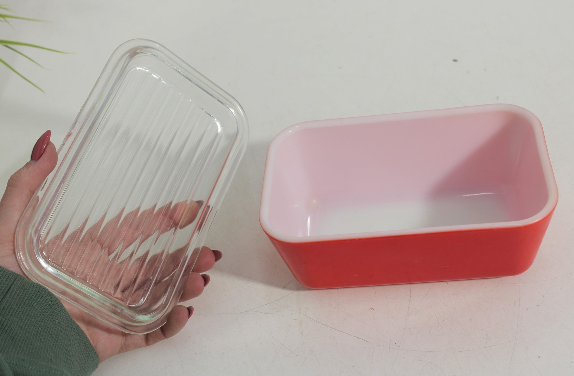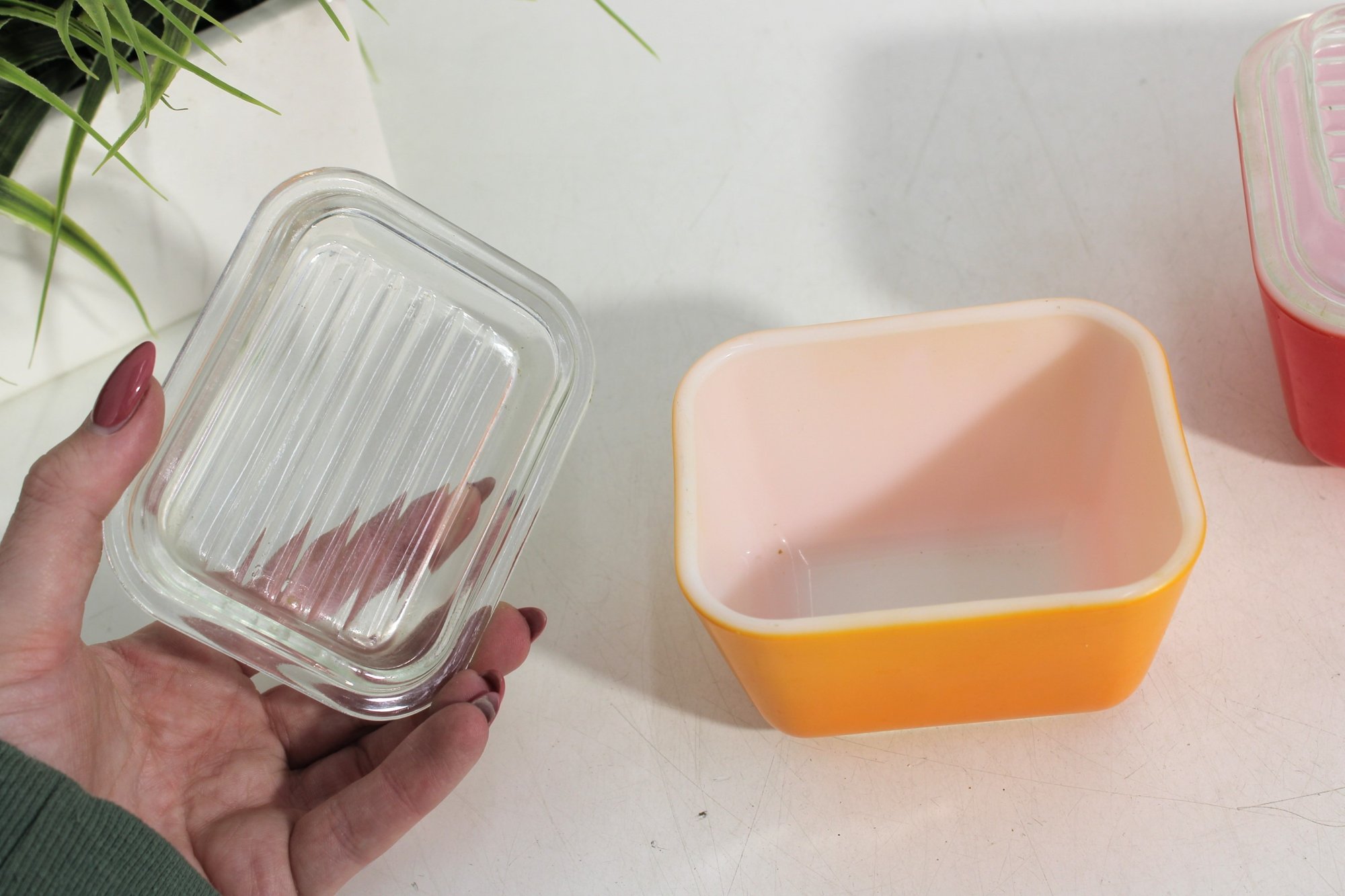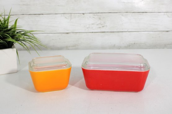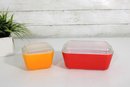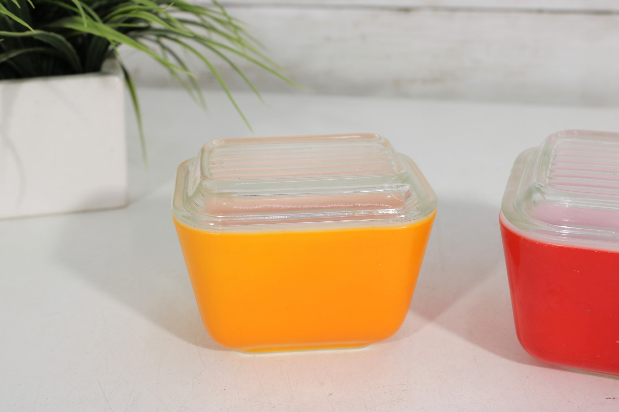 Charming pair of vintage Pyrex refrigerator dishes featuring bright mid-century colors—one in vibrant orange and the other in classic red—each paired with a clear ribbed glass lid. These iconic storage containers are both functional and collectible, perfect for adding retro flair to your kitchen or Pyrex collection.