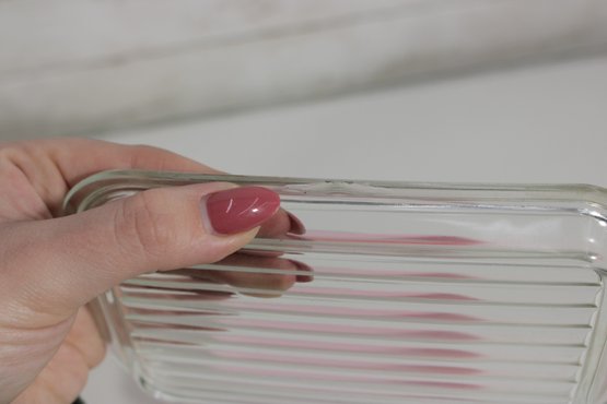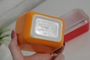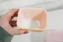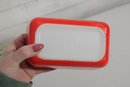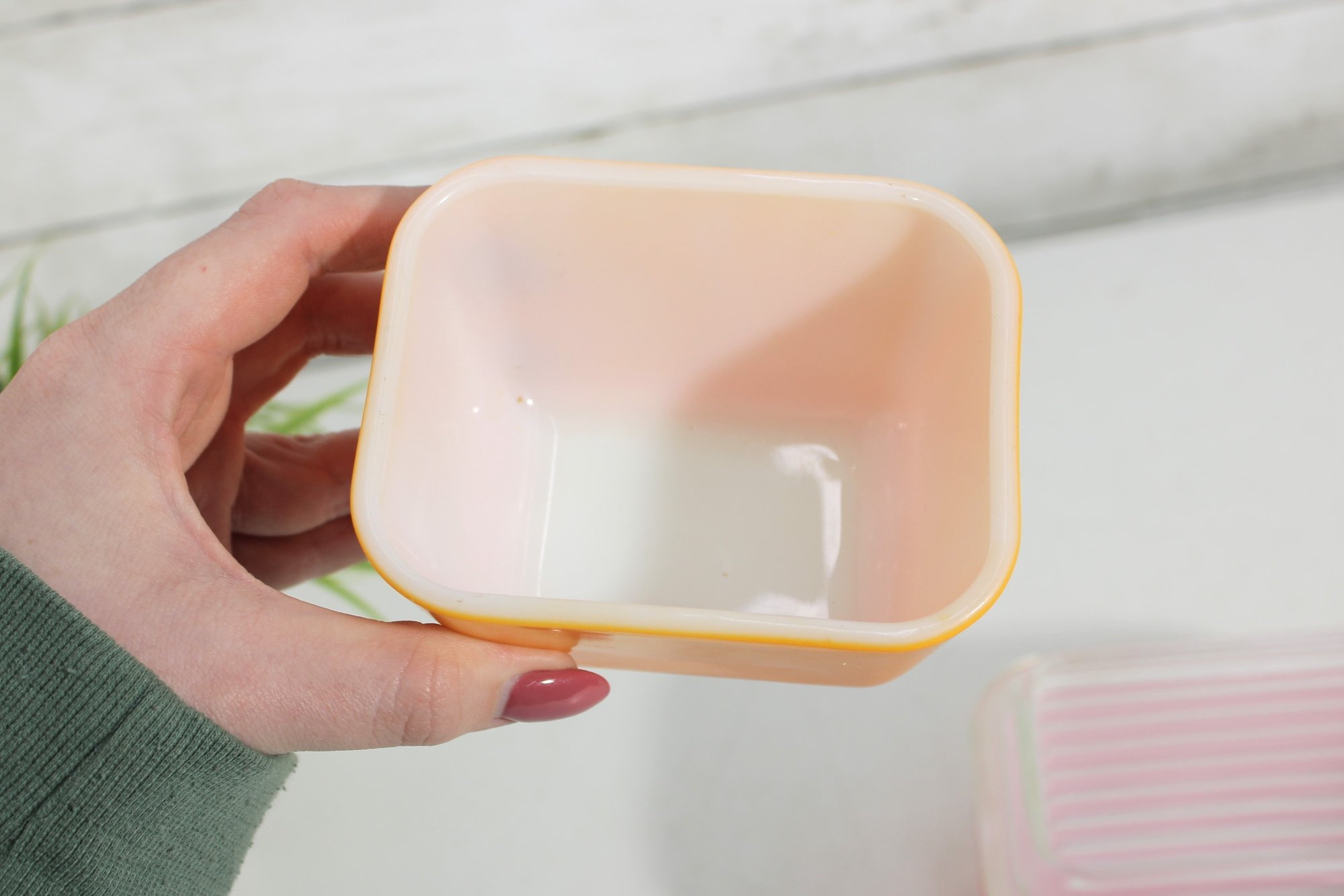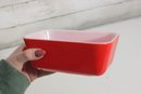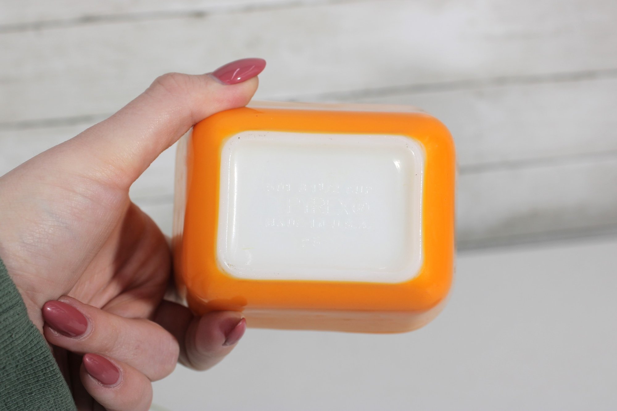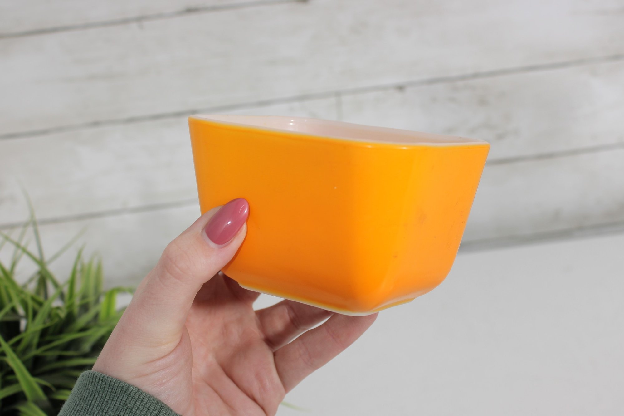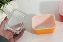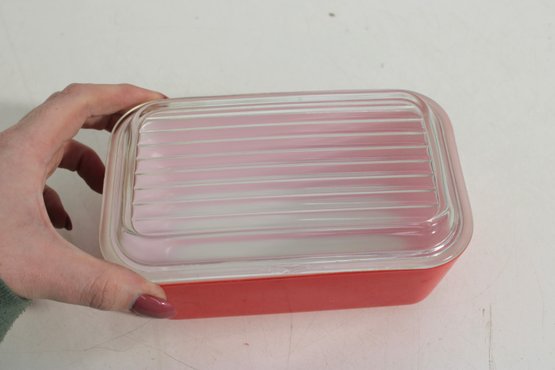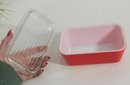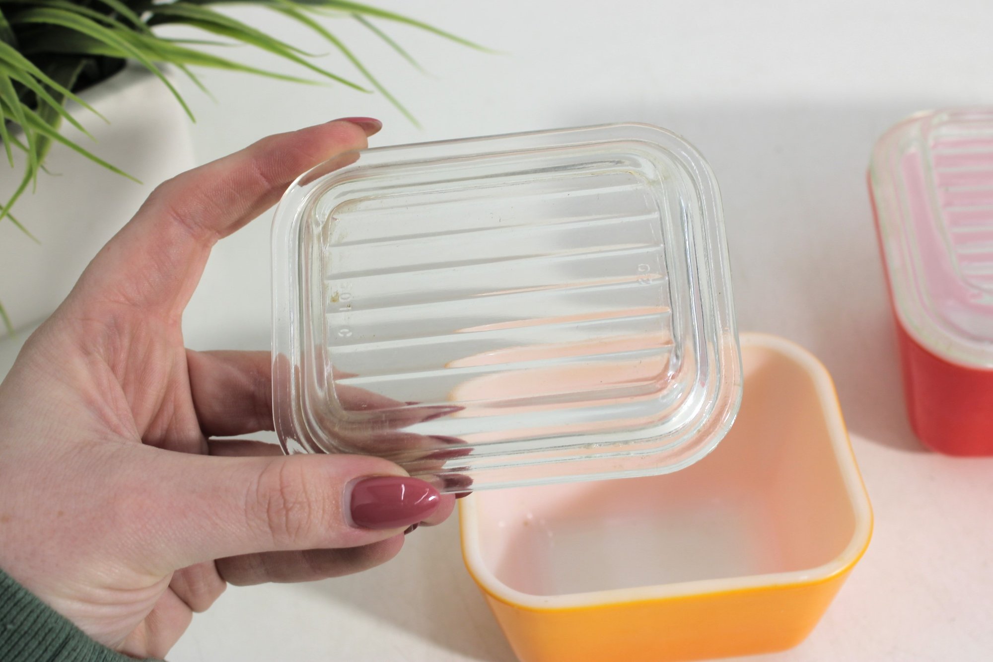 Charming pair of vintage Pyrex refrigerator dishes featuring bright mid-century colors—one in vibrant orange and the other in classic red—each paired with a clear ribbed glass lid. These iconic storage containers are both functional and collectible, perfect for adding retro flair to your kitchen or Pyrex collection.