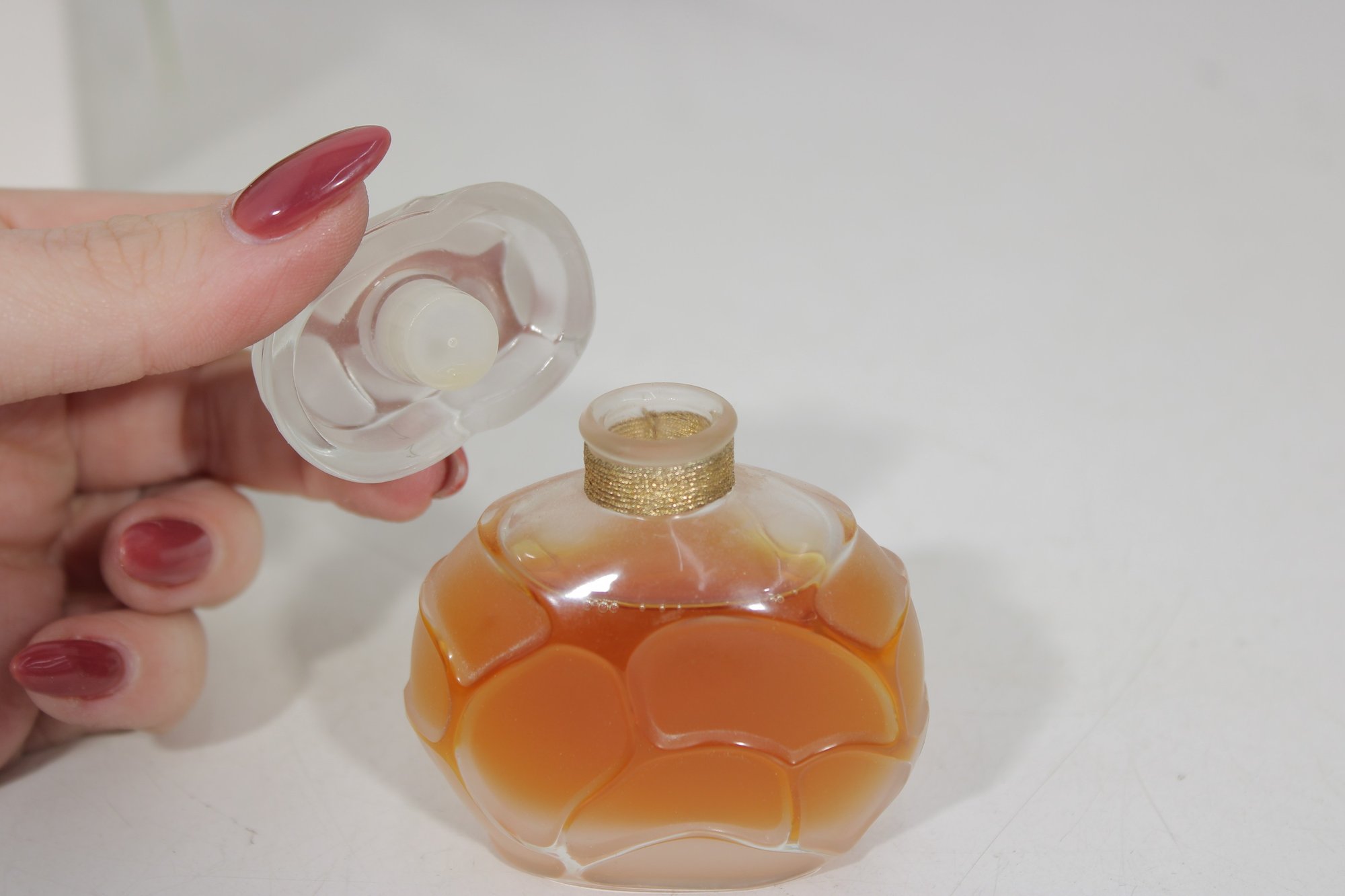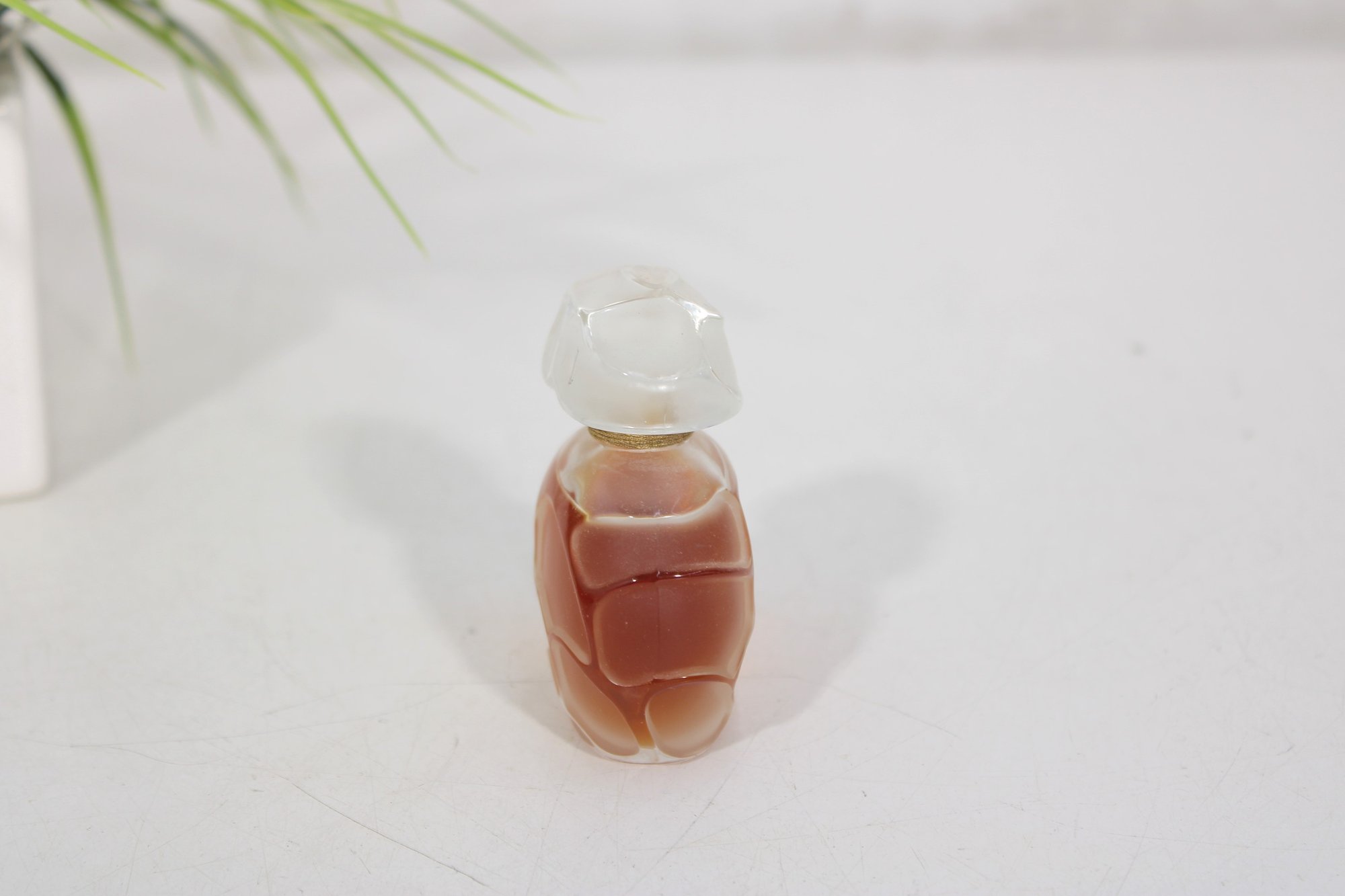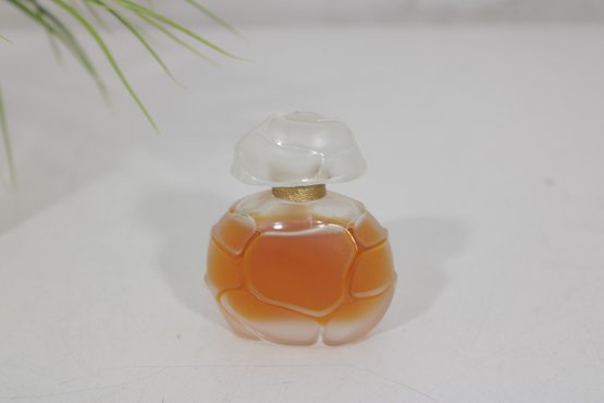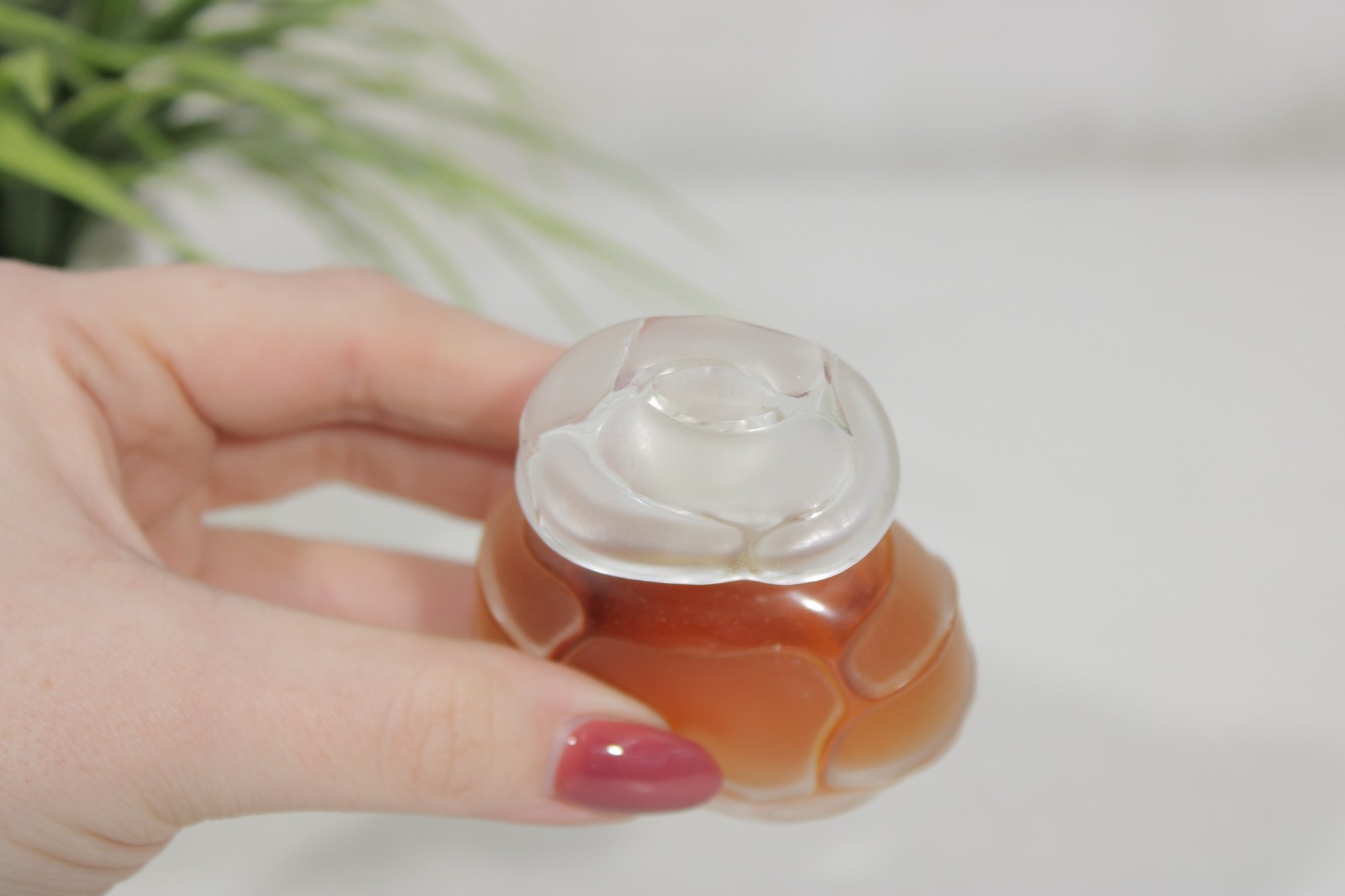 This elegant bottle features the signature rounded “petal” design with frosted detailing and a clear sculpted cap. The warm amber hue of the perfume enhances its beautiful vintage presentation.