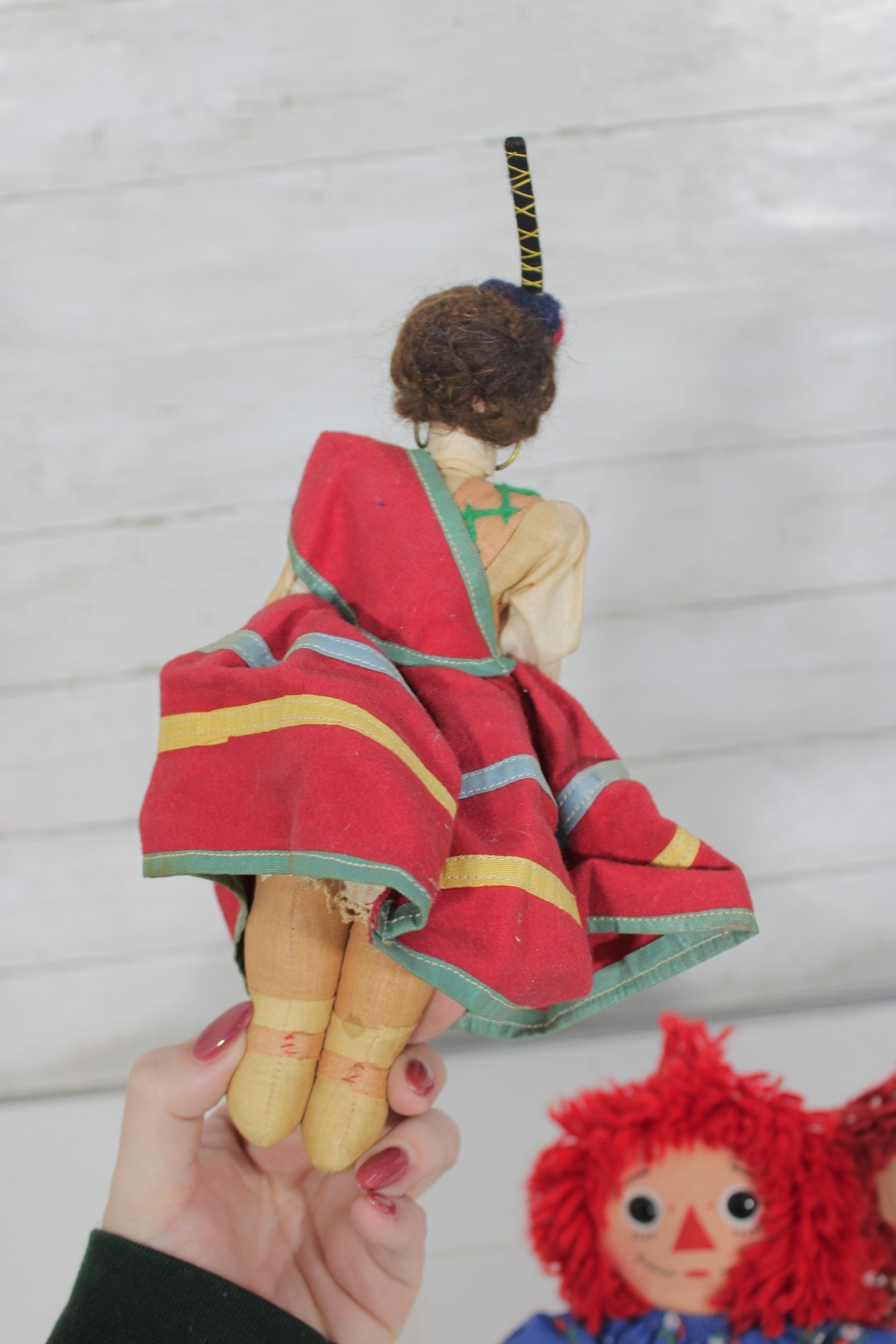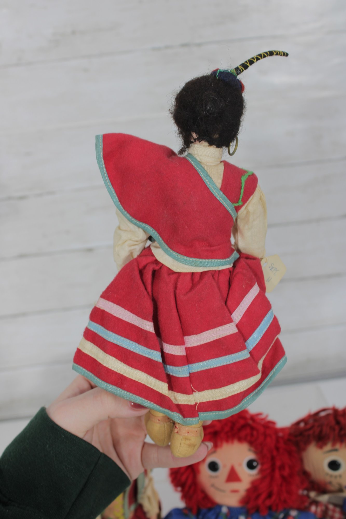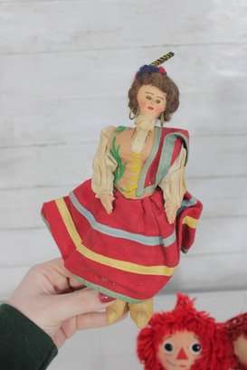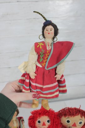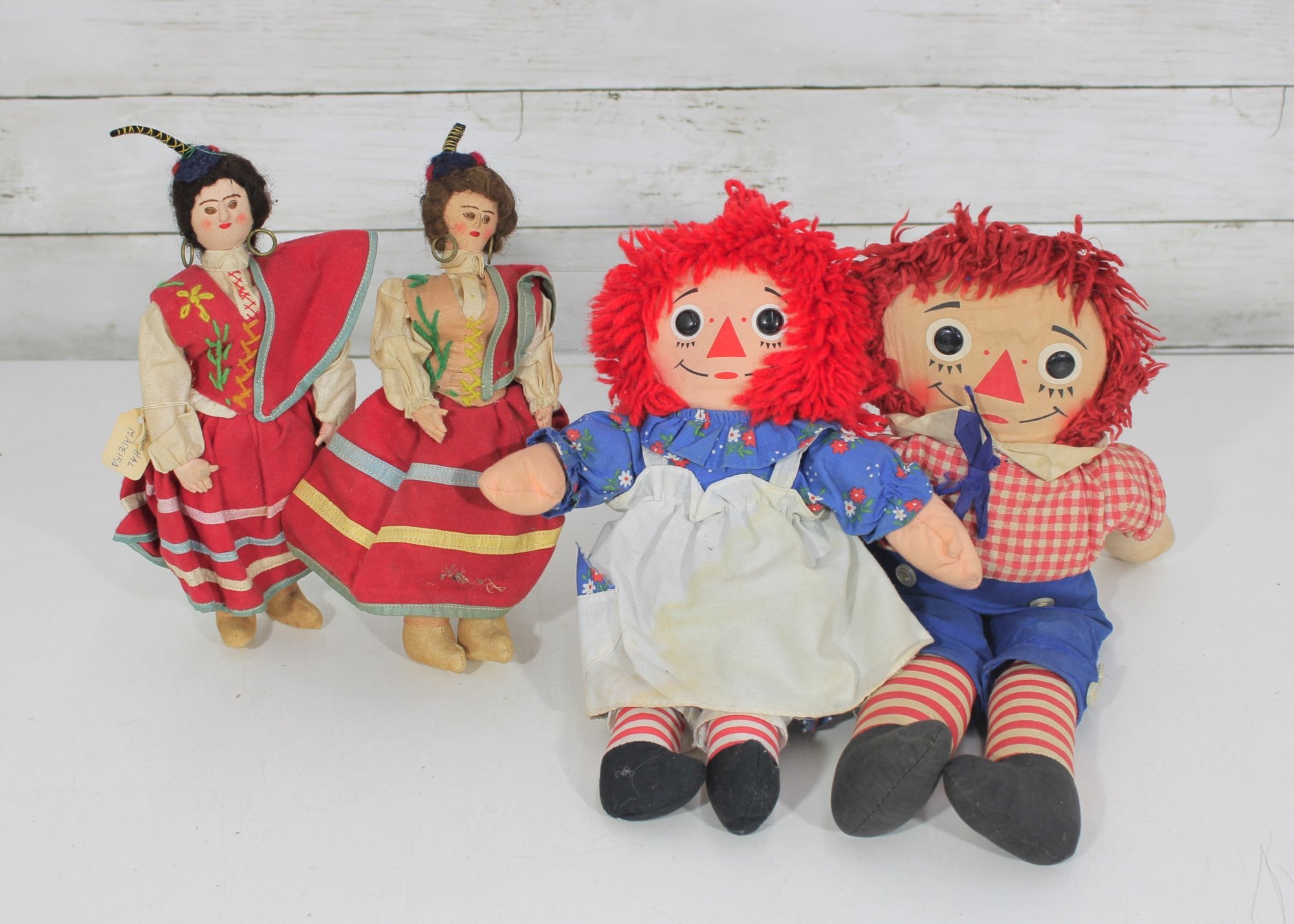 Charming vintage doll collection featuring classic Raggedy Ann & Andy cloth dolls along with two beautifully dressed international/folk costume dolls. A wonderful nostalgic lot for collectors or decorative display.