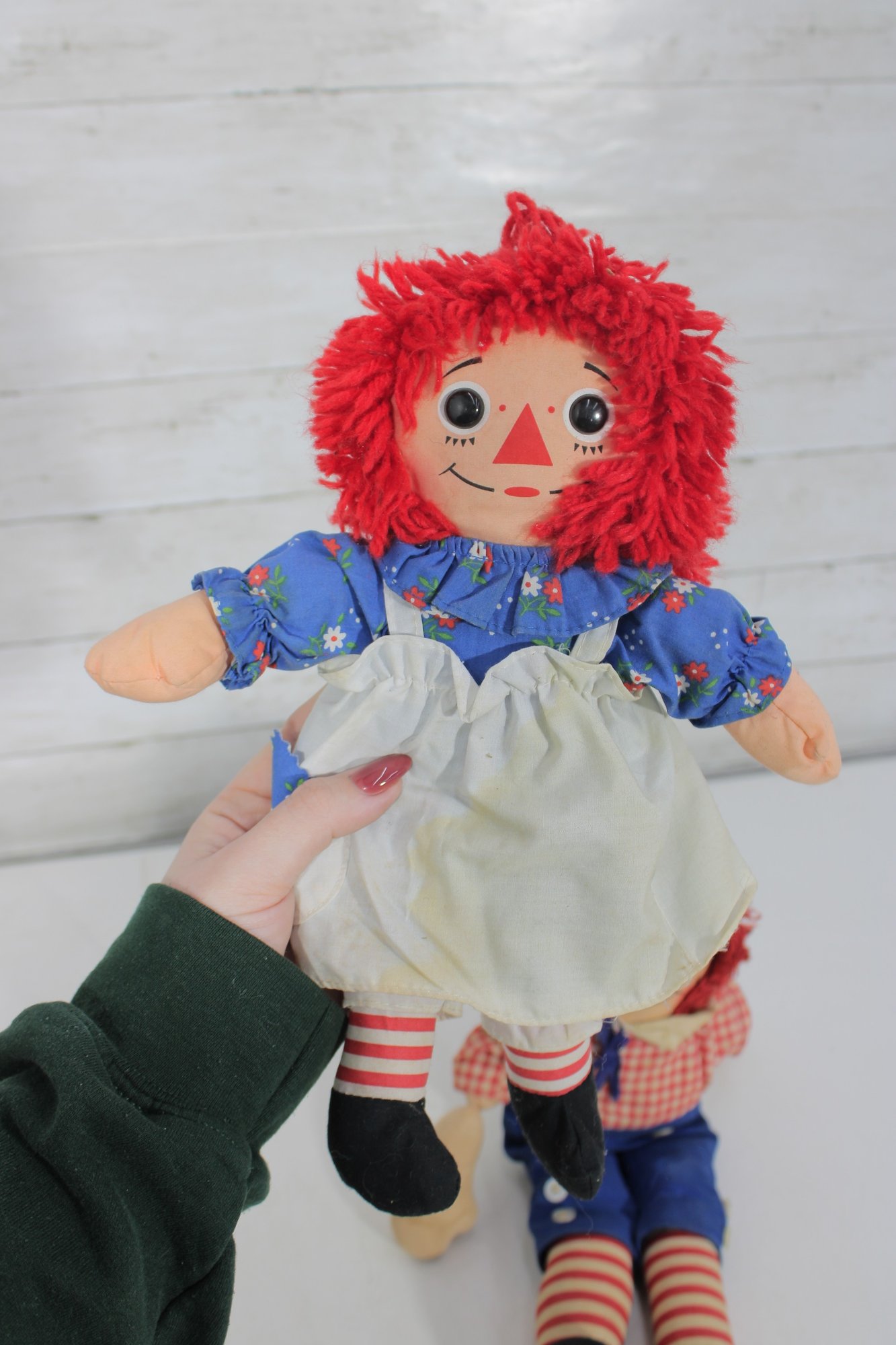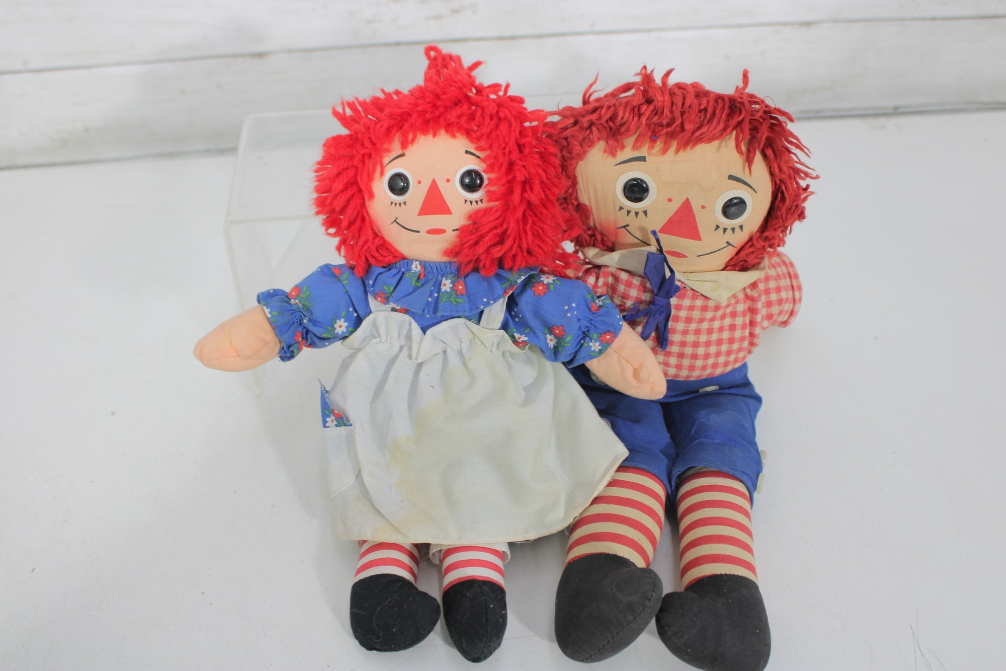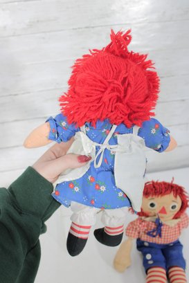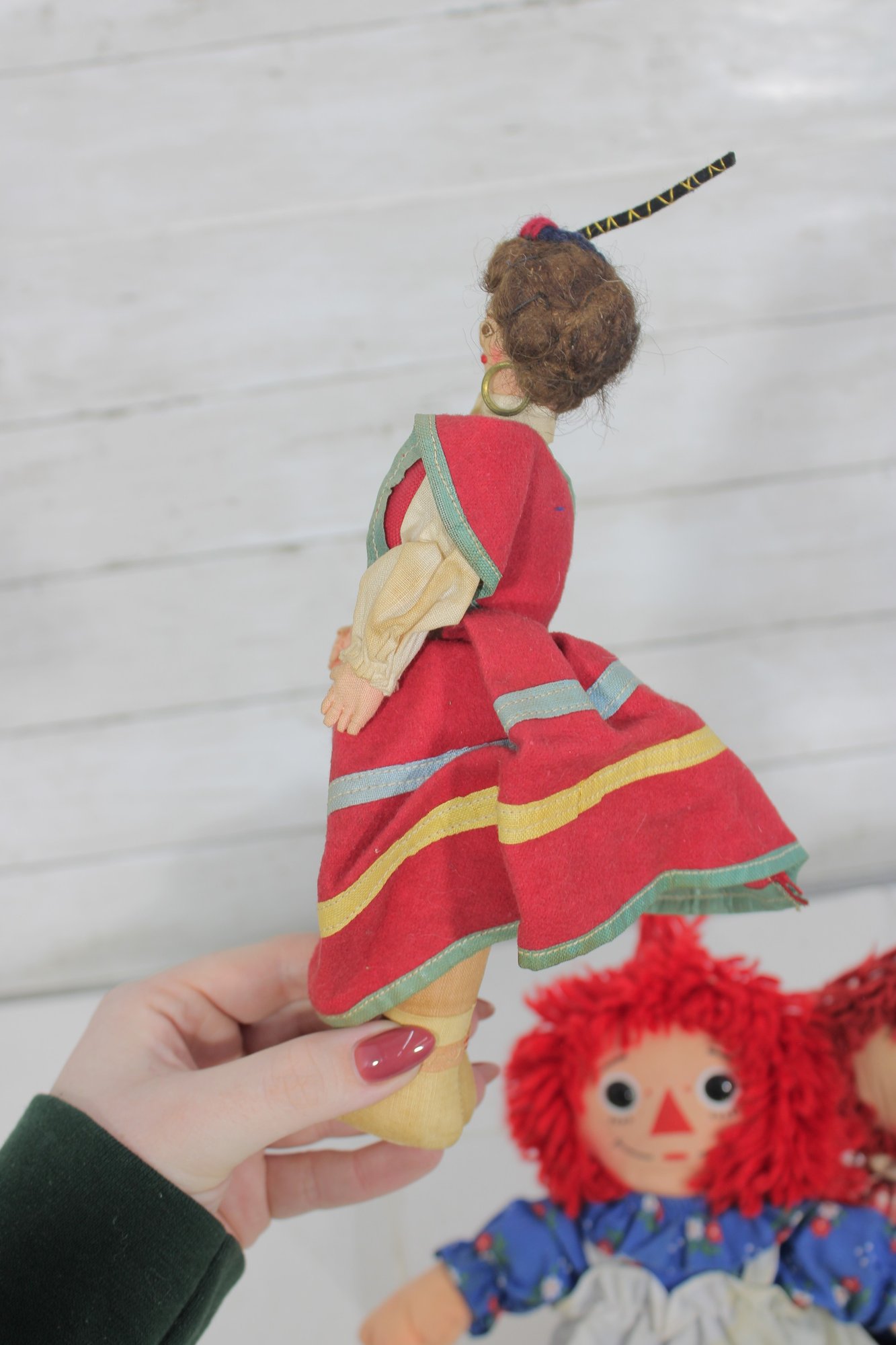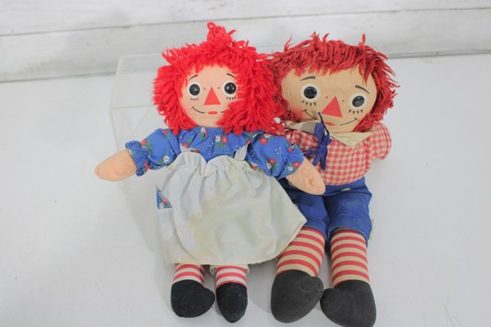 Charming vintage doll collection featuring classic Raggedy Ann & Andy cloth dolls along with two beautifully dressed international/folk costume dolls. A wonderful nostalgic lot for collectors or decorative display.