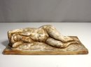 vintage plaster sculpture of a reclining female nude captures the serene beauty and natural form of the human body. The figure is delicately modeled in a relaxed, reclined position, resting on her side with one arm extended over her head. The textured surface and subtle gold and earthy tones enhance the sculptural details, giving it a warm, timeless quality.