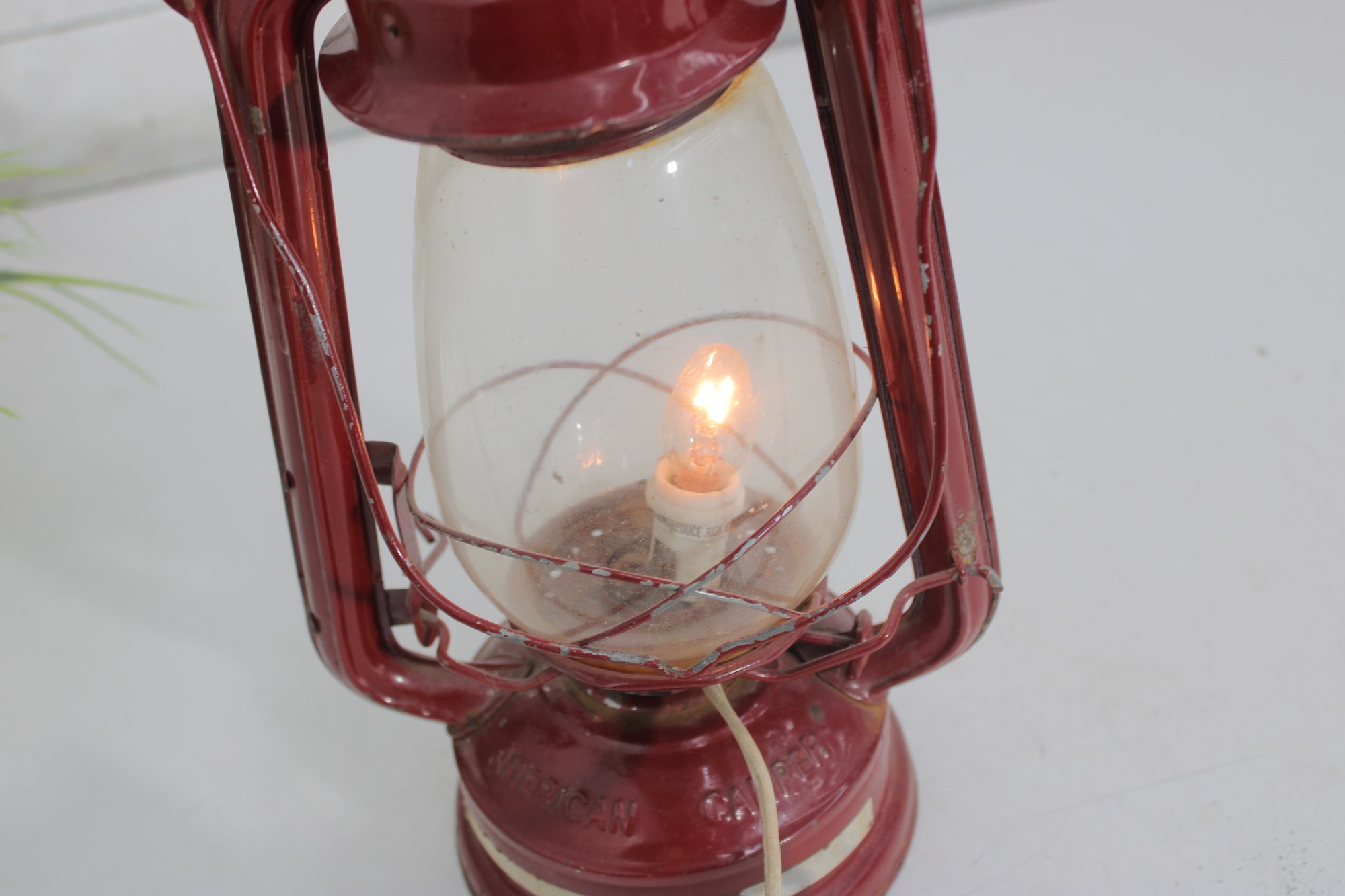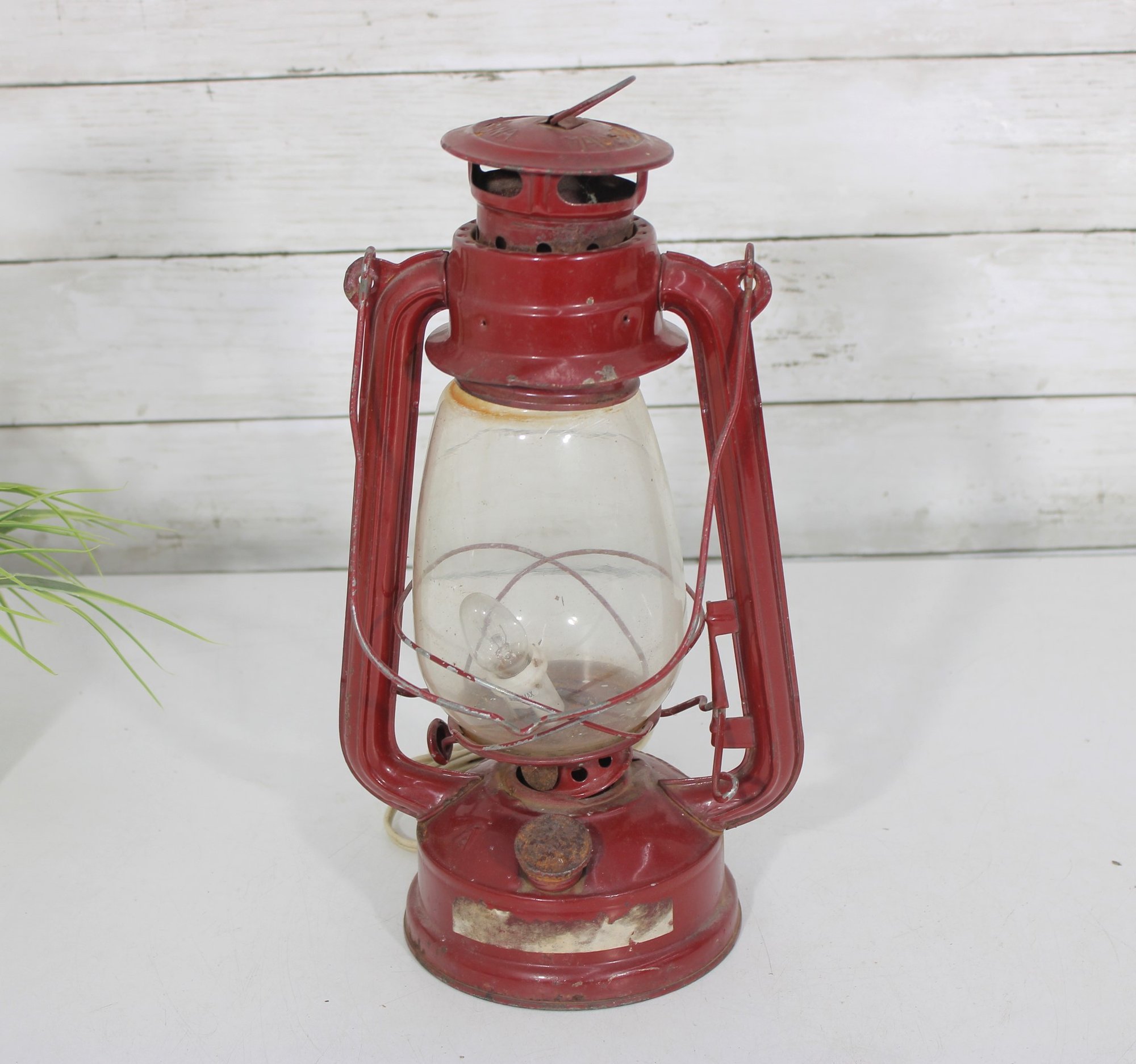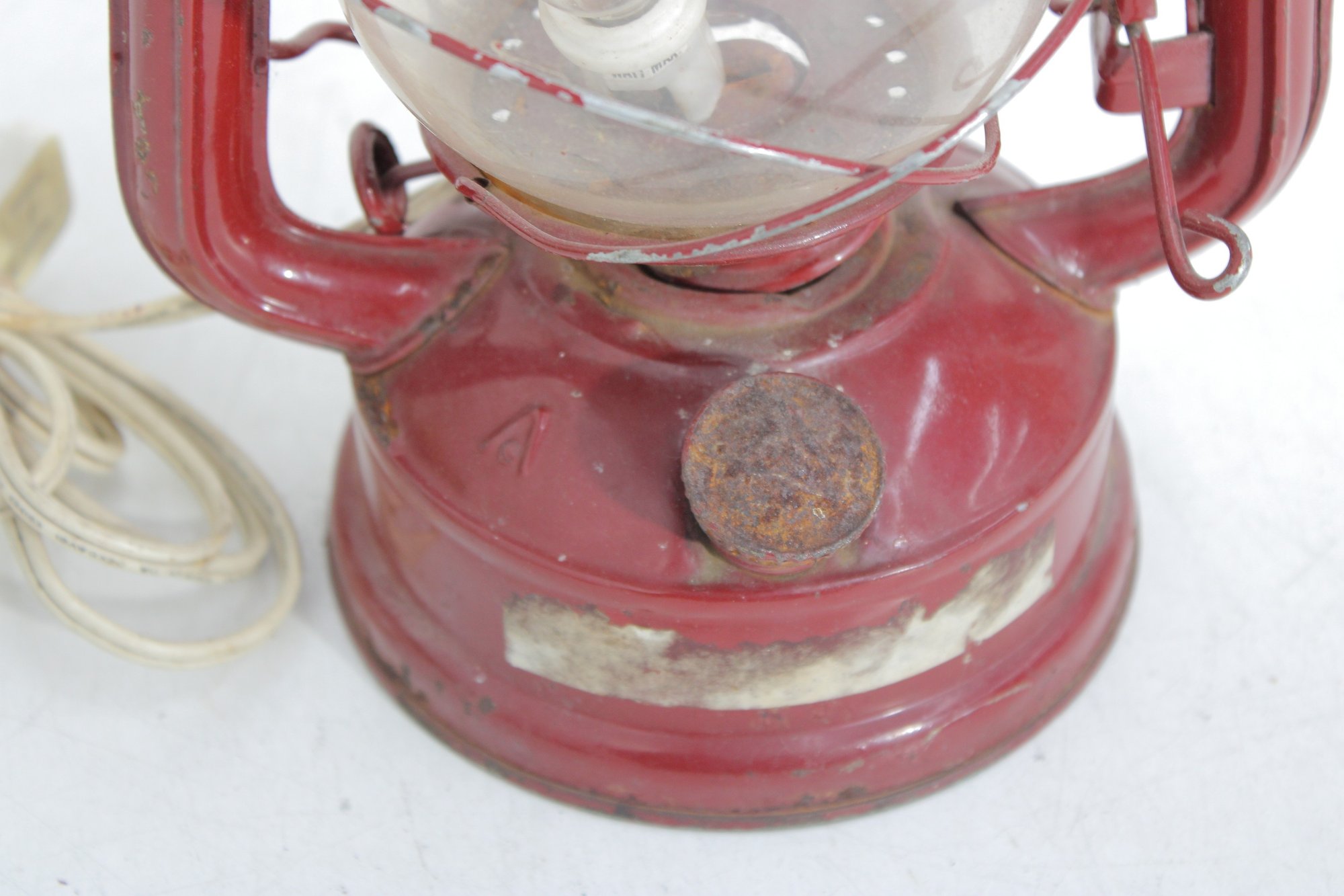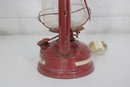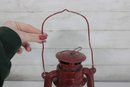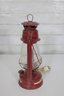 a charming vintage red electric hurricane-style lantern lamp standing approximately 12 inches tall.