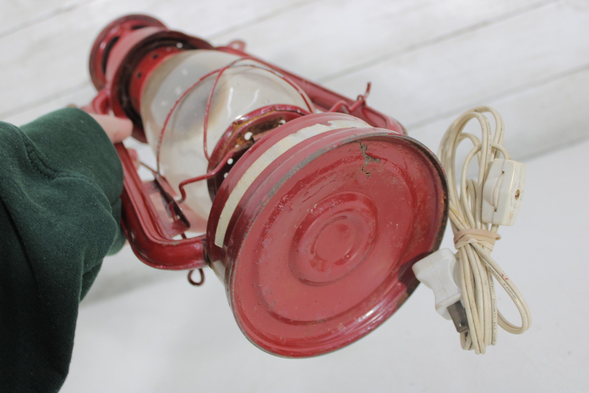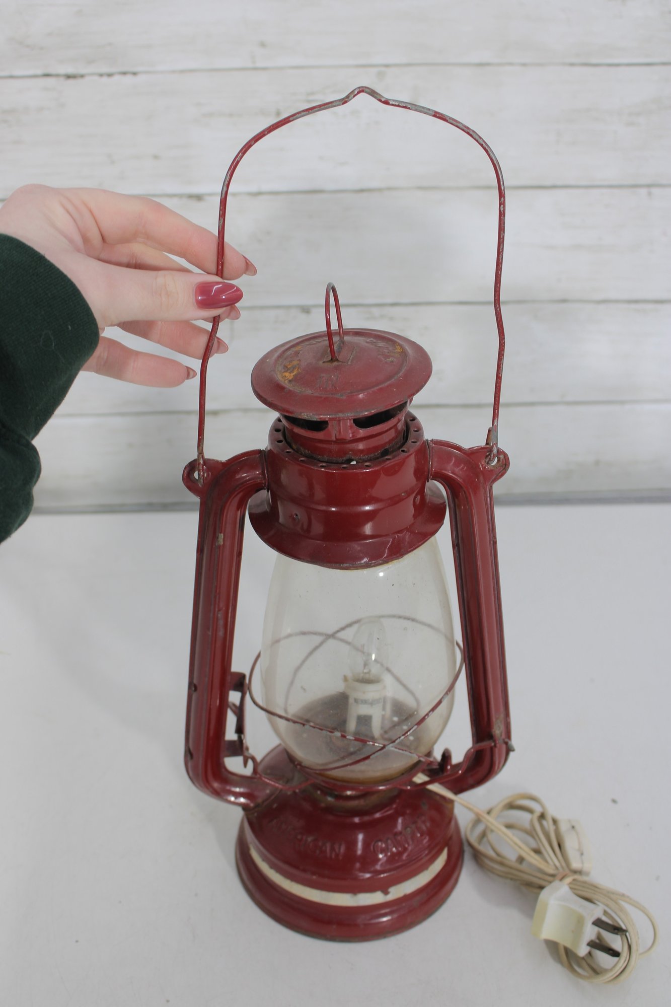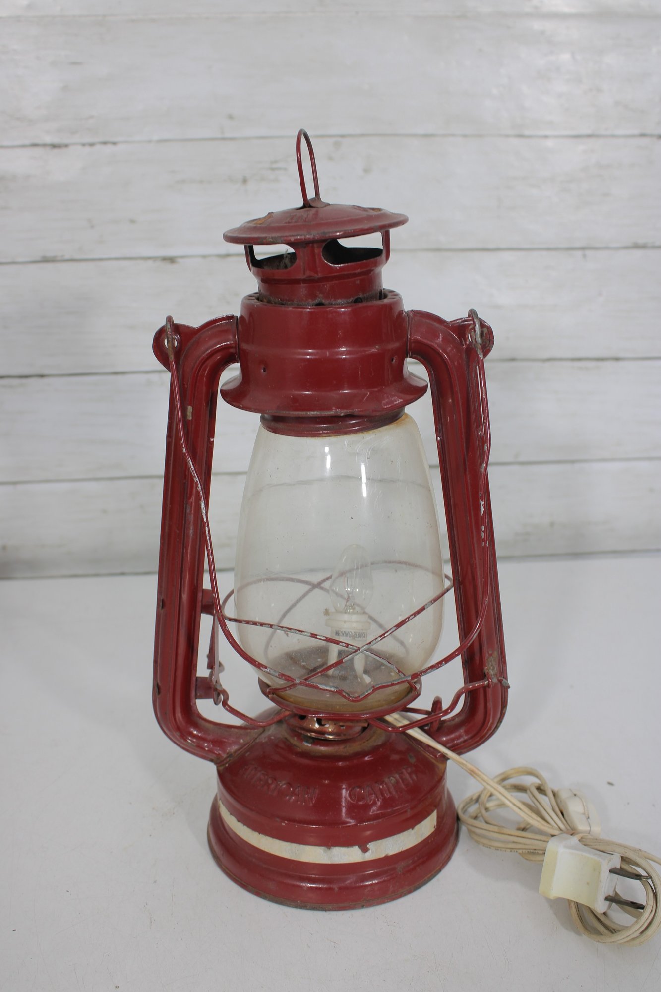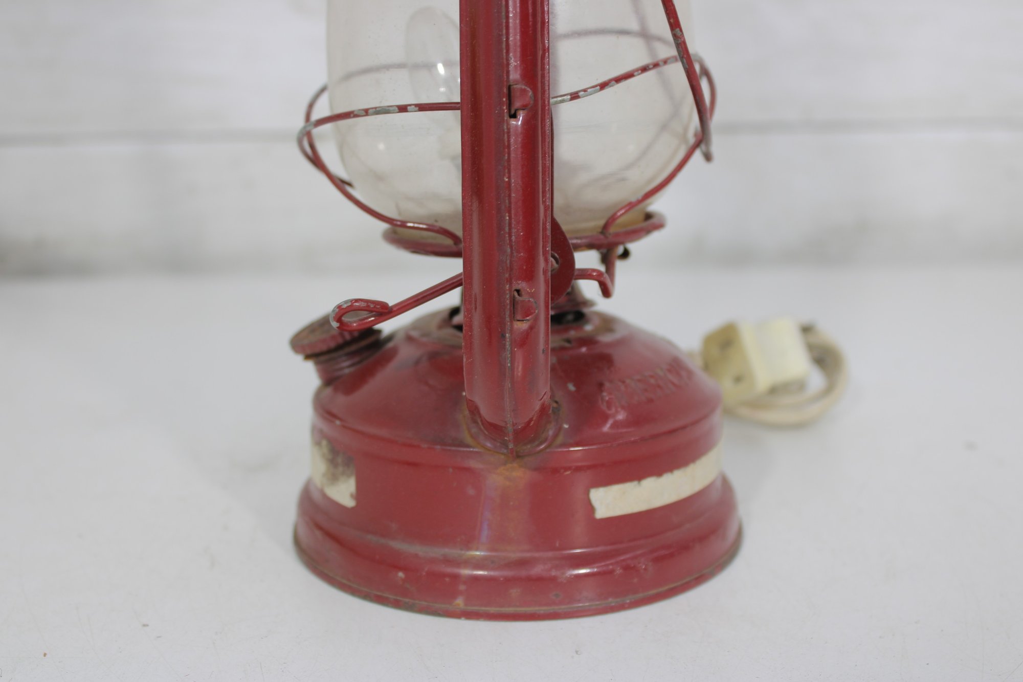 a charming vintage red electric hurricane-style lantern lamp standing approximately 12 inches tall.