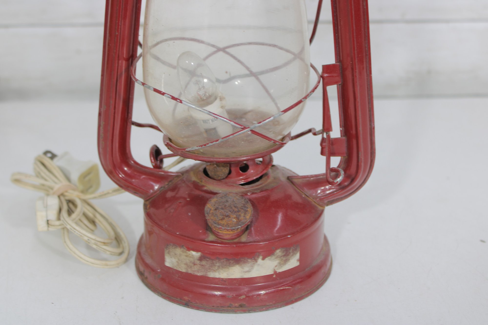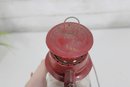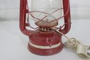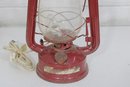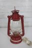 This decorative lantern features a classic oil-lamp design with a red painted metal body, clear glass globe, and protective wire guard. It has been converted to electric and includes a cord with plug. When lit, it gives off a warm, cozy glow reminiscent of traditional kerosene lanterns.