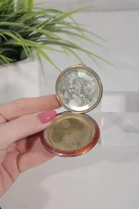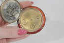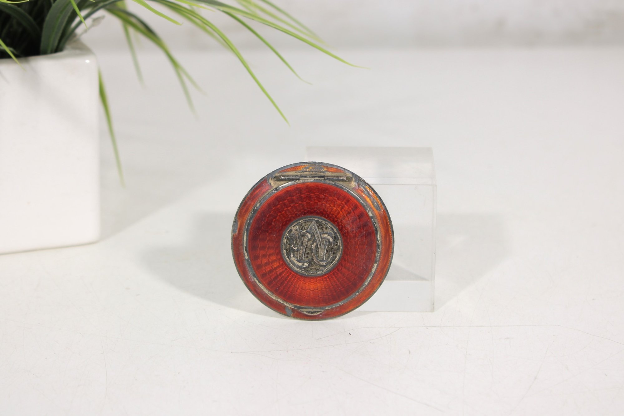 a beautiful vintage powder compact featuring a striking red guilloché enamel lid with a finely detailed engine-turned pattern. At the center is an ornate decorative metal medallion, adding an elegant focal point and enhancing the compact’s vintage character.