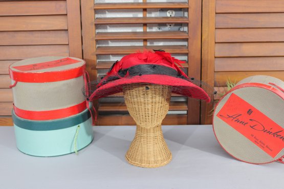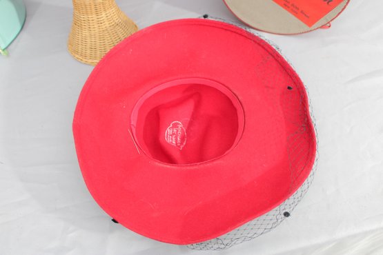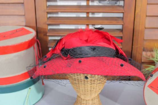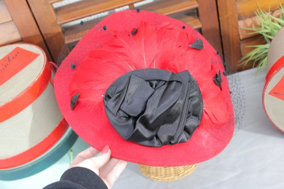 Bold and elegant vintage women’s dress hat featuring a striking wide-brim silhouette in vibrant red. This eye-catching piece is accented with black netting, a dramatic black bow, and fabric rosette details, creating a timeless and glamorous look.