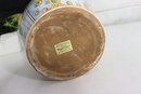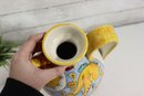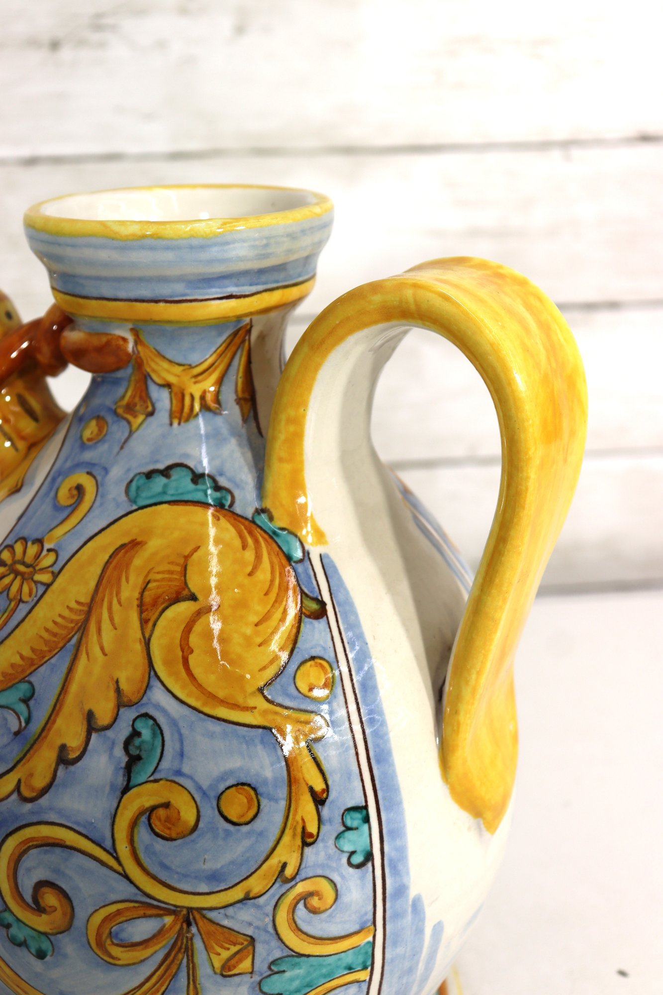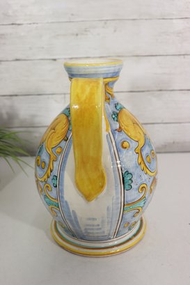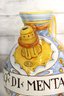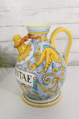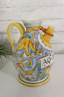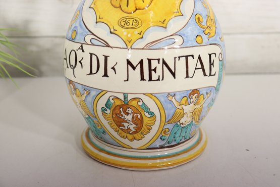 Beautiful vintage Italian Majolica apothecary style jug / vessel featuring bright hand painted decoration with blue, yellow, green and orange color palette. Decorated with cherubs, shields, scrolling florals and central banner script “AQ DI MENTAE”. Stunning detailed artwork with classic European pharmacy jar style spout, handle and shape.
