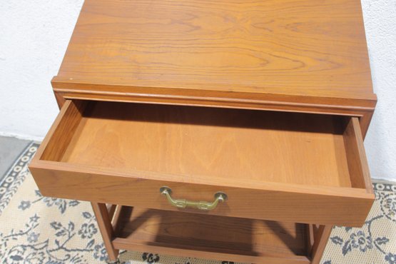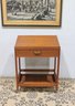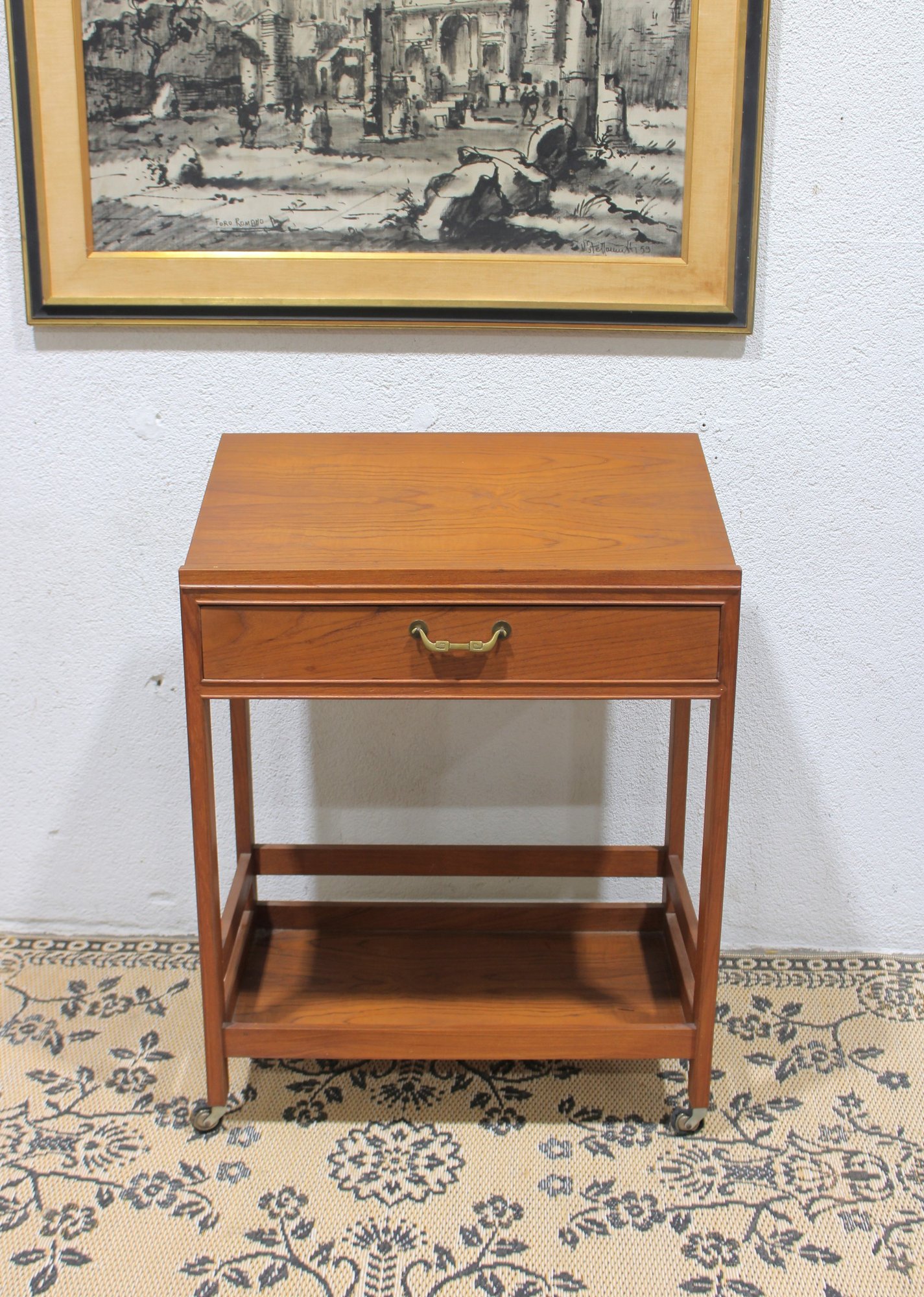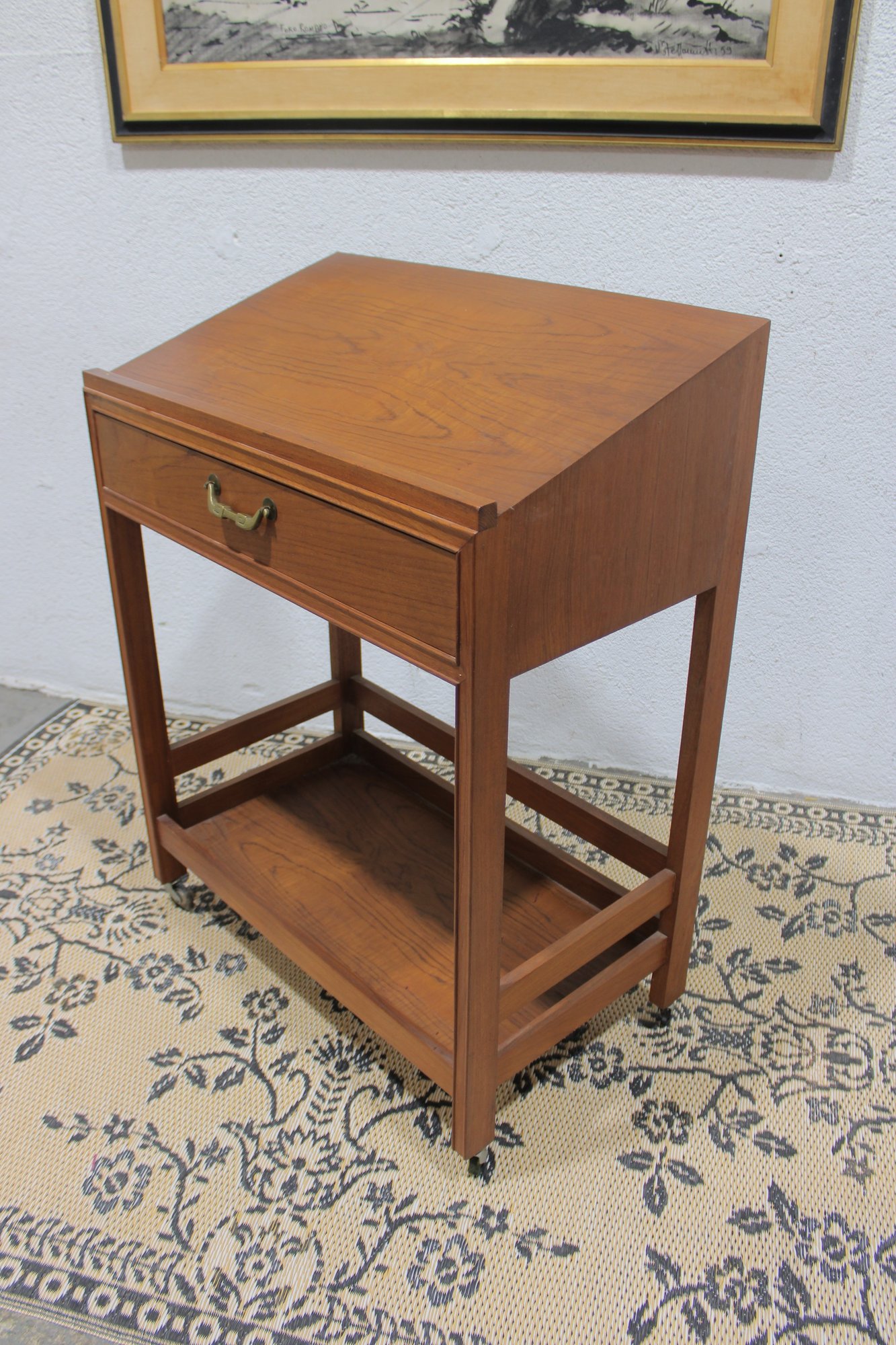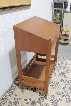 Vintage reading desk or writing desk featuring a simple and functional design with a single drawer and lower storage shelf. The desk is finished in a warm wood tone and includes brass drawer hardware and rolling casters, making it easy to move and reposition.
