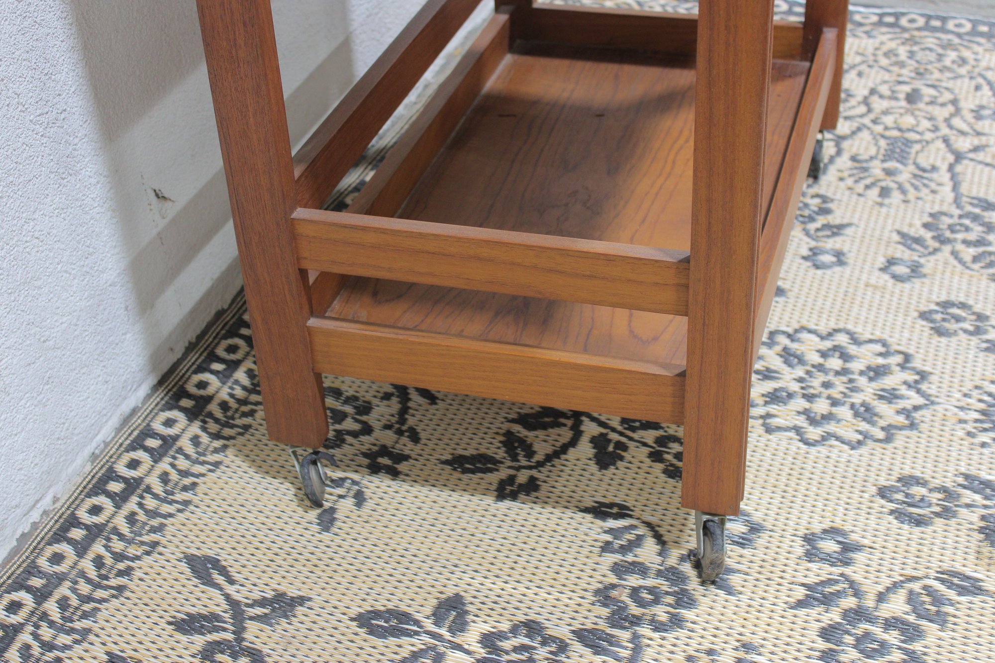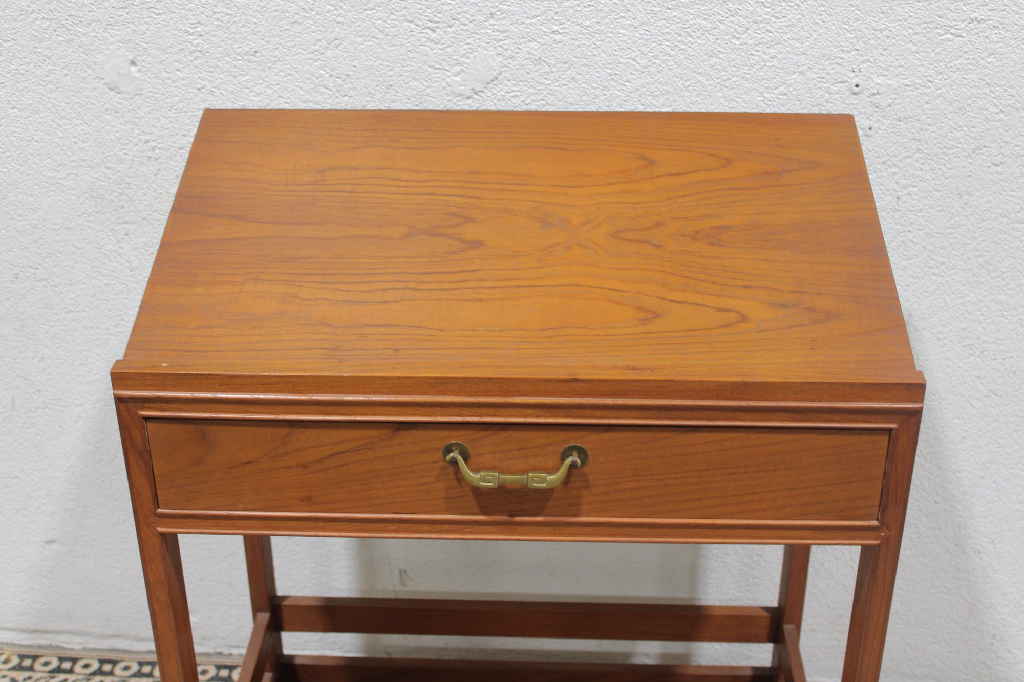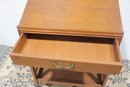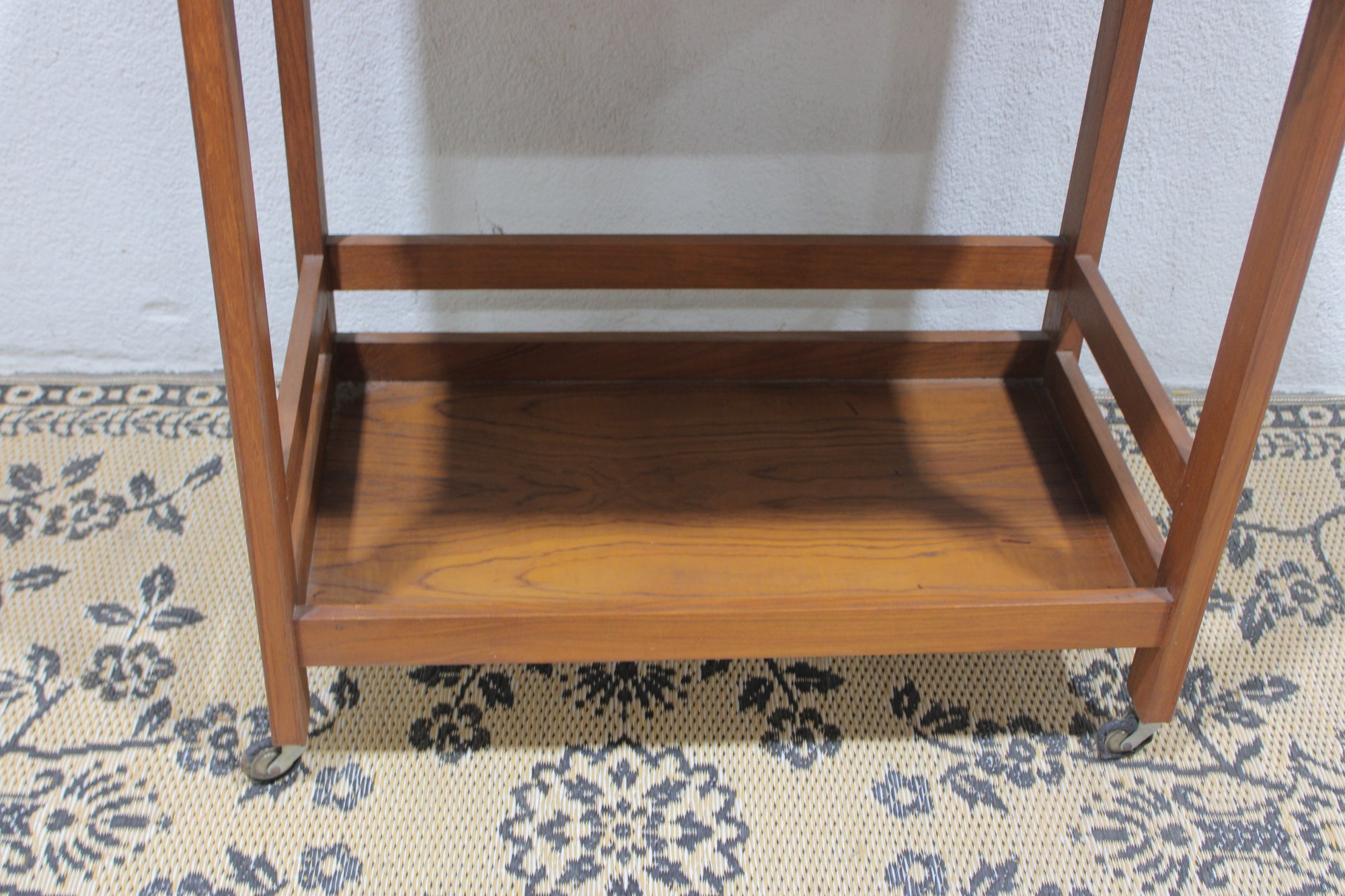Vintage reading desk or writing desk featuring a simple and functional design with a single drawer and lower storage shelf. The desk is finished in a warm wood tone and includes brass drawer hardware and rolling casters, making it easy to move and reposition.