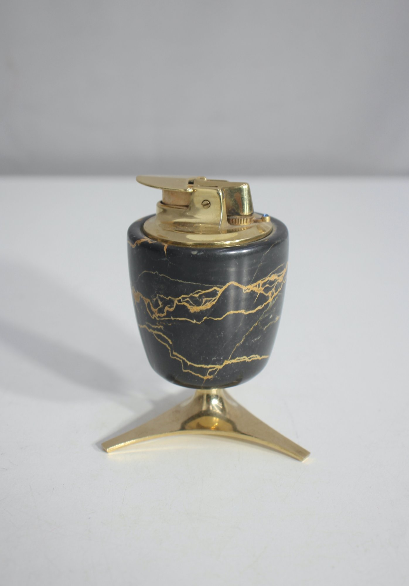 This listing features a classic vintage Ronson table lighter, crafted with a luxurious black marble base and gold accents. The lighter is elegantly designed, showcasing a sleek and timeless aesthetic, perfect for collectors or as a sophisticated decorative piece.