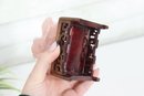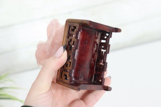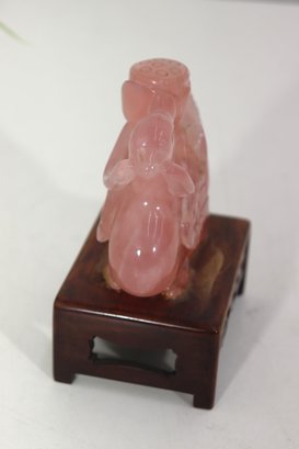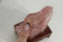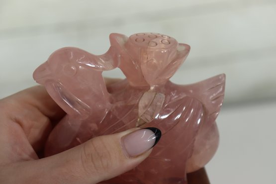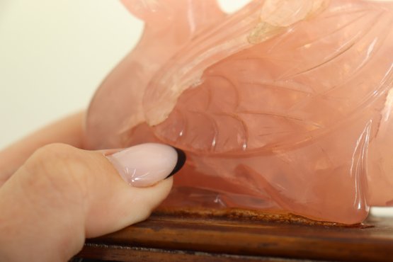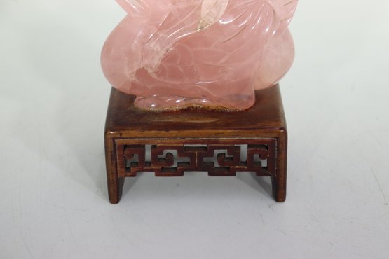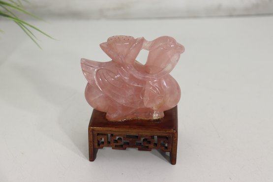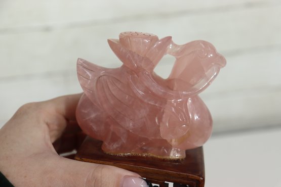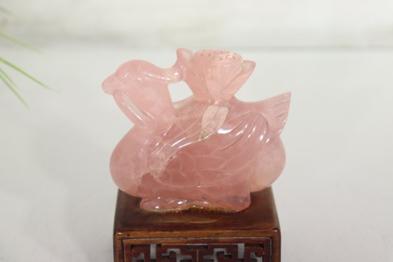 Beautiful vintage hand-carved rose quartz figurine depicting a graceful duck holding a lotus blossom, displayed on an elegant carved wooden stand. The soft pink stone exhibits natural translucency and subtle veining, highlighting the skilled craftsmanship of this detailed carving.