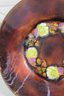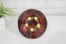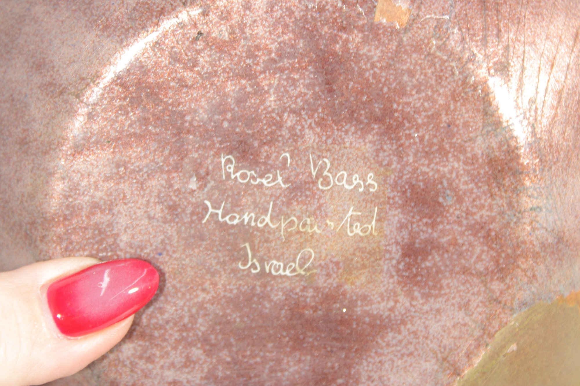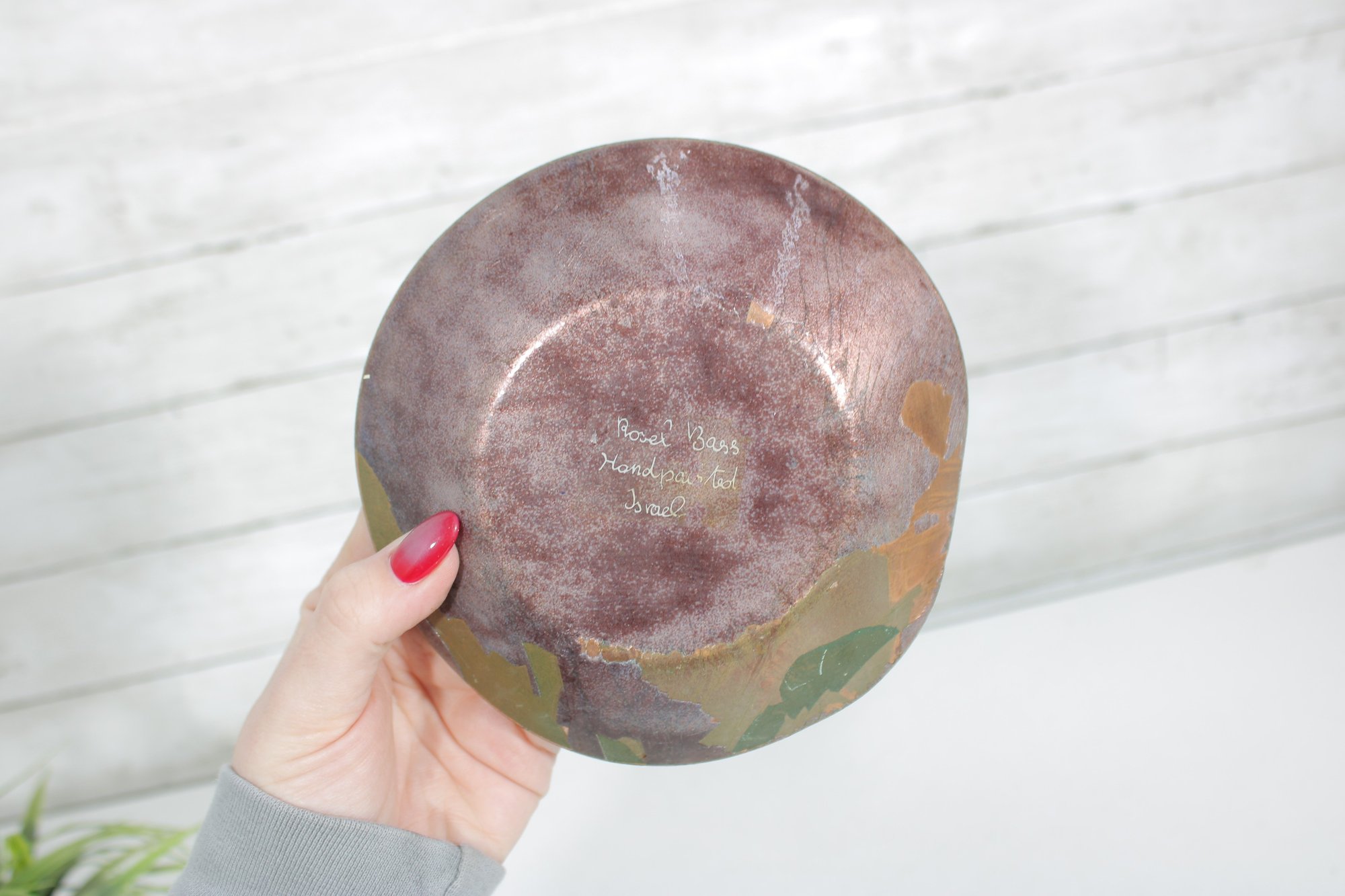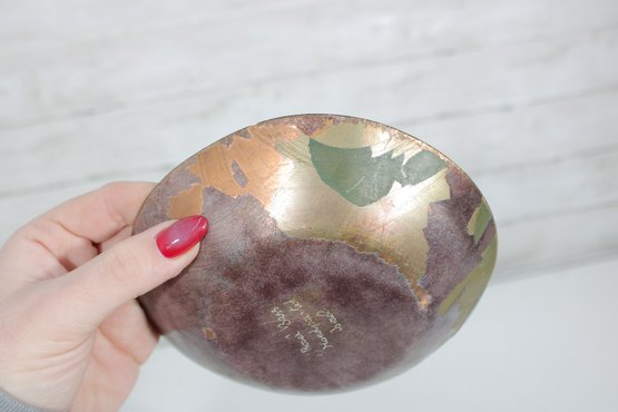 Beautiful vintage enamel on copper bowl by Rosel Bass, hand-painted and signed on the underside “Rosel Bass Handpainted Israel.” This striking 6” bowl features a rich, deep brown enamel exterior with a warm, organic finish, while the interior showcases a vibrant circular motif with abstract floral elements in yellow, green, and subtle pink tones.