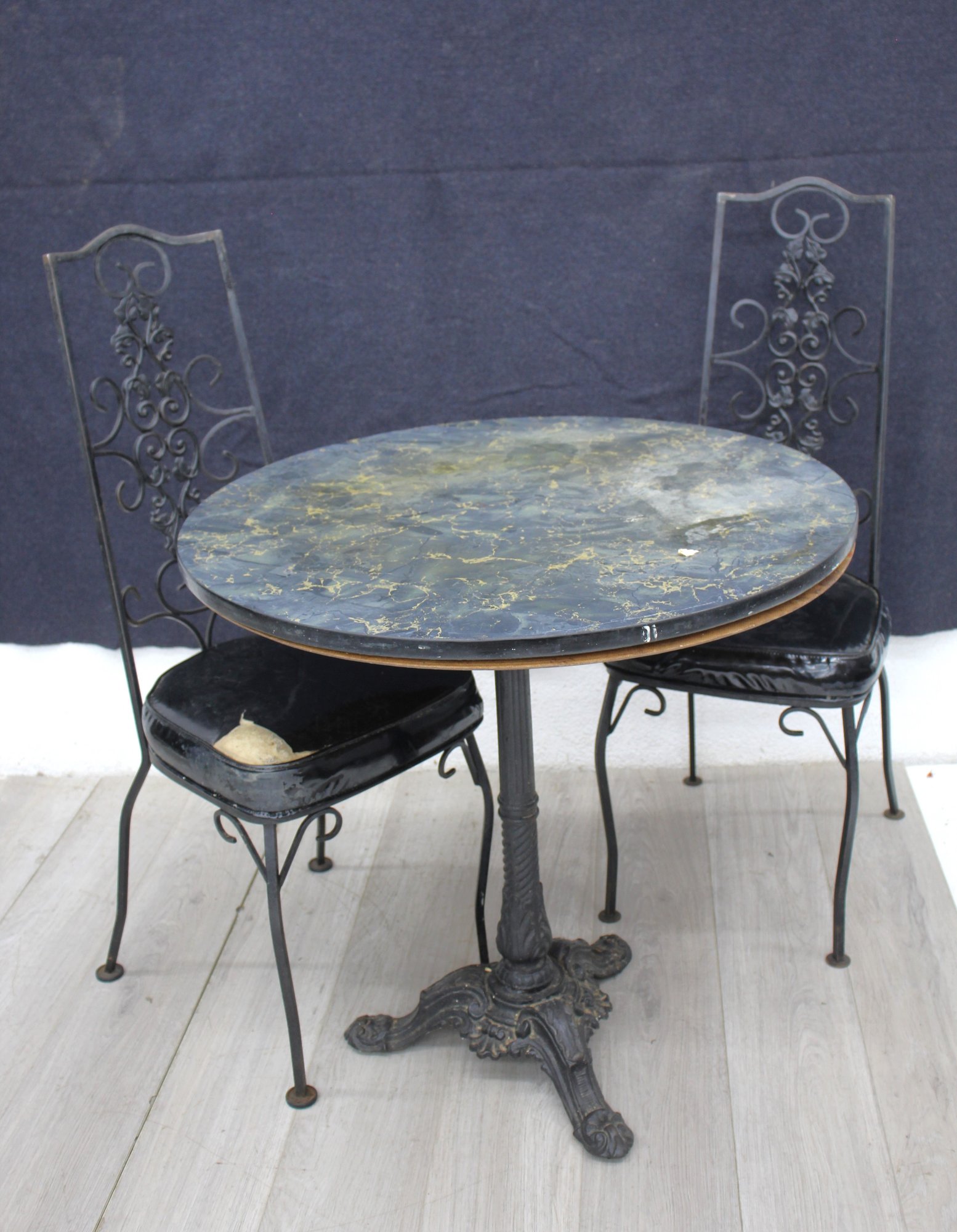 Vintage Round Bistro Table Set With Two Ornate Black Iron Chairs