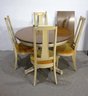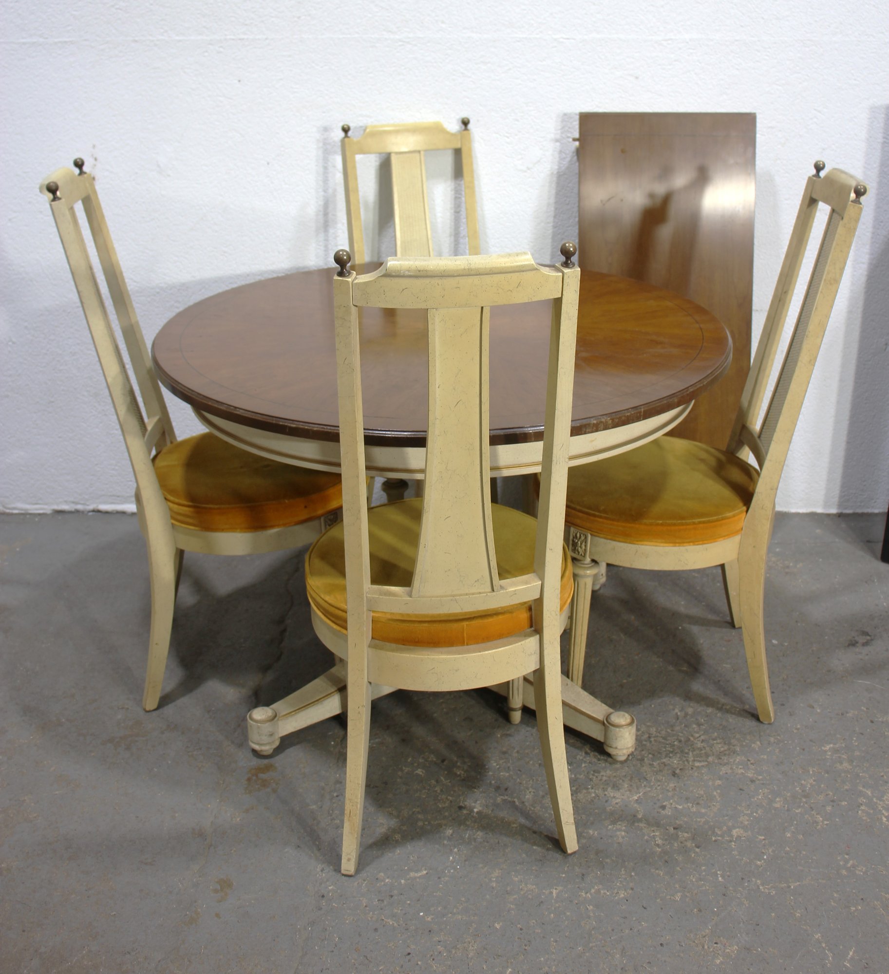 a stunning vintage round dining table set, featuring a rich wood grain tabletop, cream-colored pedestal base, and four matching chairs with gold velvet upholstery. This elegant set combines mid-century style with classic sophistication, making it ideal for dining rooms, breakfast nooks, or formal spaces.