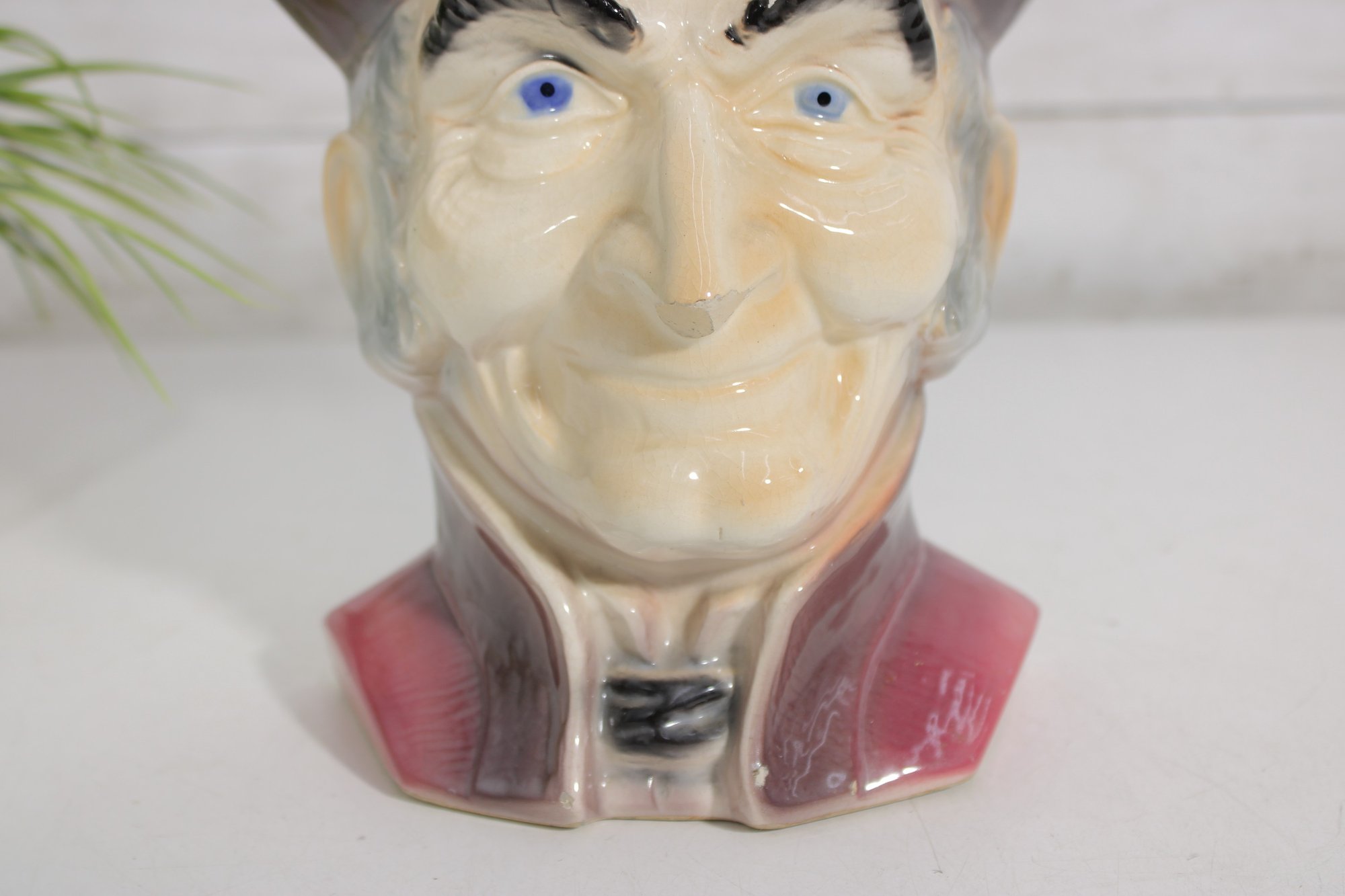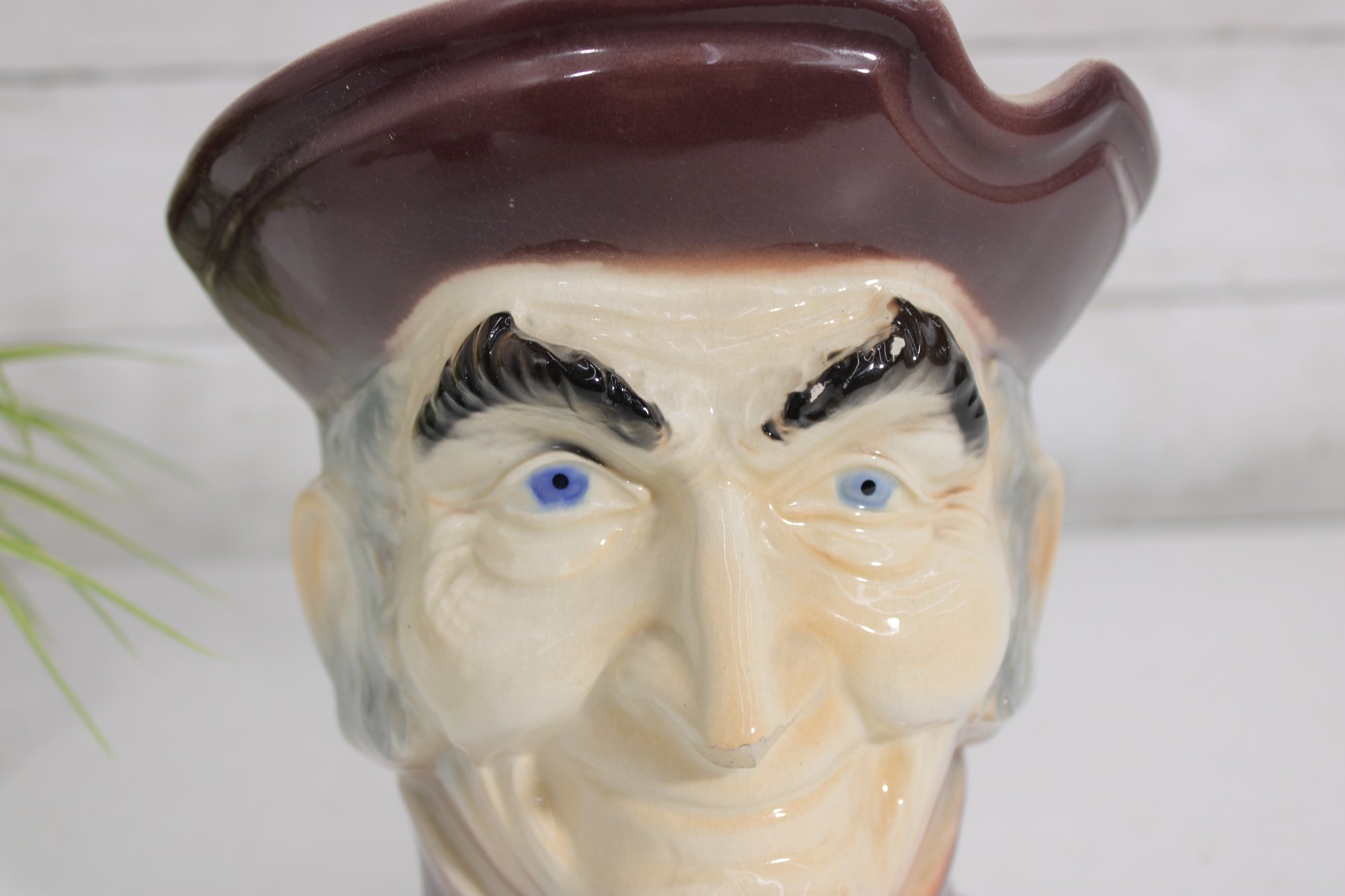The figure is beautifully detailed with expressive facial features, blue eyes, and a traditional colonial hat and attire. The glossy glaze and hand-painted accents give it a distinctive mid-century decorative appeal.