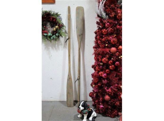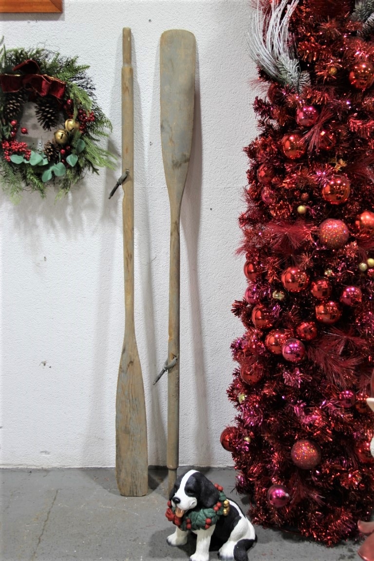 Vintage Rustic Long Wooden Oars With Metal Oarlocks